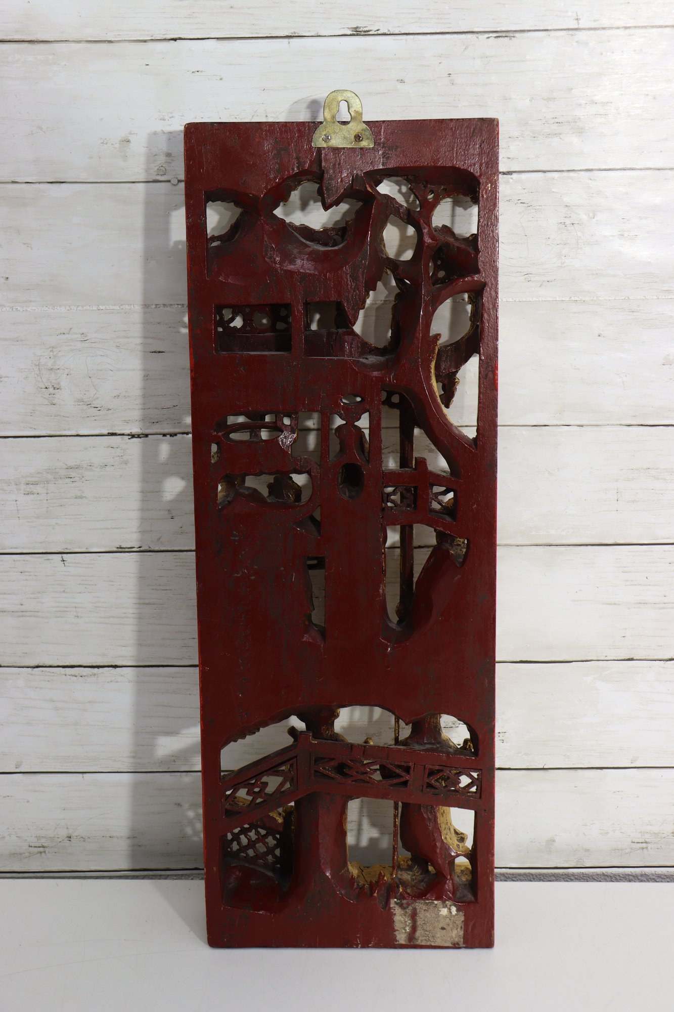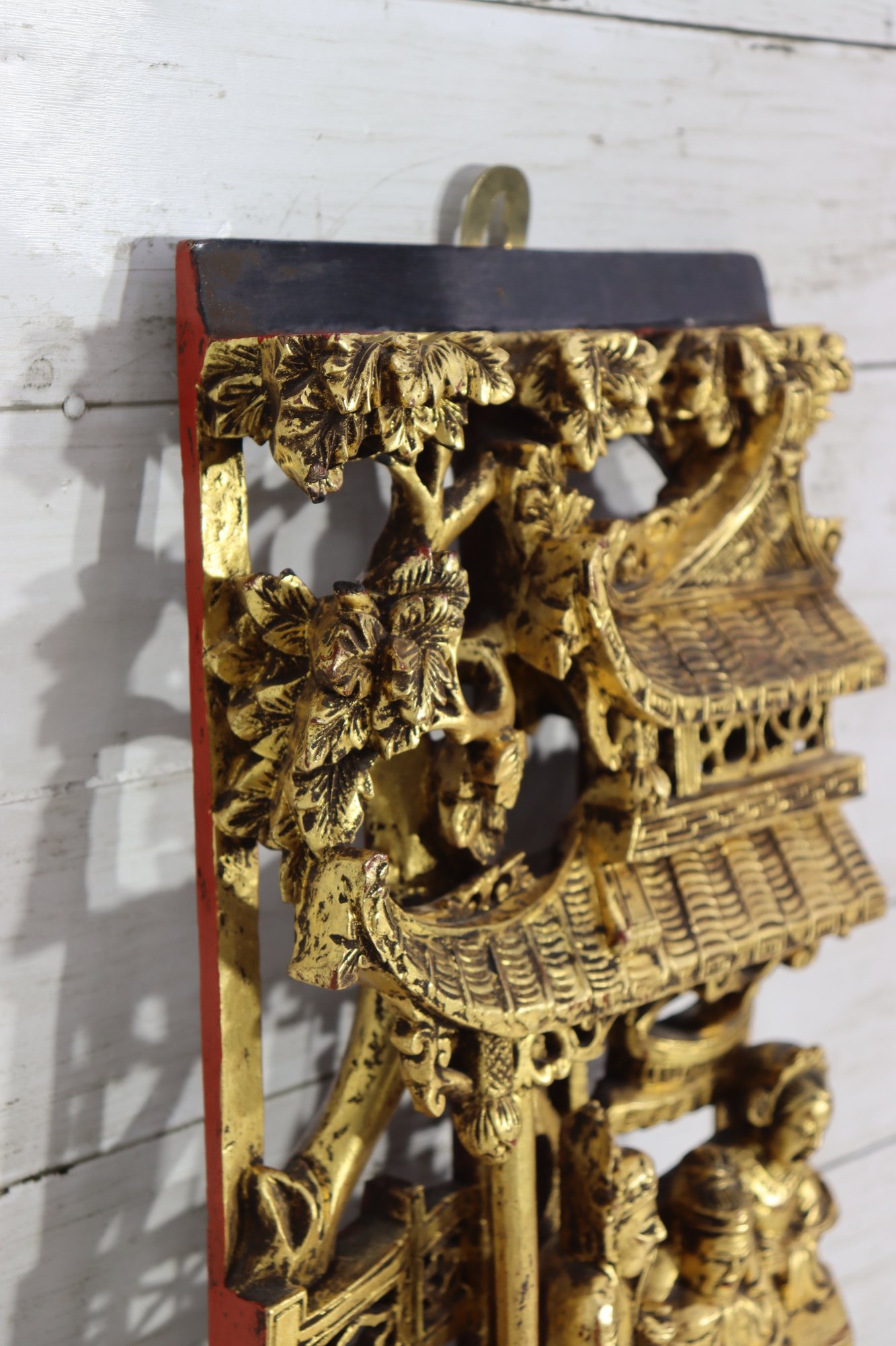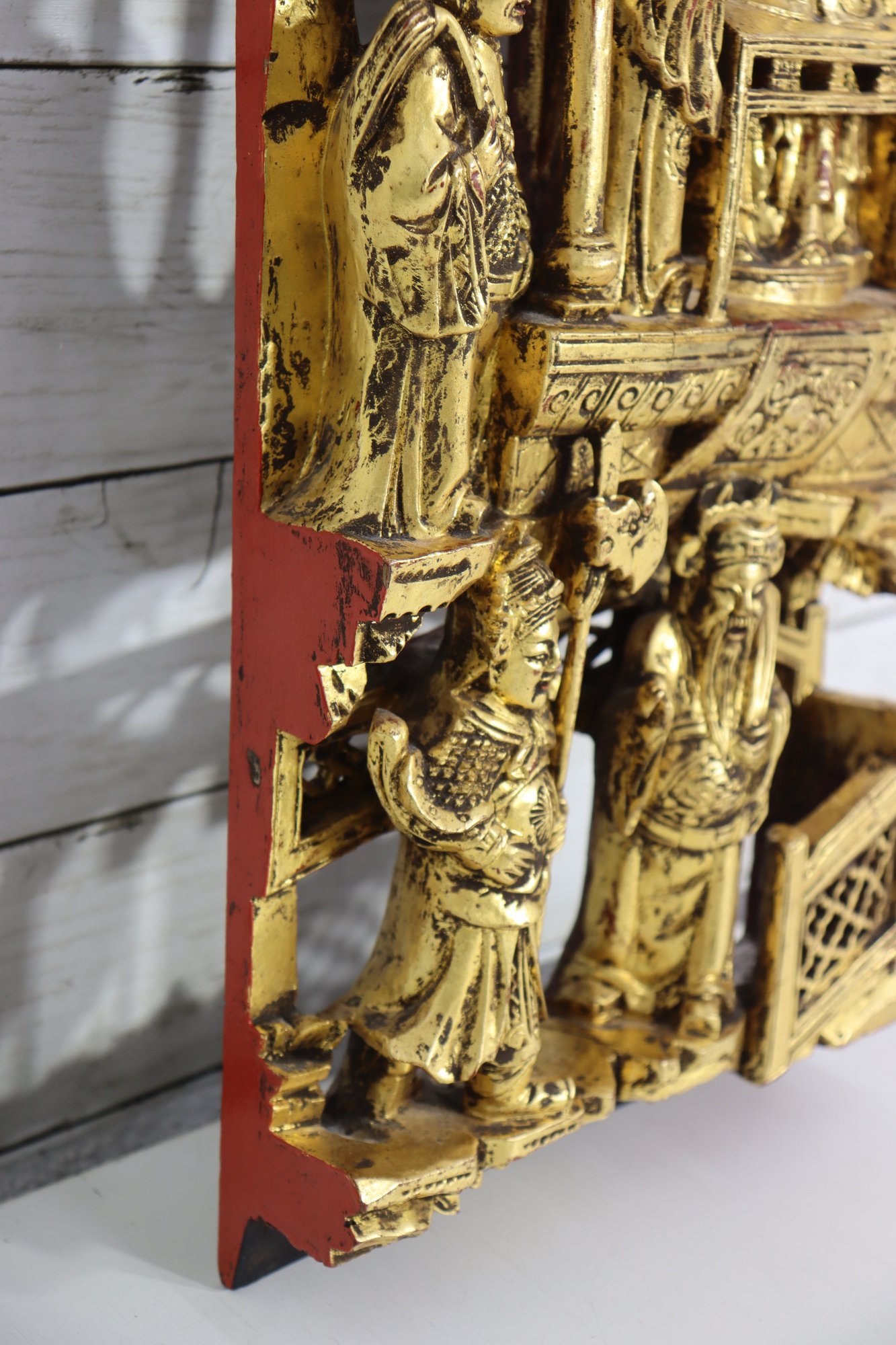 Beautiful antique Chinese carved wood panel featuring an intricate high relief scene with figures, pagoda style structure, tree and decorative motifs. This panel is heavily gilded with red lacquer beneath, creating a striking contrast where age wear shows through. The carving is highly detailed with layered depth and traditional Chinese storytelling imagery often found in old architectural elements, altar carvings, or furniture fragments.