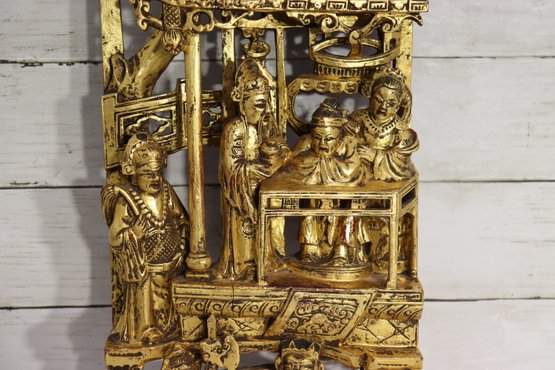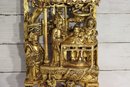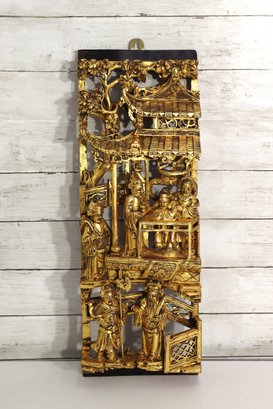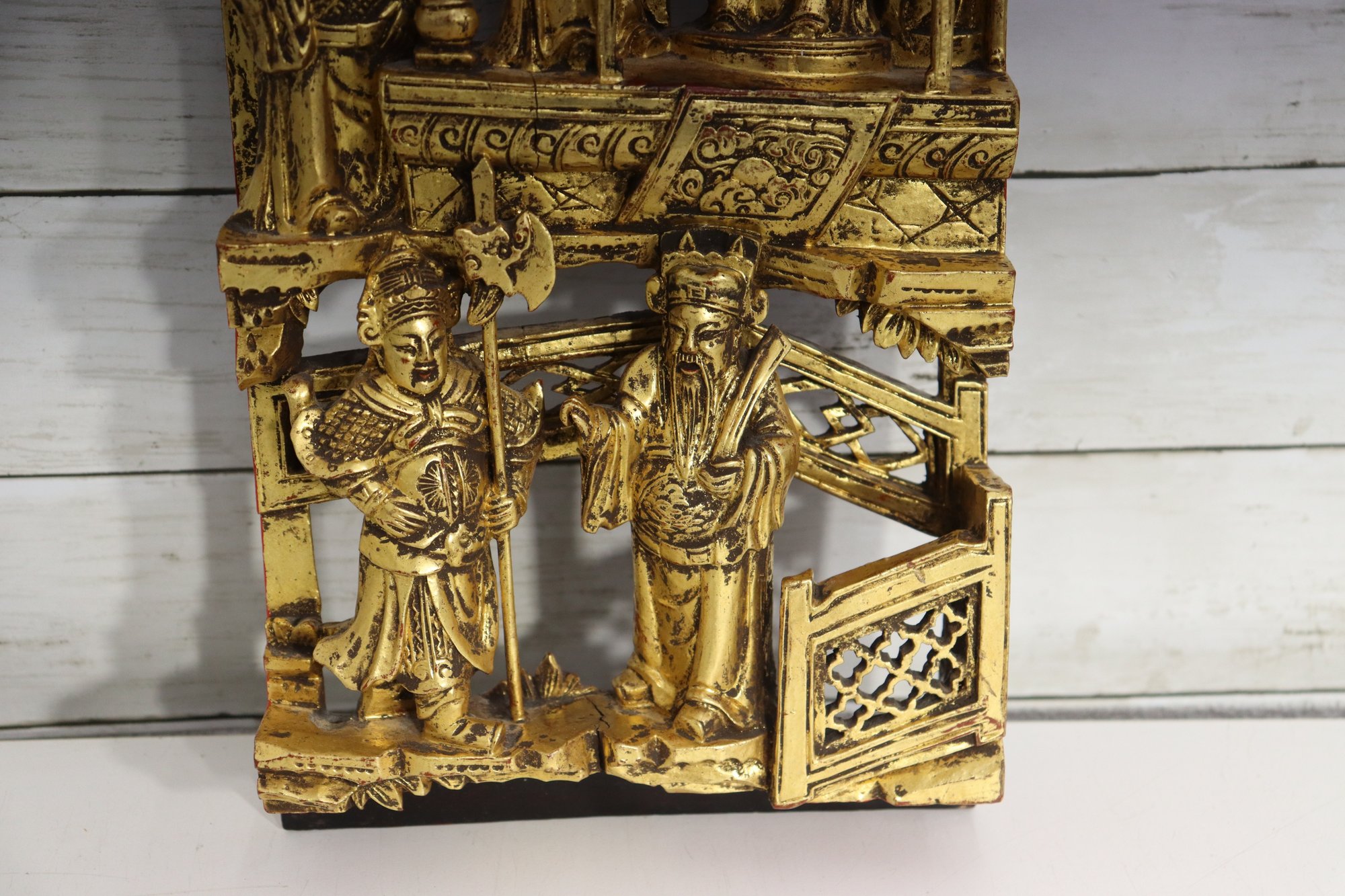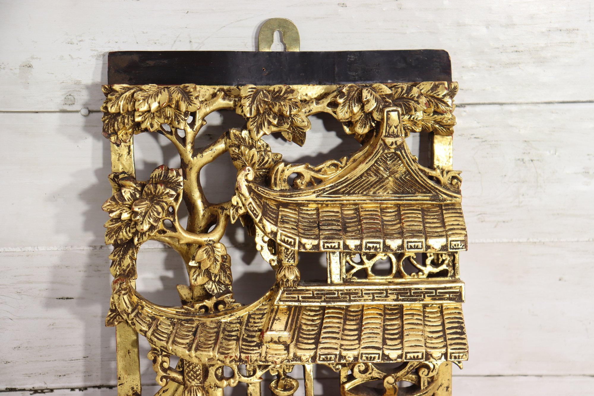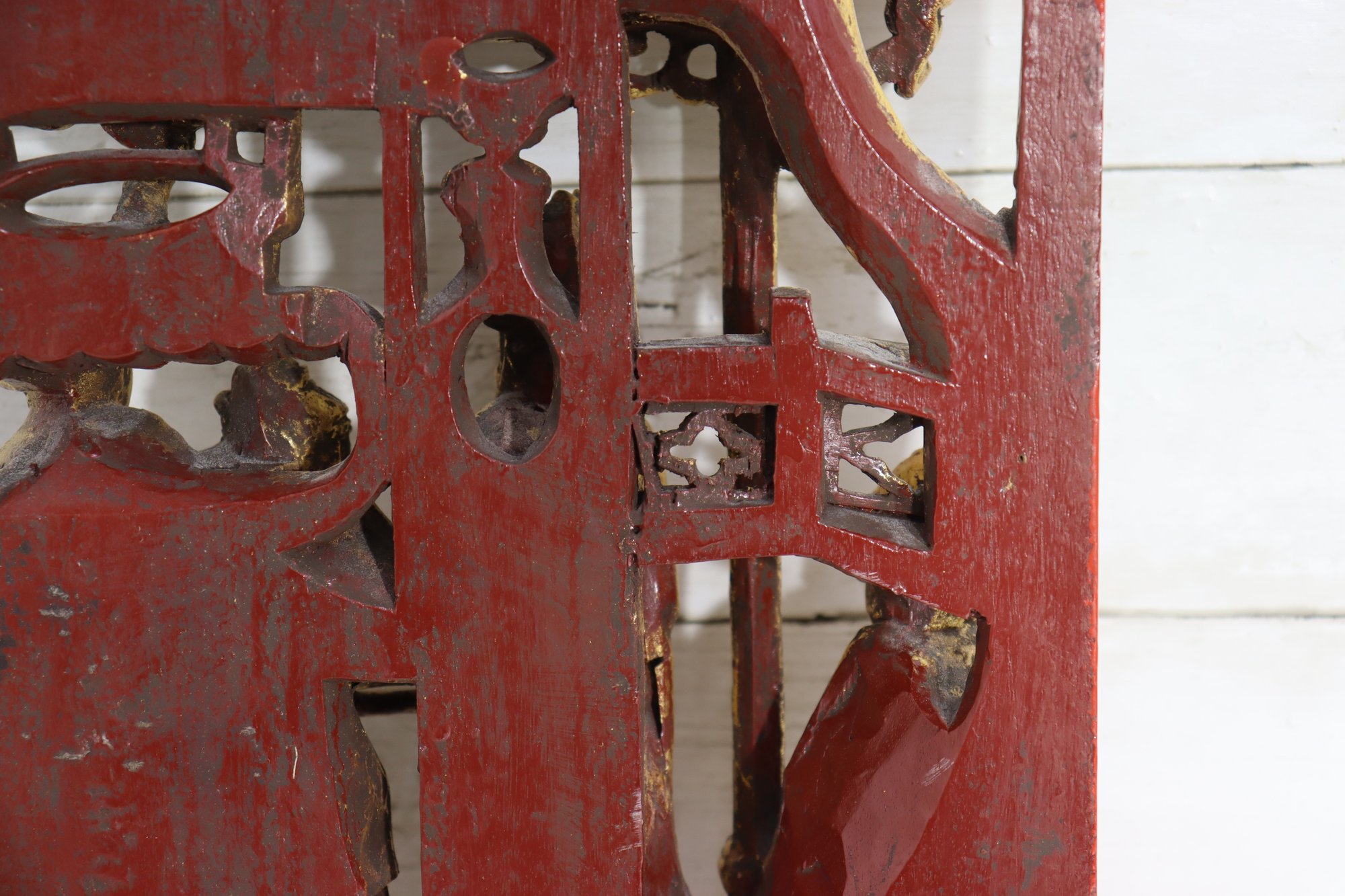 Beautiful antique Chinese carved wood panel featuring an intricate high relief scene with figures, pagoda style structure, tree and decorative motifs. This panel is heavily gilded with red lacquer beneath, creating a striking contrast where age wear shows through. The carving is highly detailed with layered depth and traditional Chinese storytelling imagery often found in old architectural elements, altar carvings, or furniture fragments.