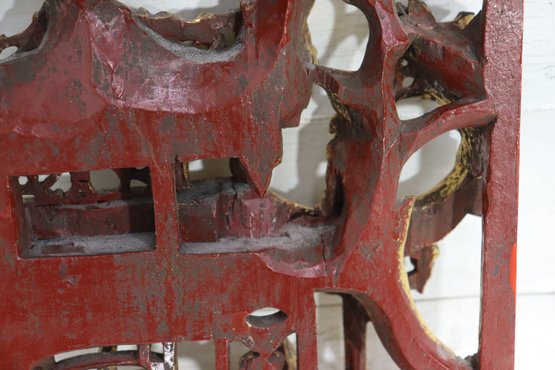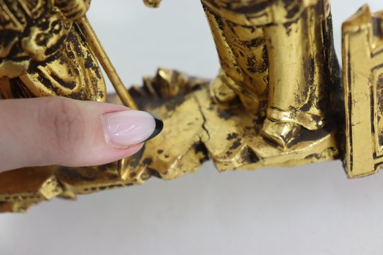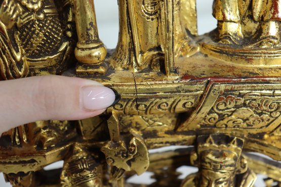 Antique age wear present including cracks, losses to gilt and wood in some areas, and edge wear. Red lacquer exposed in areas as shown. Please see all photos for details.