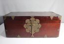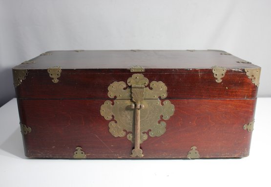 This auction features a beautifully crafted antique Chinese wooden chest, adorned with ornate brass hardware. The intricate brass detailing, including a central latch and corner protectors, adds a sophisticated touch to the rich wood grain. Inside, the chest is lined with yellow fabric featuring traditional Chinese script, making it both functional and decorative.
