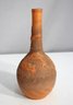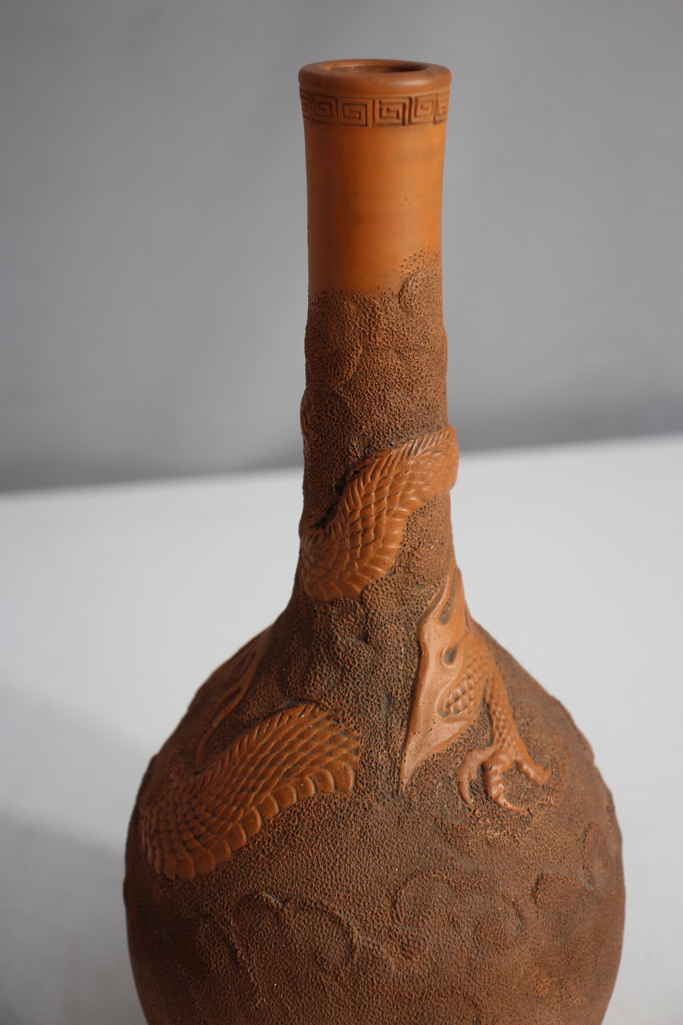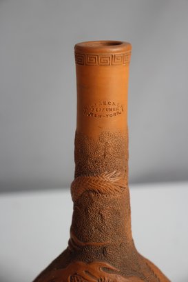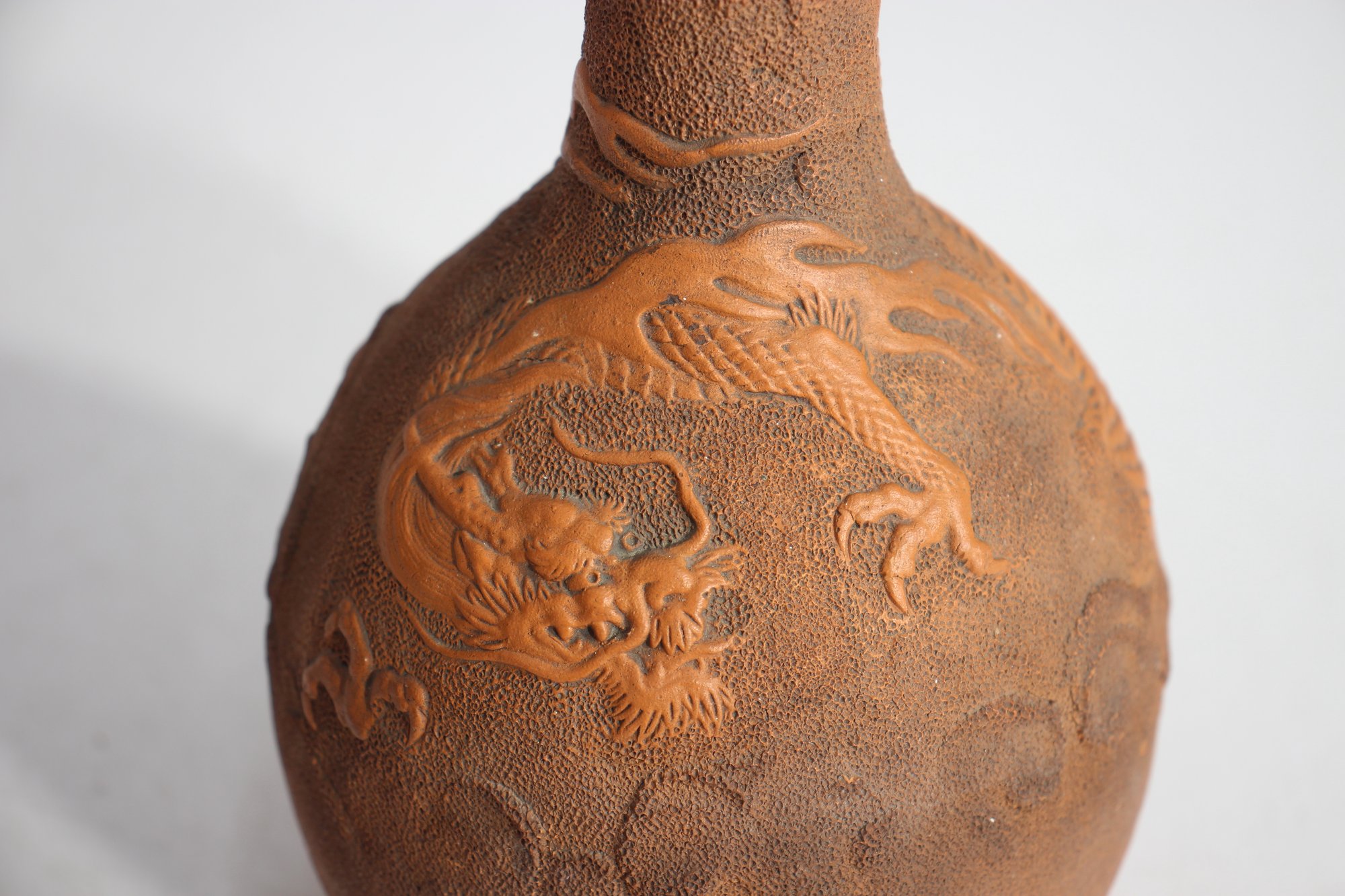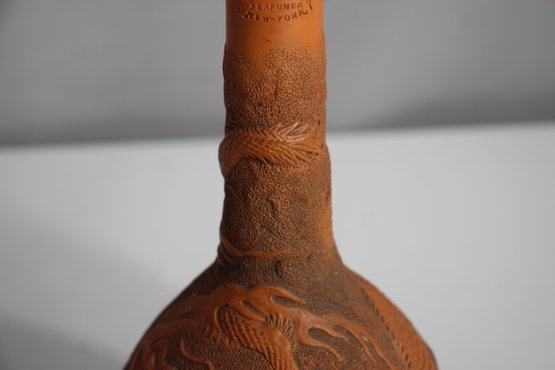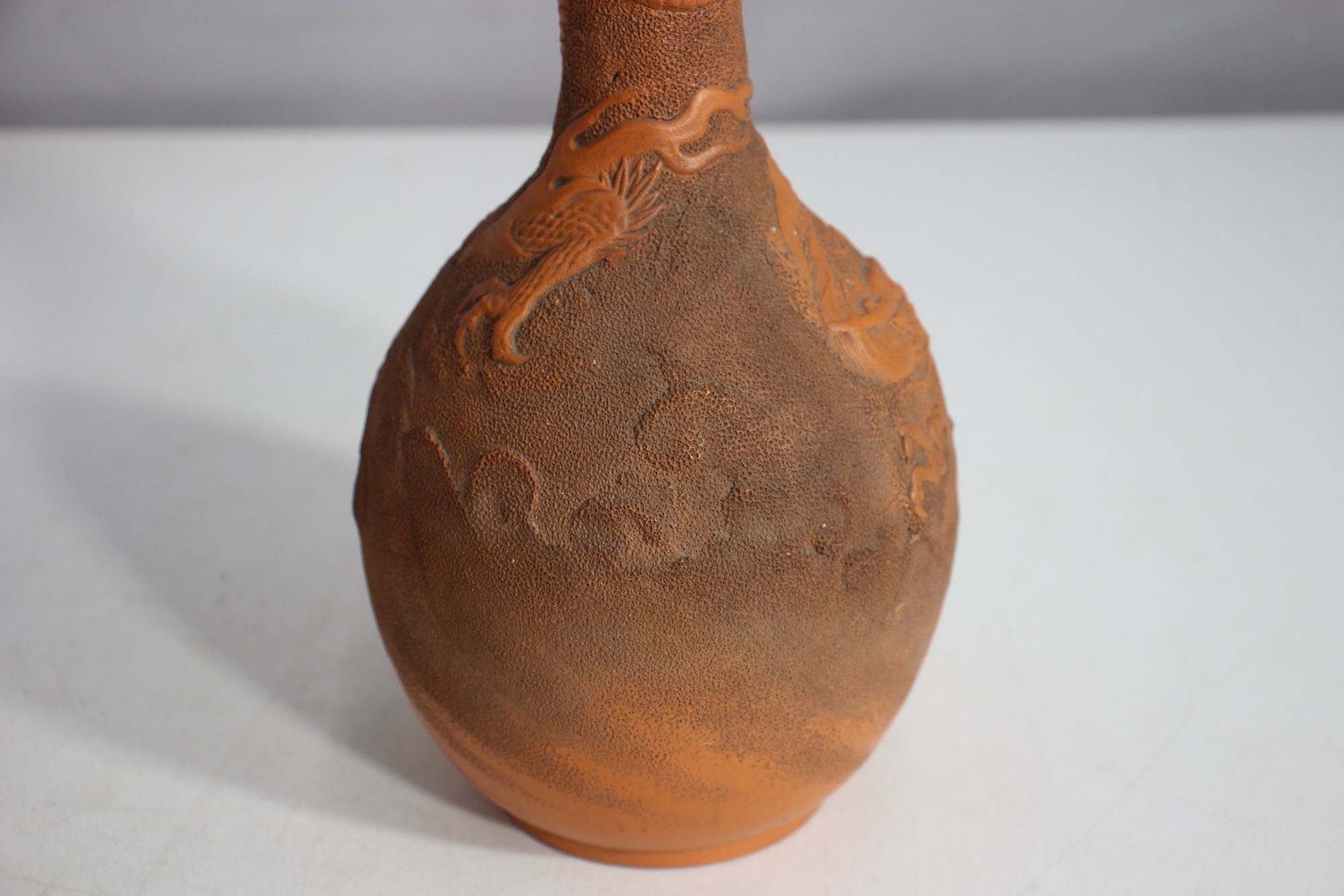 Antique Chinese Yixing Clay Bottle Vase, standing 11 inches tall. This beautifully crafted unglazed terracotta vase features an intricate raised relief design of a dragon, symbolizing power and good fortune in Chinese culture.
