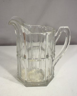 a stunning antique clear glass water pitcher, measuring 9 inches tall. This elegant pitcher features a hexagonal base with a beautiful starburst pattern at the bottom, a gracefully curved handle, and a classic ribbed panel design. The spout is smoothly curved for easy pouring, making it both a functional and decorative piece.
