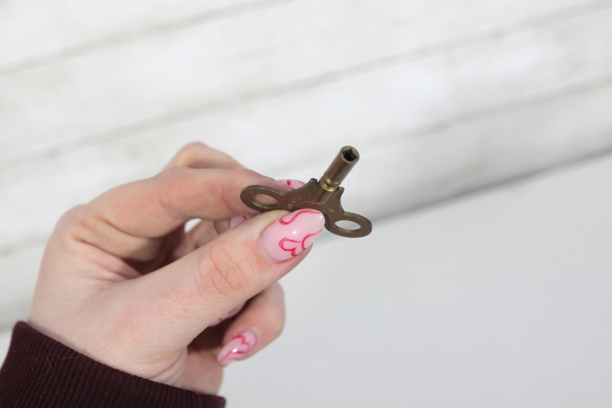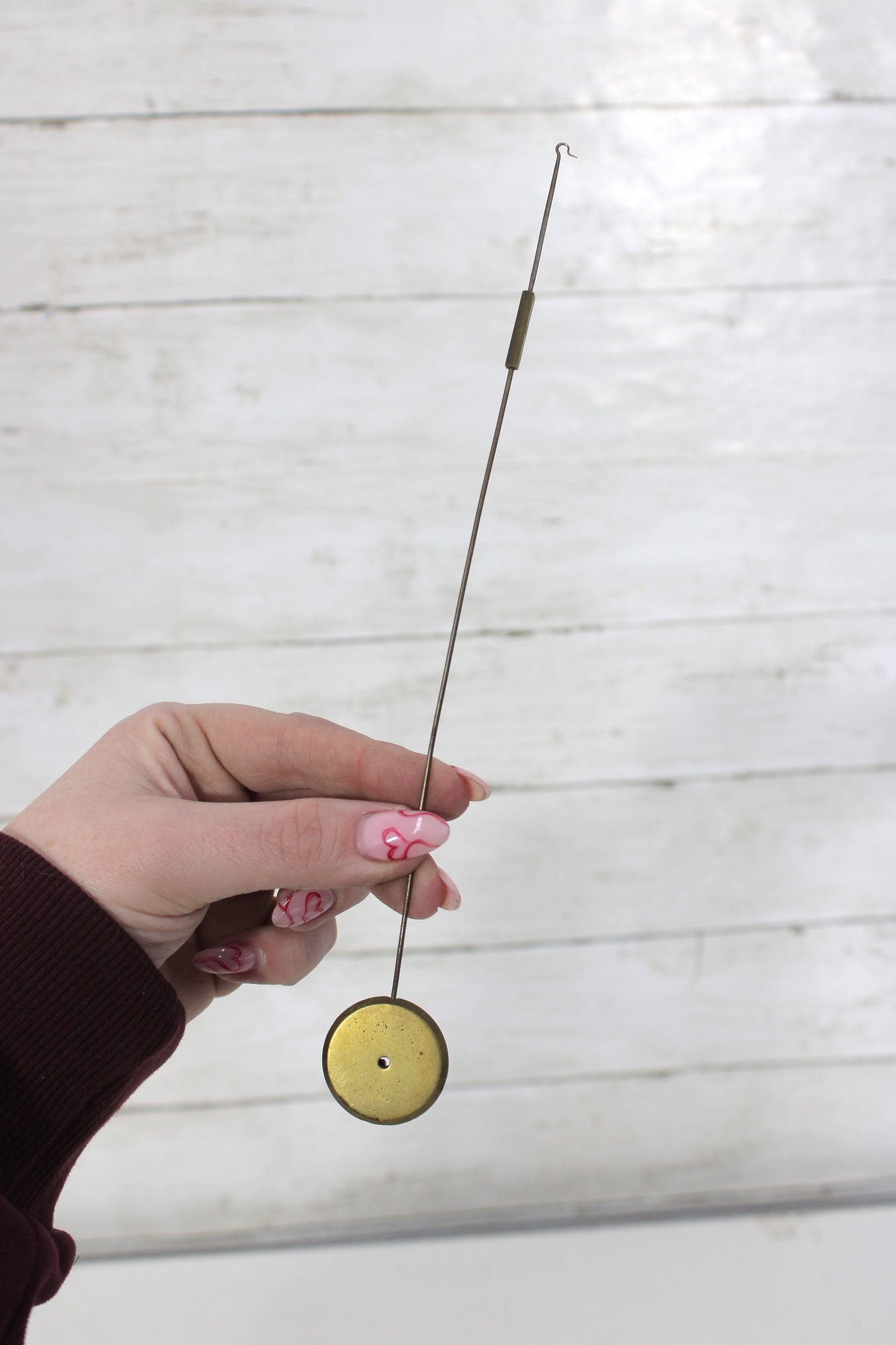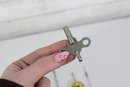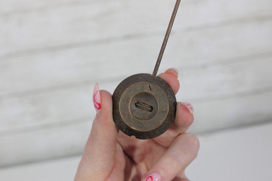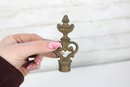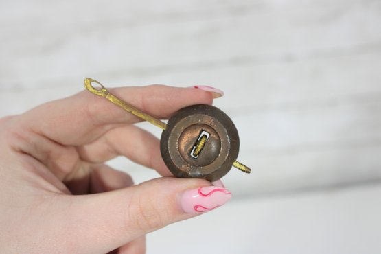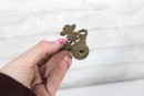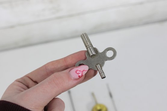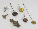 Assorted lot of antique clock parts including pendulums, winding keys, and decorative brass hardware components. This mixed group features several pendulum bobs with rods, clock keys in varying styles, and ornate metal fittings that may have originated from mantel or wall clocks.