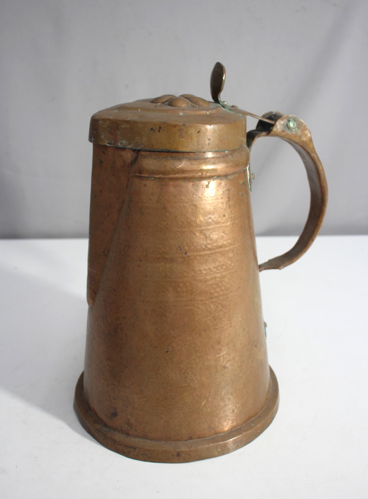 This auction features a beautiful antique copper tankard, standing 12.5 inches tall. This piece boasts a traditional tapered design, a hinged lid with a floral motif, and a sturdy handle, reflecting its vintage charm and functional craftsmanship.