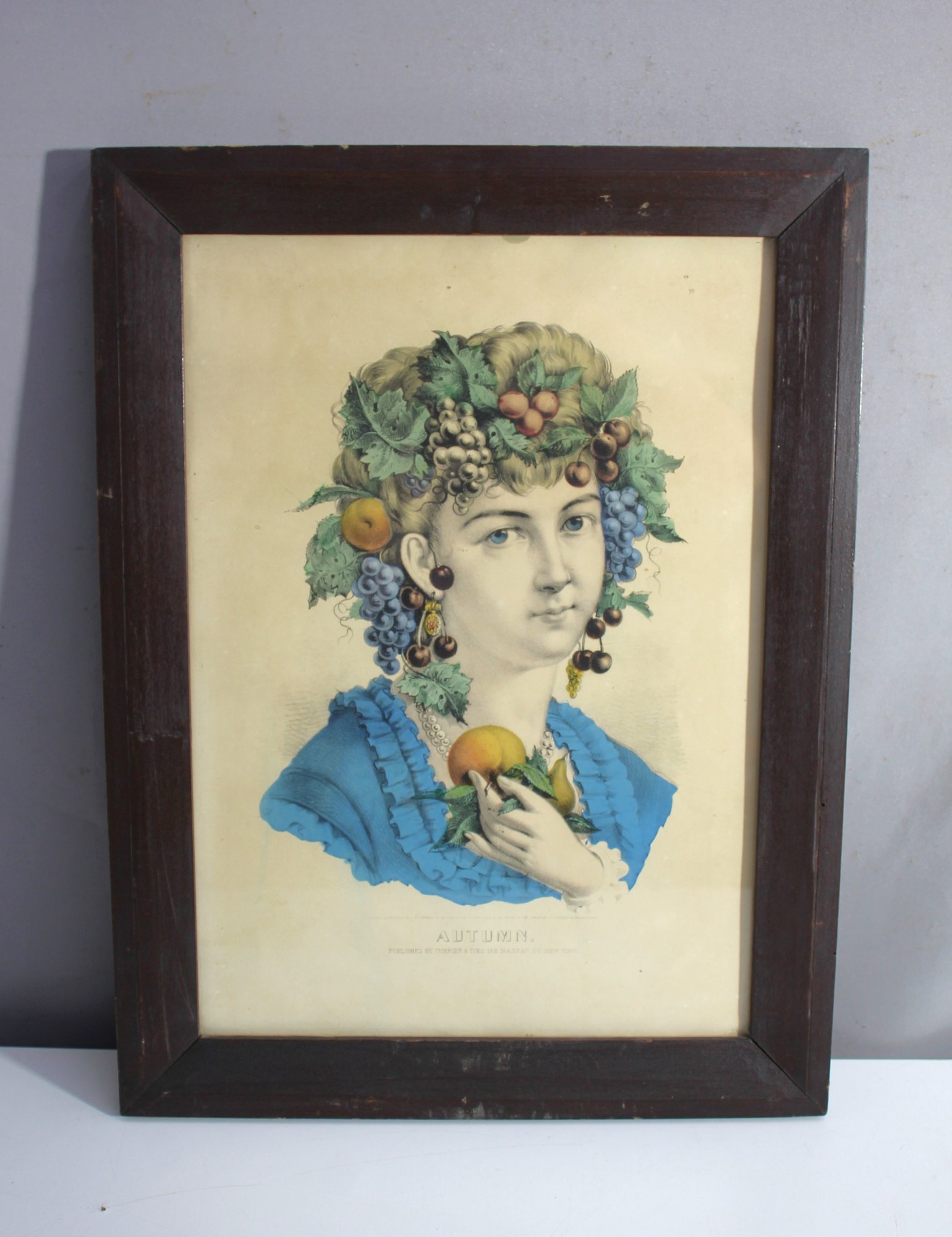 Beautifully framed Currier & Ives lithograph titled "Autumn." This charming piece features a portrait of a woman adorned with seasonal fruits and foliage, representing autumn's bounty. Published by Currier & Ives, 152 Nassau St, New York, this classic American artwork captures the essence of the season in soft, vintage colors. The frame shows some signs of wear, consistent with its age, enhancing its antique character. A wonderful piece for collectors or anyone looking to add a touch of historical art to their space.