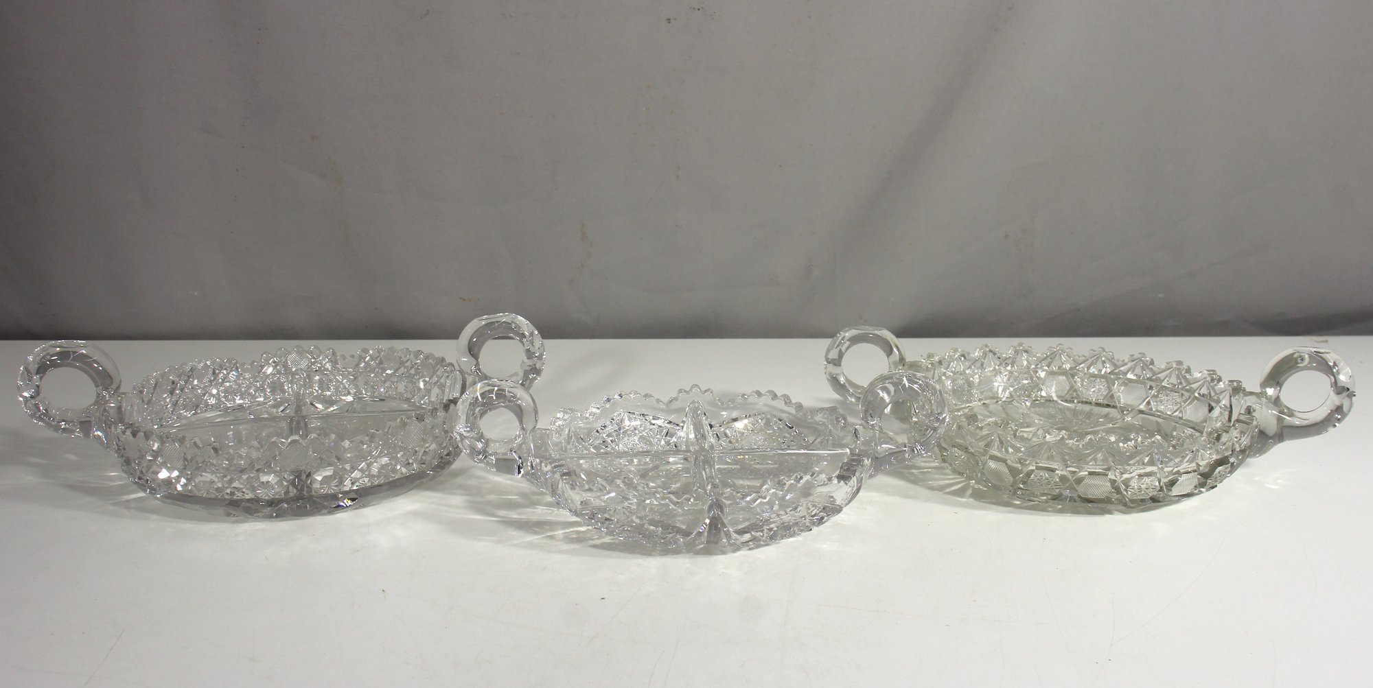 set of three antique cut glass handled serving bowls, each measuring approximately 8" in diameter. These exquisite pieces showcase an intricate geometric and starburst pattern with sharply cut details that reflect light beautifully. Each bowl features elegantly curved handles and a delicately scalloped rim, adding to their timeless charm.