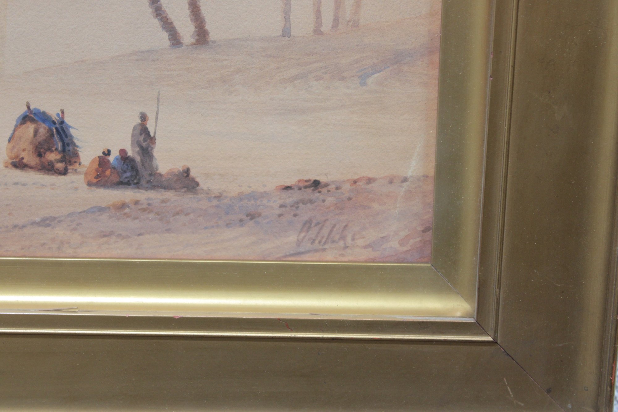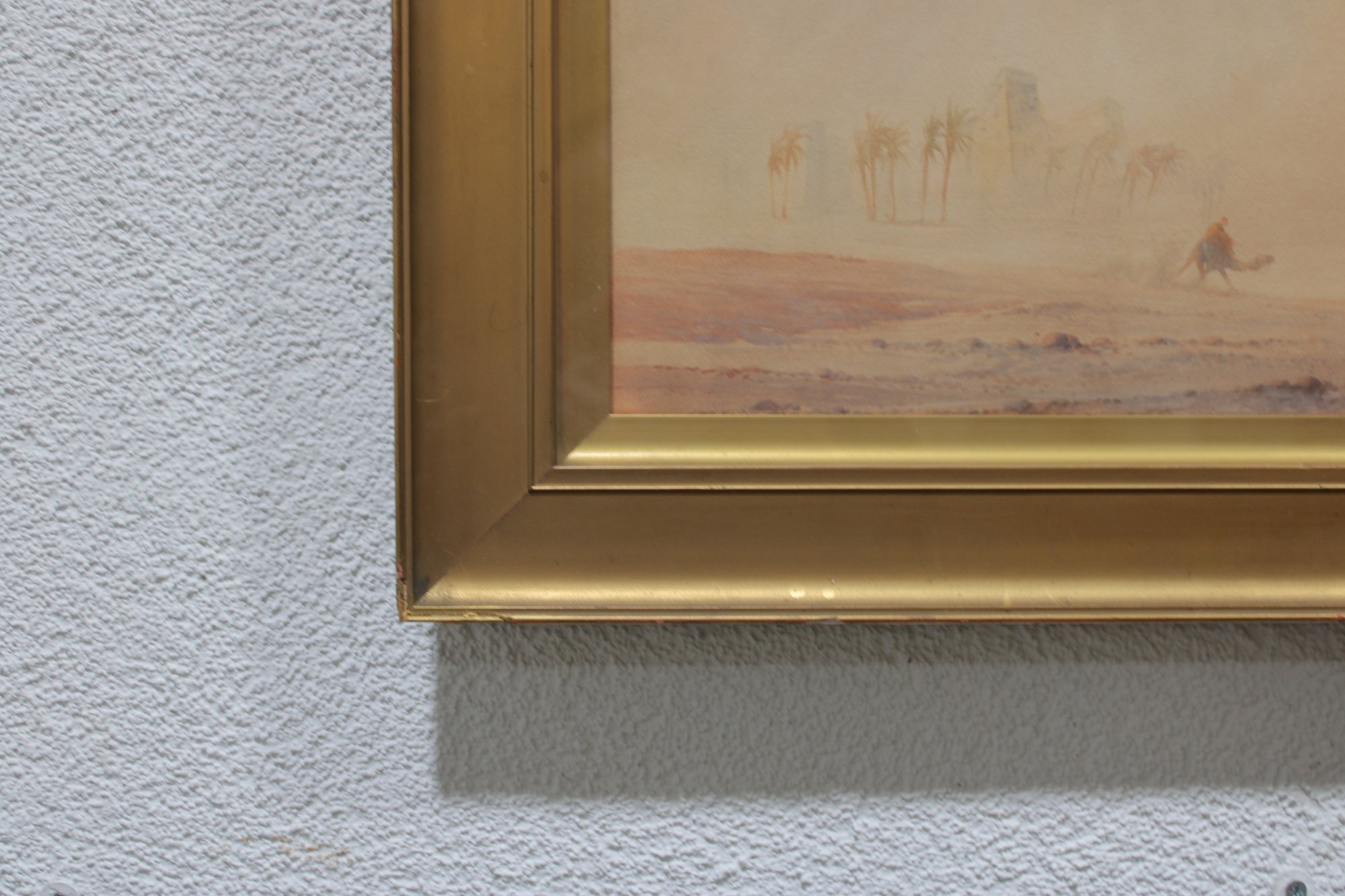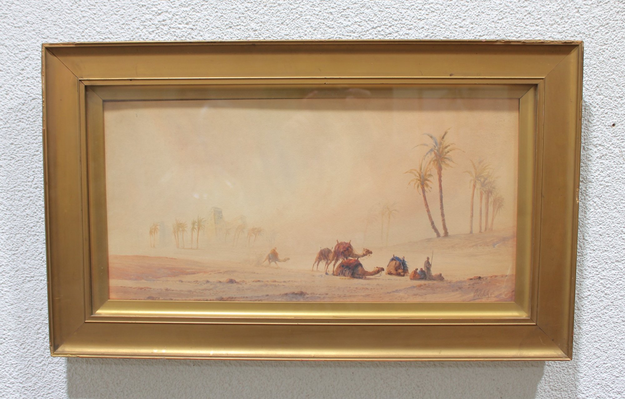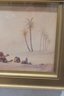 This evocative antique watercolor depicts a serene desert caravan scene, featuring resting figures and camels beneath softly rendered palm trees, all set against a warm, atmospheric landscape. The artist’s delicate use of muted earth tones and gentle washes creates a strong sense of distance, heat, and quiet stillness—hallmarks of classic Orientalist and travel-inspired works.