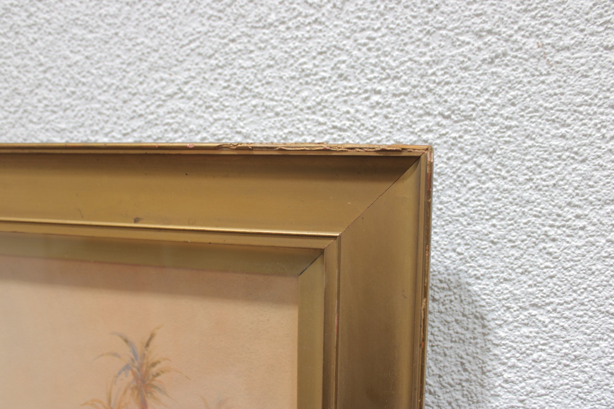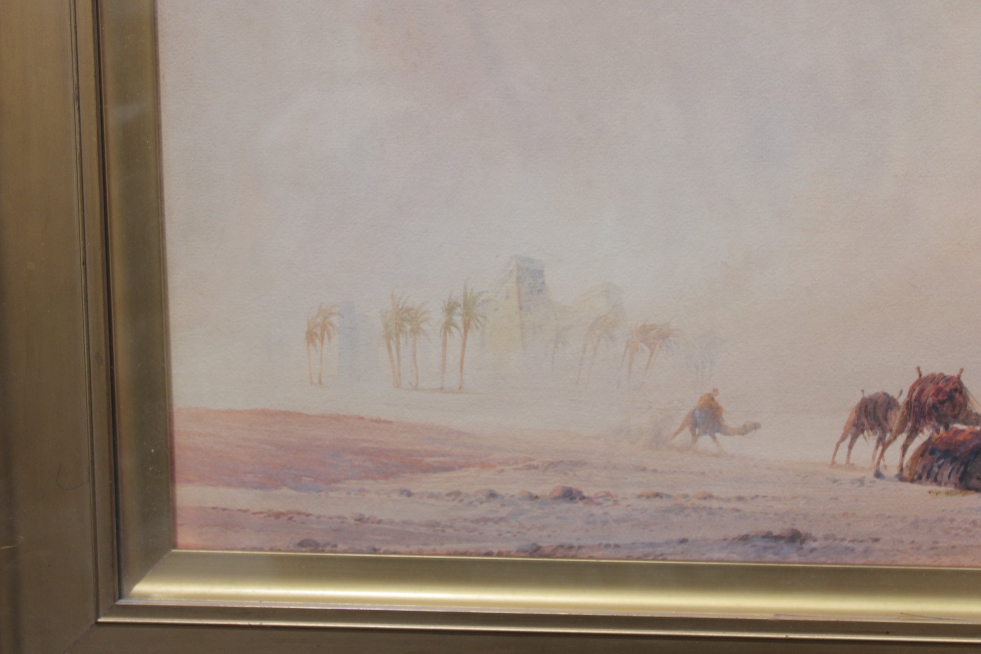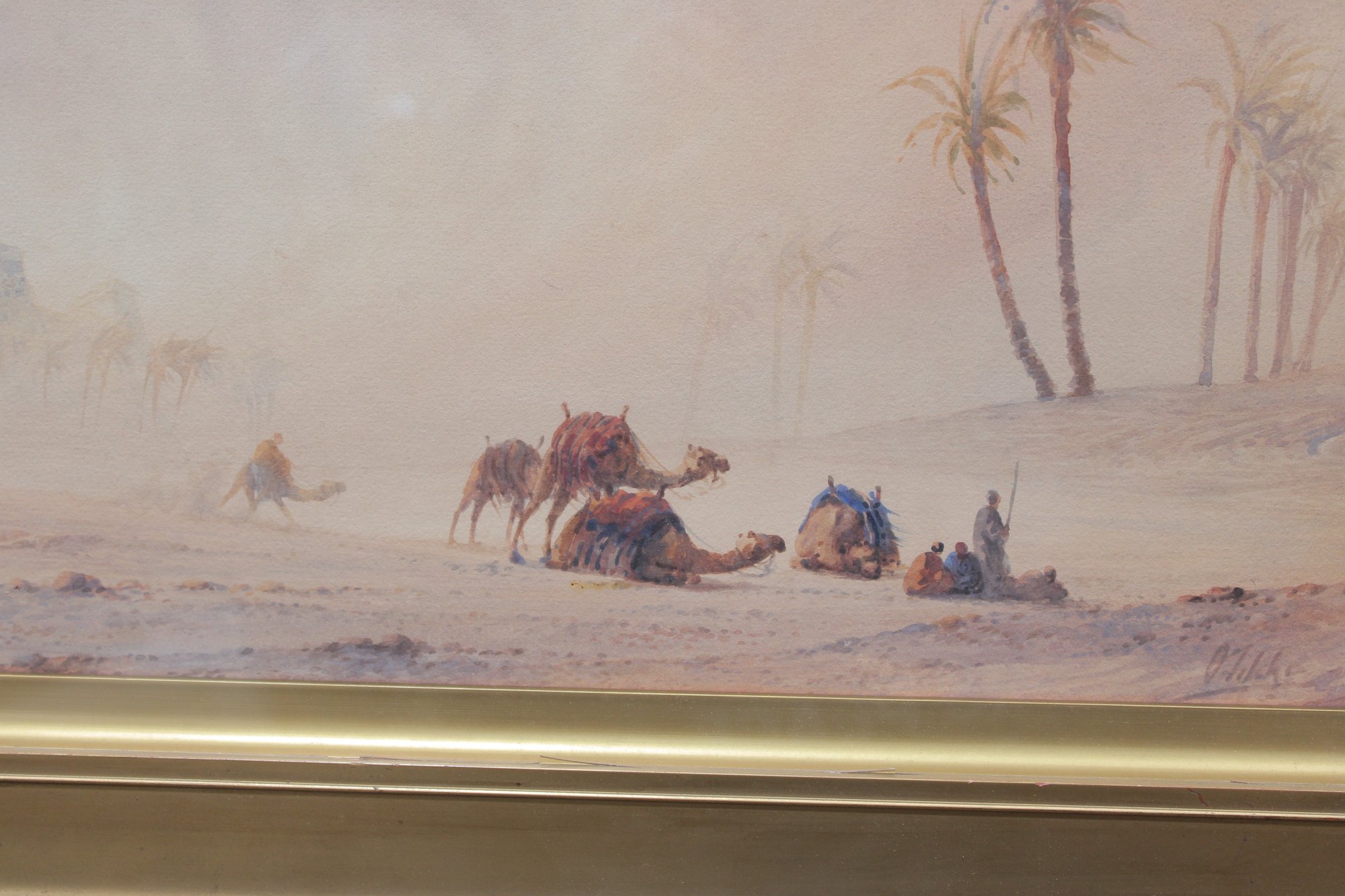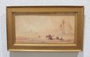 This evocative antique watercolor depicts a serene desert caravan scene, featuring resting figures and camels beneath softly rendered palm trees, all set against a warm, atmospheric landscape. The artist’s delicate use of muted earth tones and gentle washes creates a strong sense of distance, heat, and quiet stillness—hallmarks of classic Orientalist and travel-inspired works.