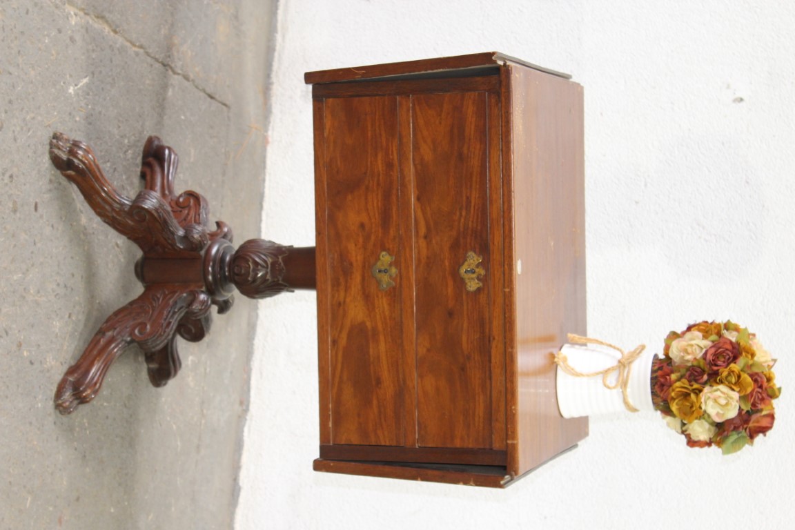 antique drop-leaf stand featuring two spacious drawers and a sturdy pedestal base. This versatile piece is crafted from rich wood and showcases two foldable side leaves that can be extended for additional tabletop space or left down for a compact profile. The stand rests on an intricately carved pedestal base with claw feet, providing both style and stability.