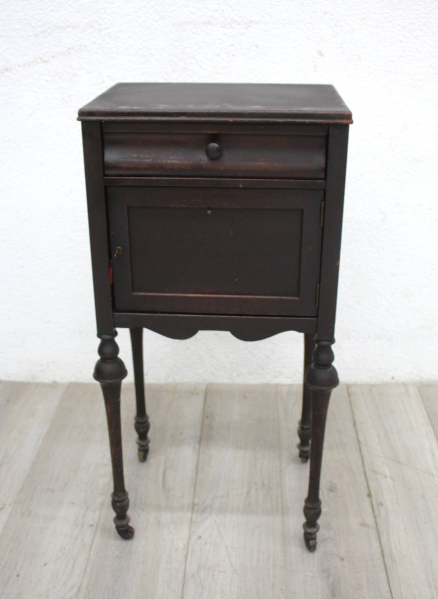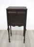 a rare piece of history with this antique Edwardian-style humidor cabinet. Perfect for collectors or aficionados, this cabinet features a rich, dark wooden exterior with elegant turned legs and a single drawer for storage. The interior reveals a uniquely inlaid metal box with perforations, designed to keep cigars at their best.