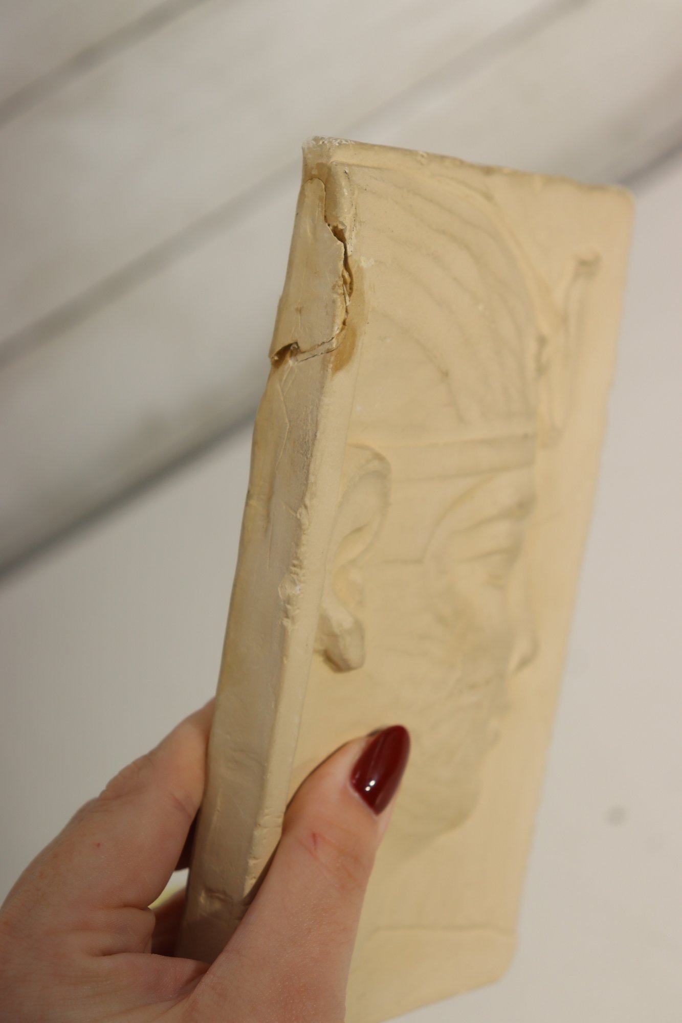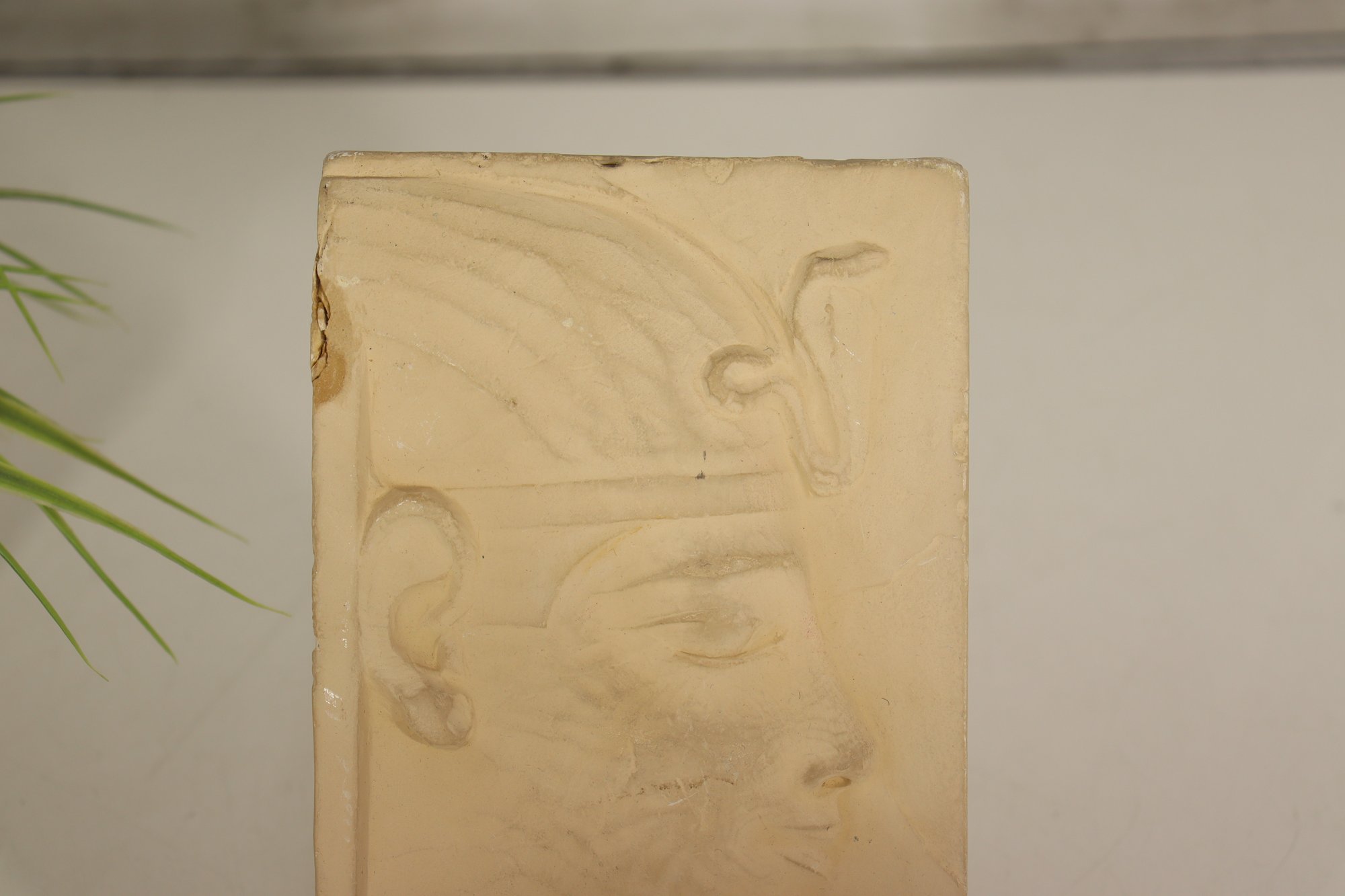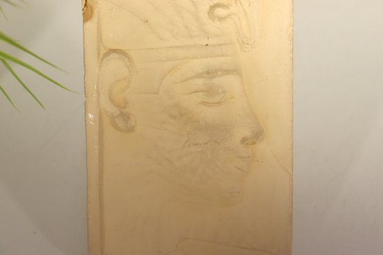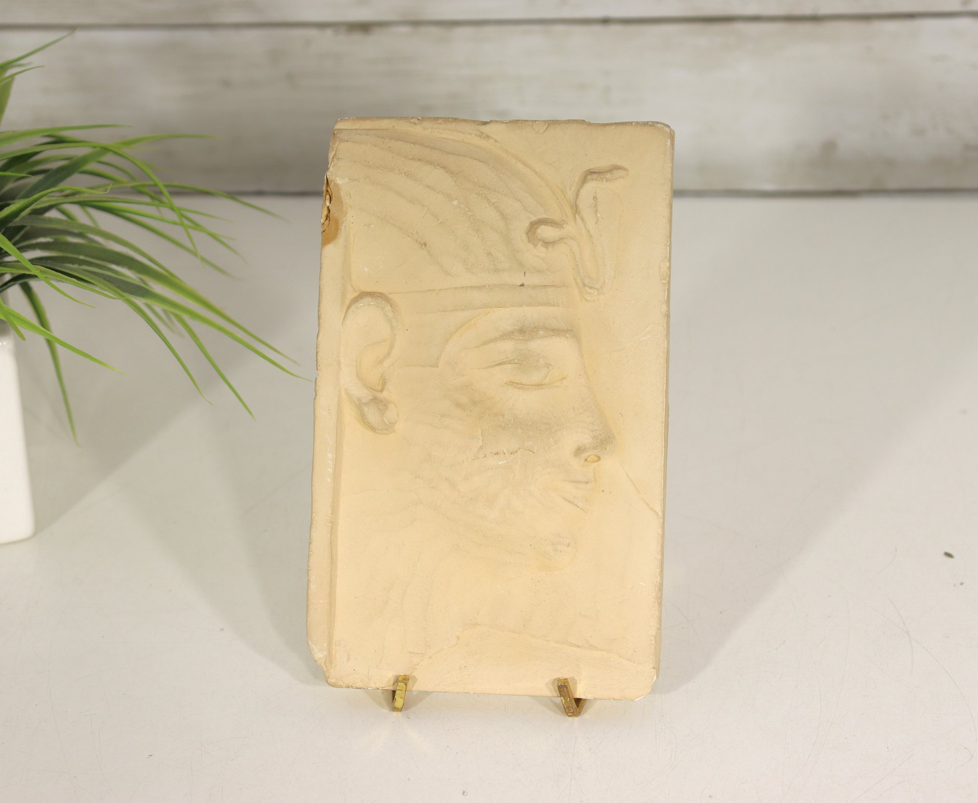 A striking Egyptian Revival plaster relief wall plaque depicting the profile of an ancient Egyptian pharaoh wearing a traditional headdress adorned with a cobra (uraeus). Measuring approximately 7.5 inches high by 4.5 inches wide, this sculpted piece captures the timeless beauty and mystique of ancient Egyptian art.