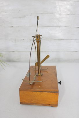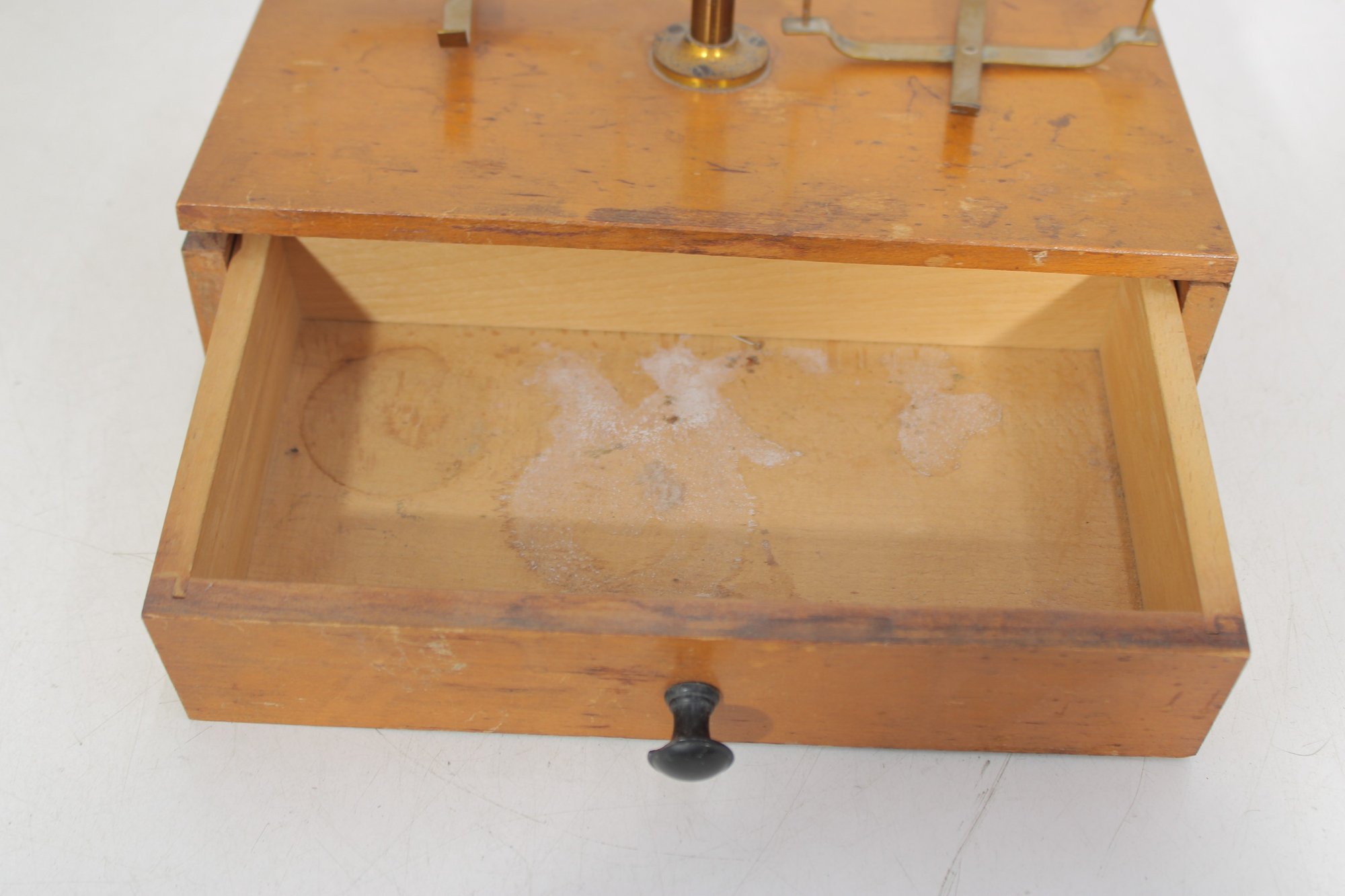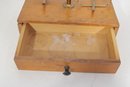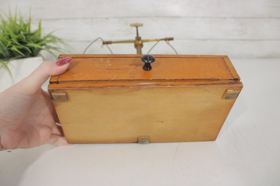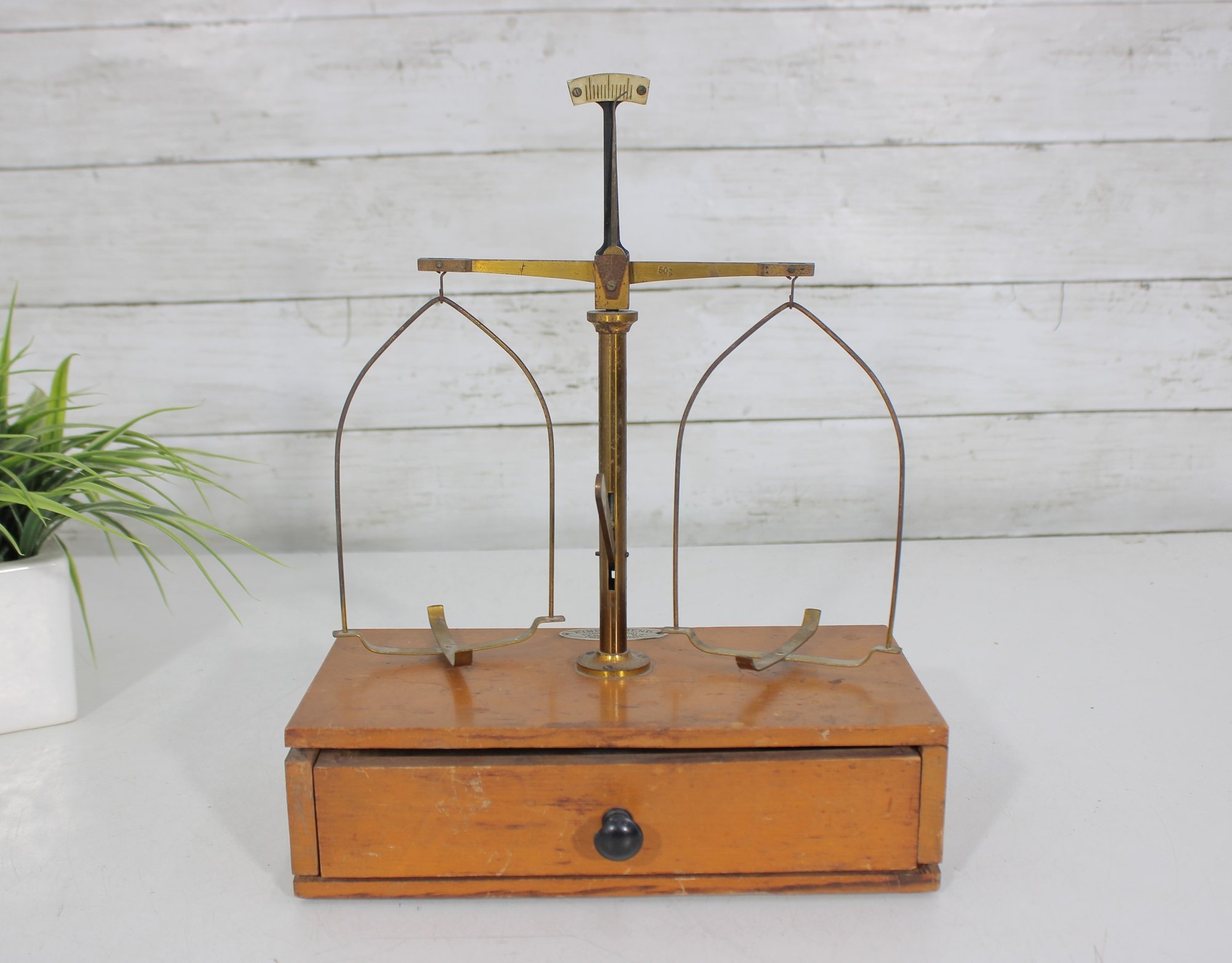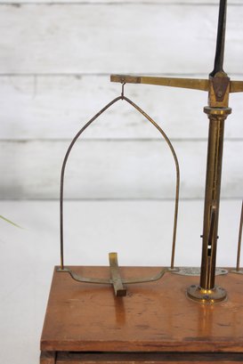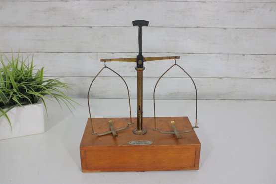 Antique apothecary balance scale by Eimer & Amend, New York, mounted on a wooden base with single drawer. A classic laboratory/pharmacy piece featuring brass upright column, cross arm, and hanging supports.