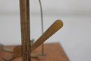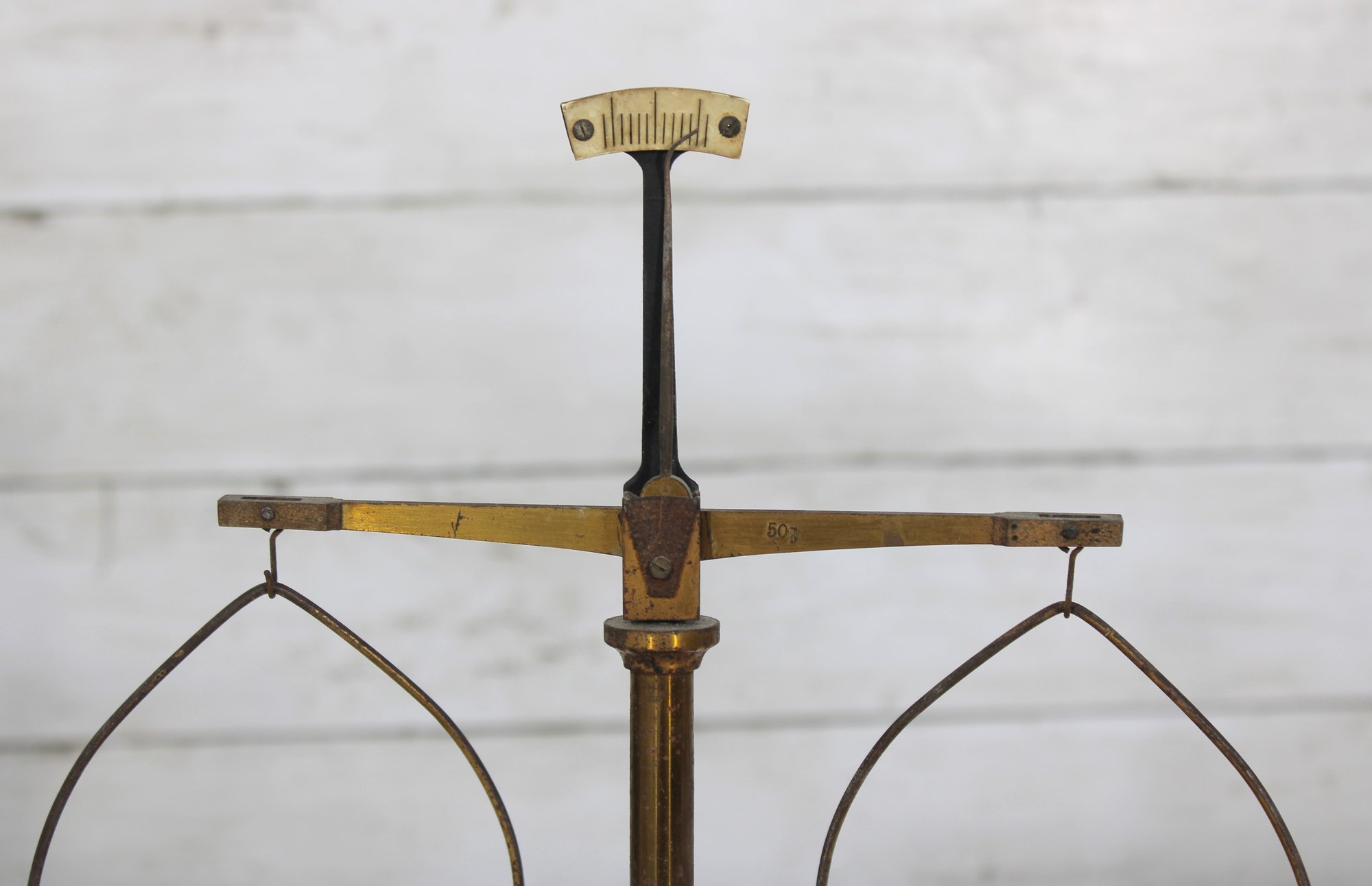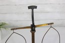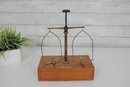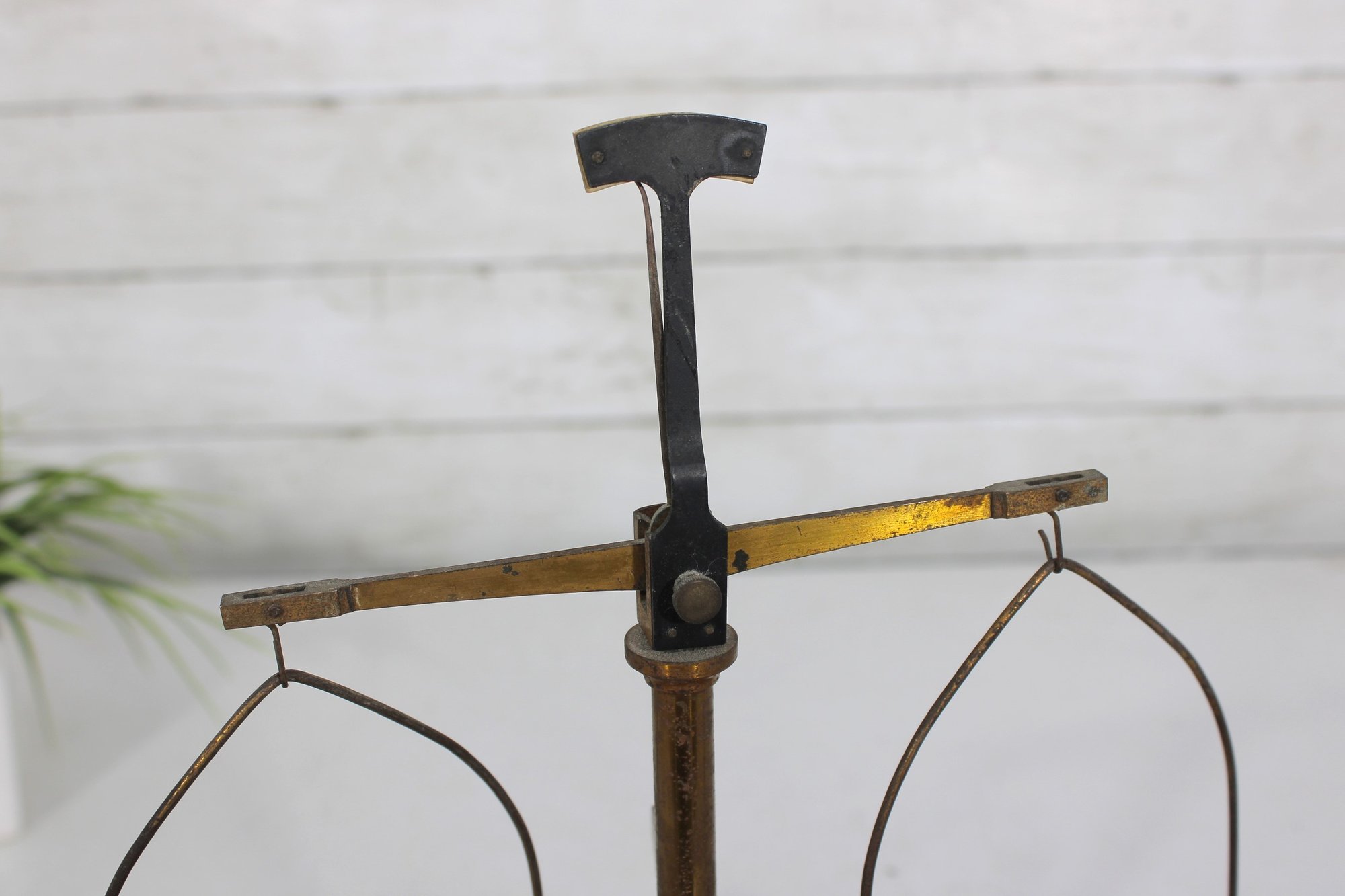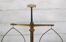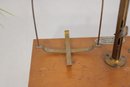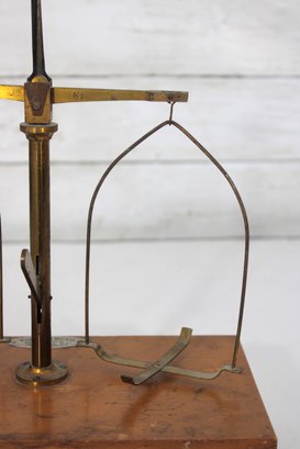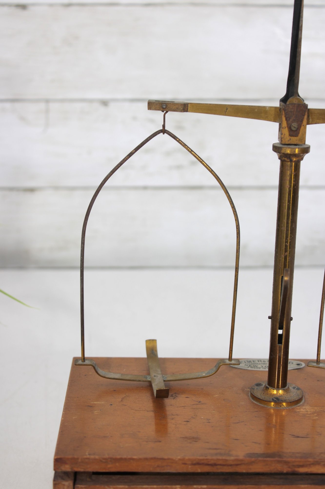 The brass weighing pans/trays are missing. This listing includes the base, upright column, cross arm, and hanging supports only (as shown).