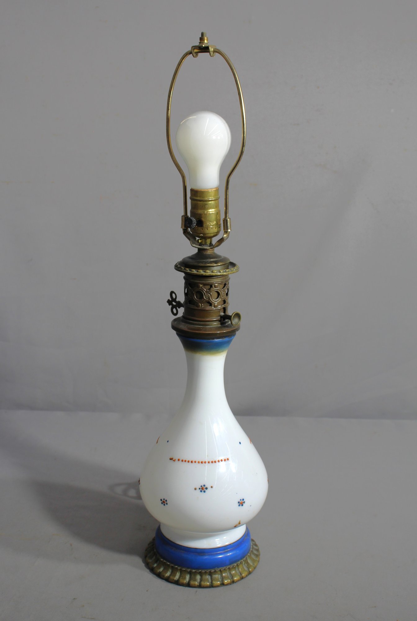 The lamp’s brass burner assembly showcases a time-worn patina, indicative of its age and authenticity.