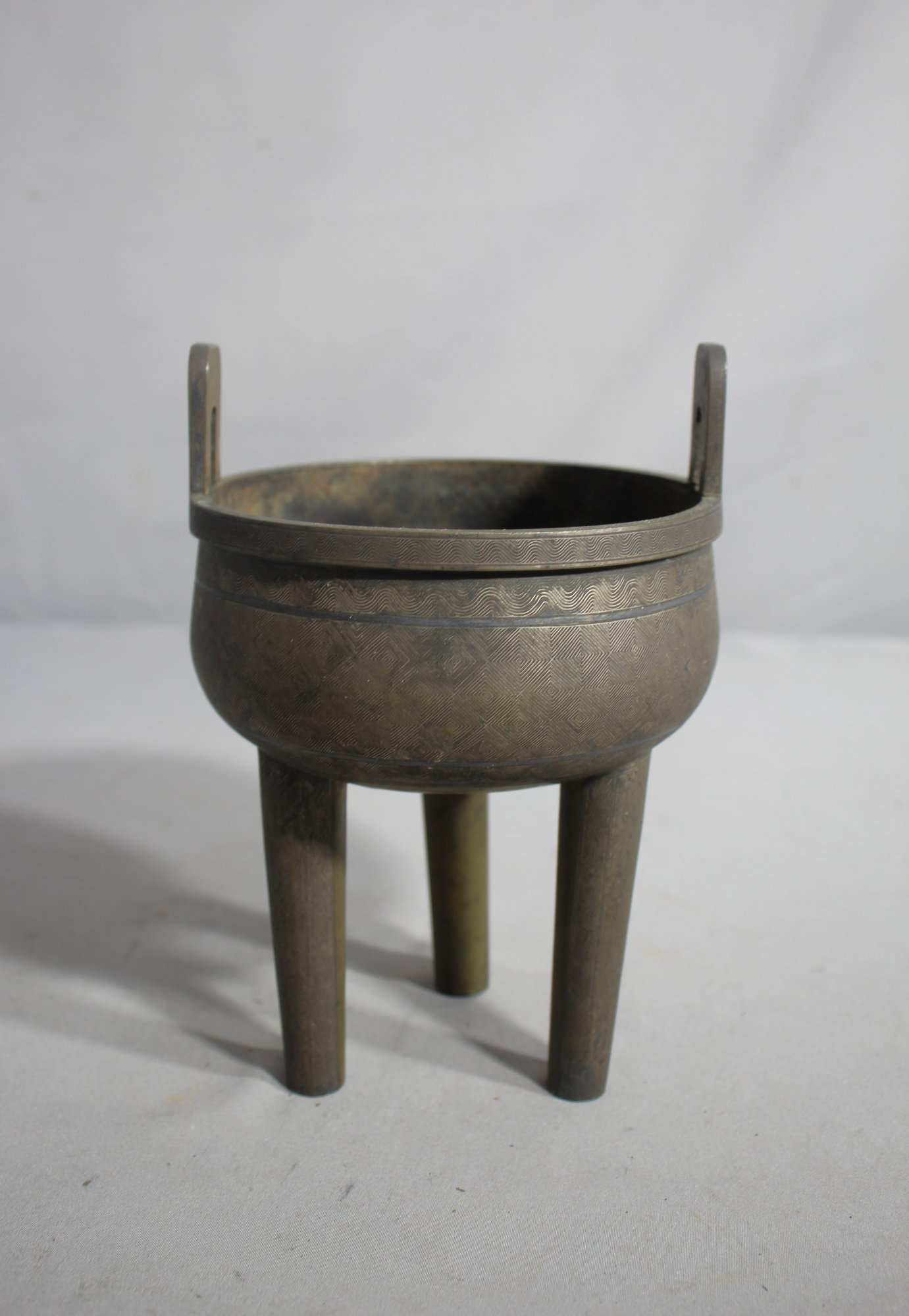 This bronze cauldron stands on three sturdy legs, ensuring stability and an upright presentation, while the two handles on each side provide ease of handling.
