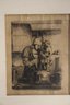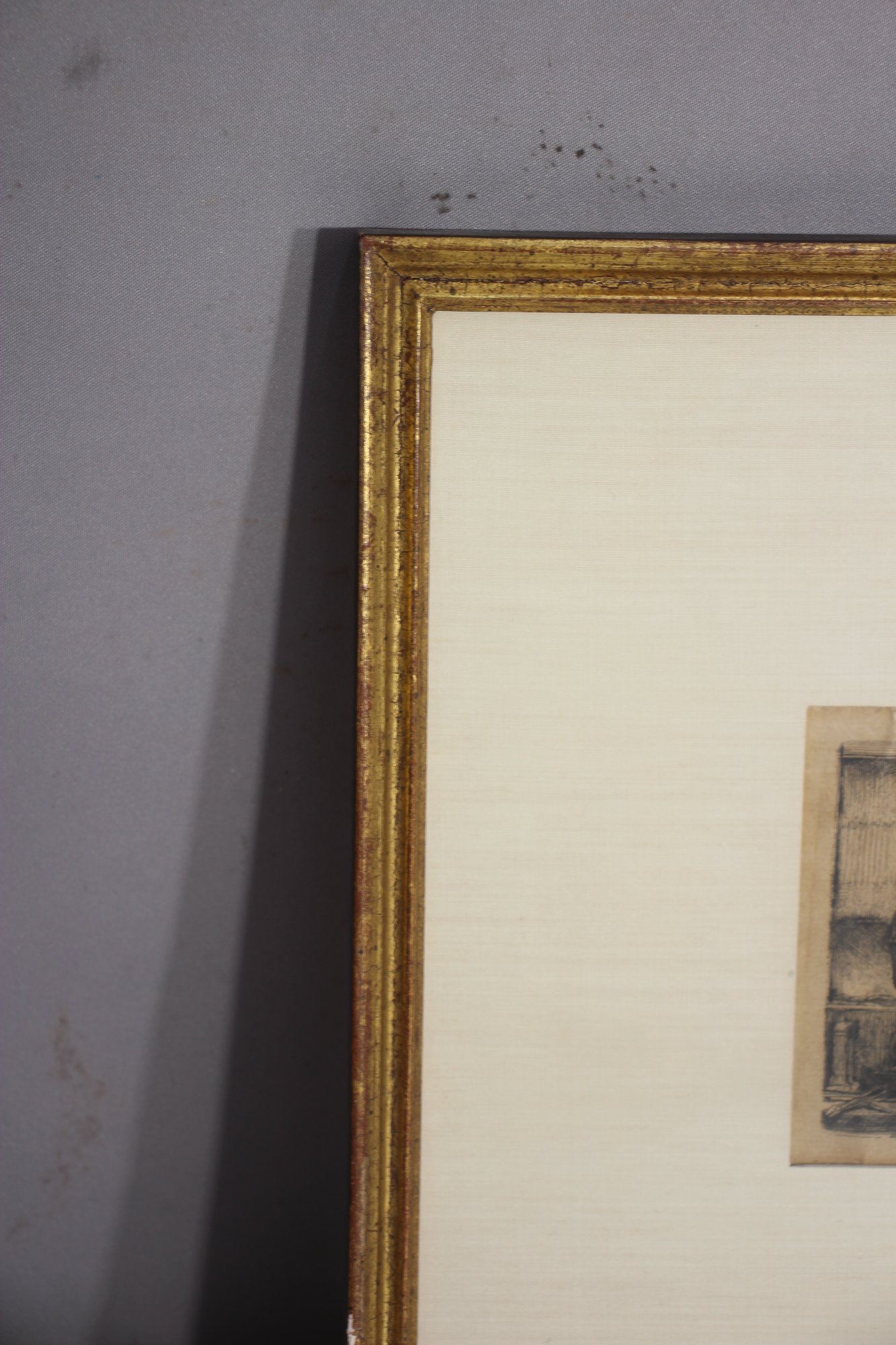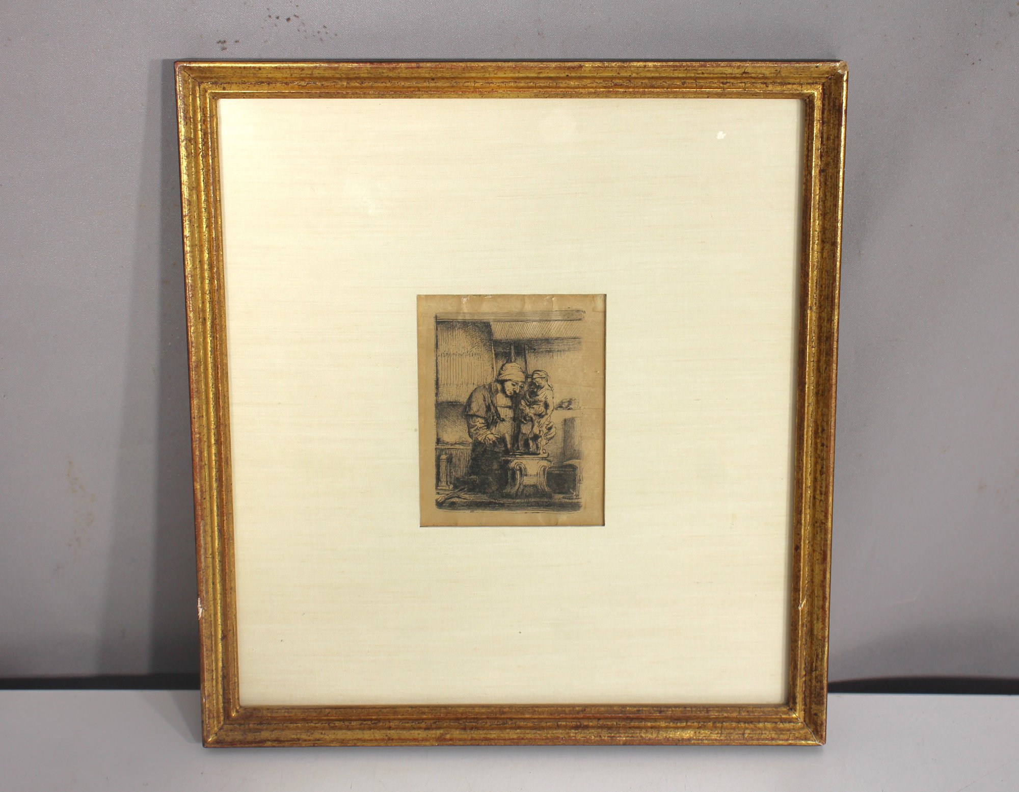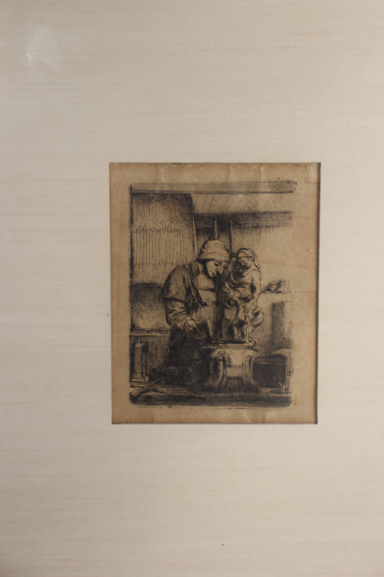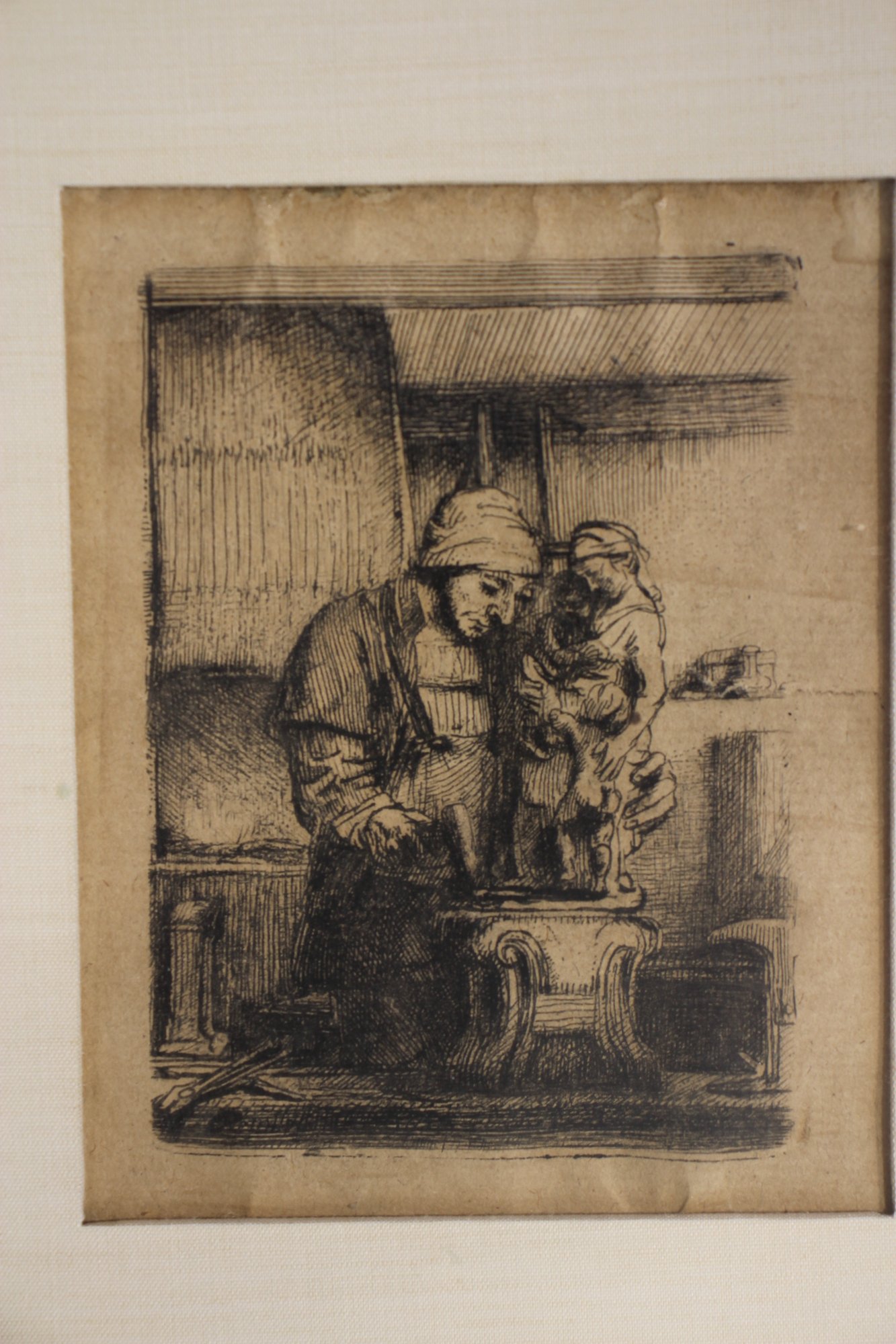 A striking antique etching depicting an artisan working on a sculpture, evoking a sense of craftsmanship and tradition. The finely detailed black-and-white etching captures the atmosphere of an old workshop, with the artist carefully sculpting a figure in a dimly lit space. The piece is elegantly framed in a gold-toned wooden frame with a wide linen mat.