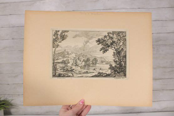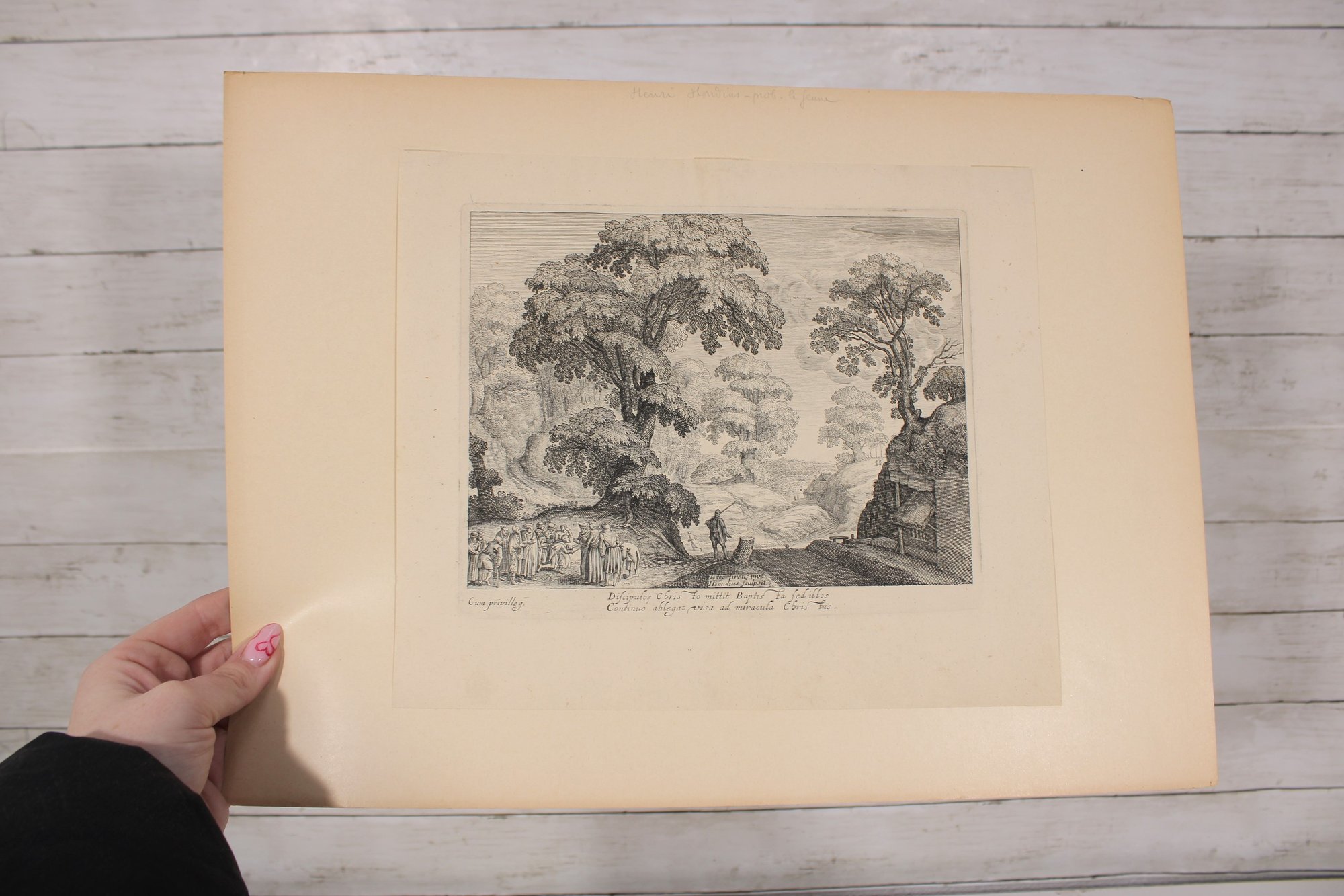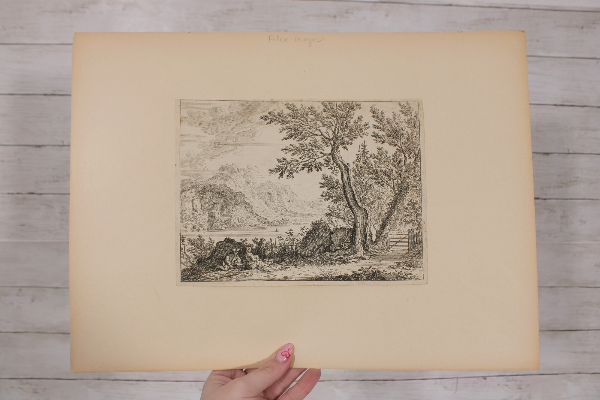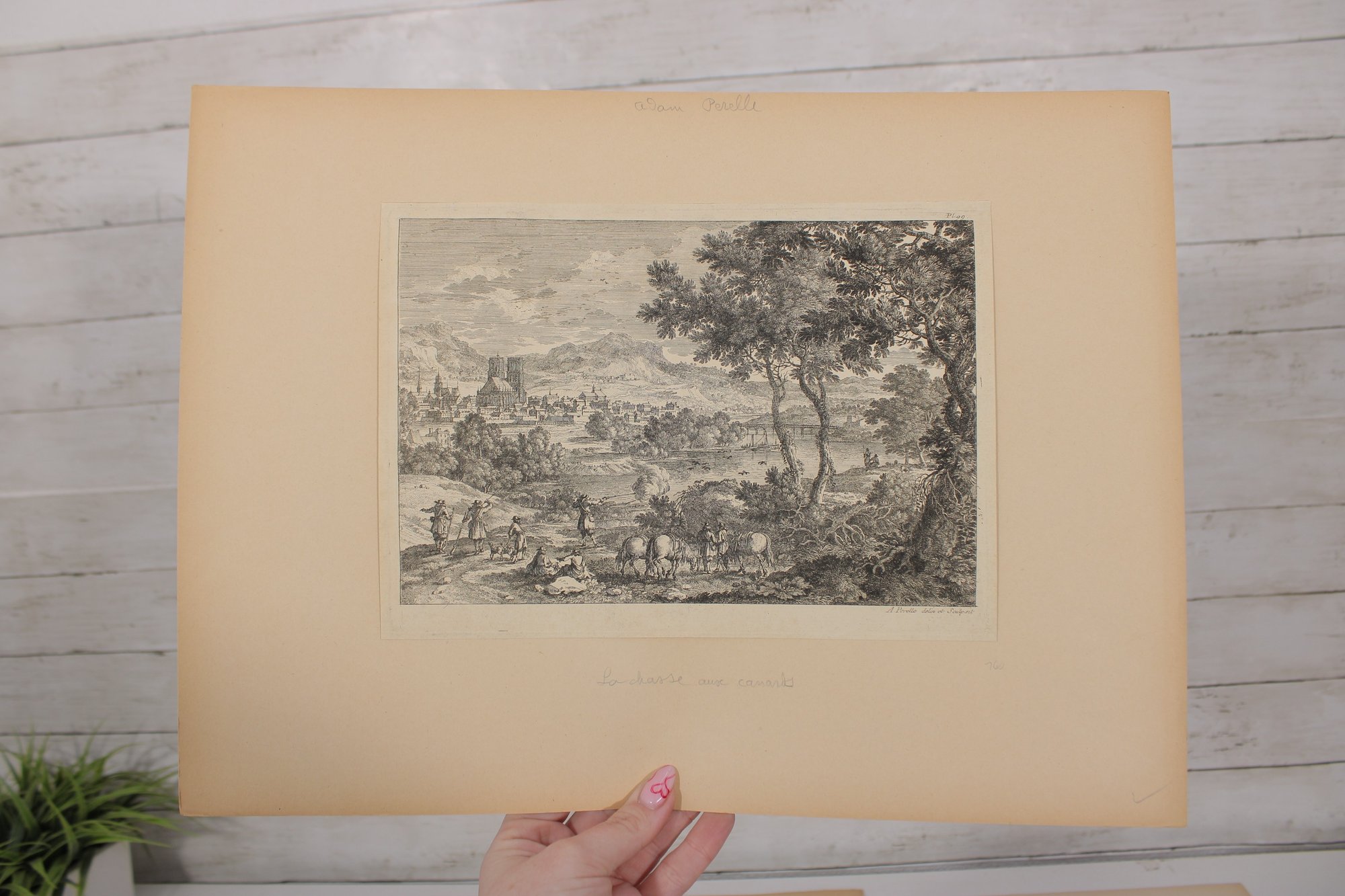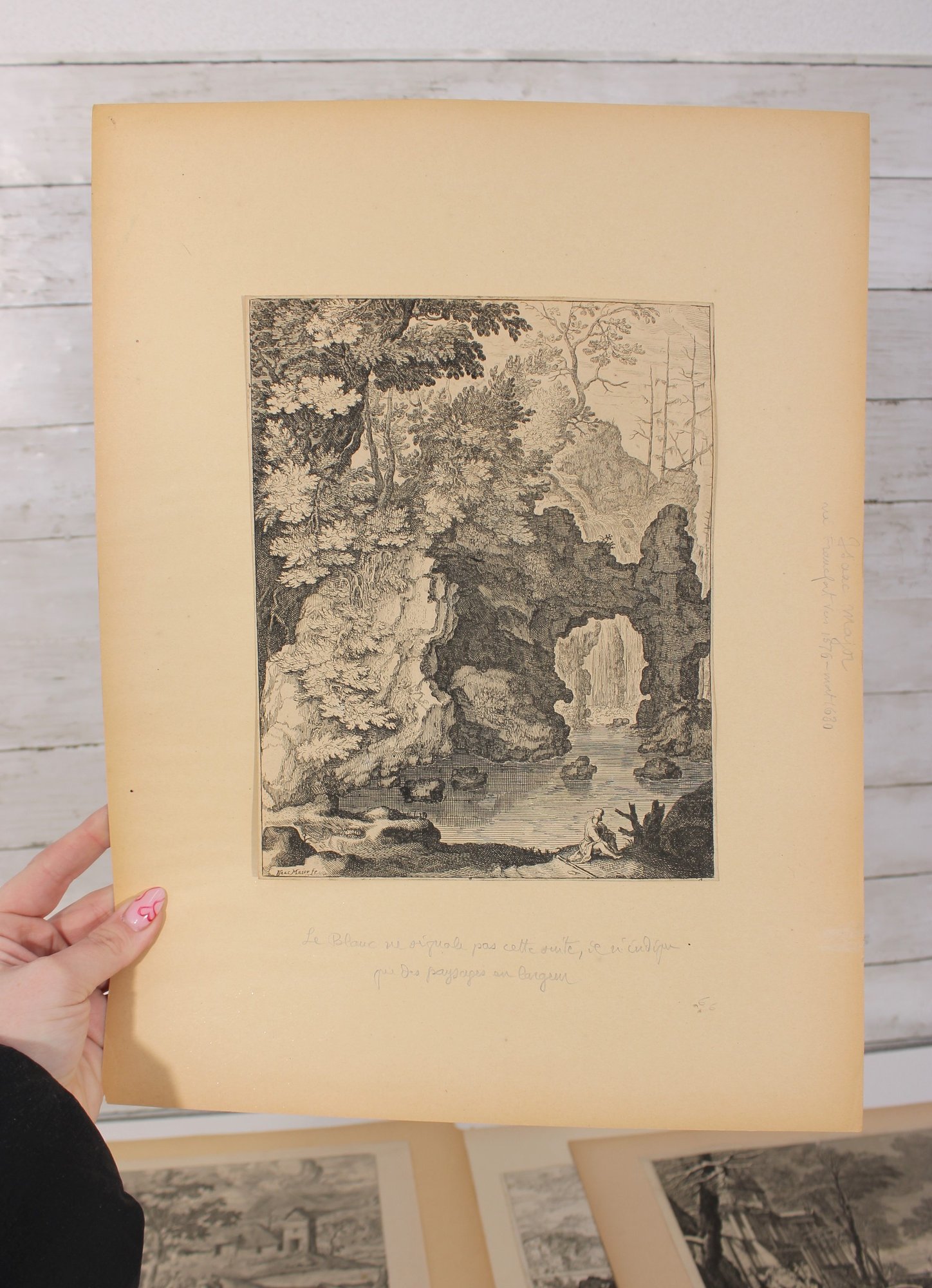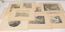 Several prints include engraved captions beneath the image, decorative crests, and publisher marks. The pieces appear to have been removed from antique folios or art volumes and are mounted on aged paper with natural toning.