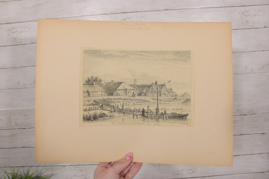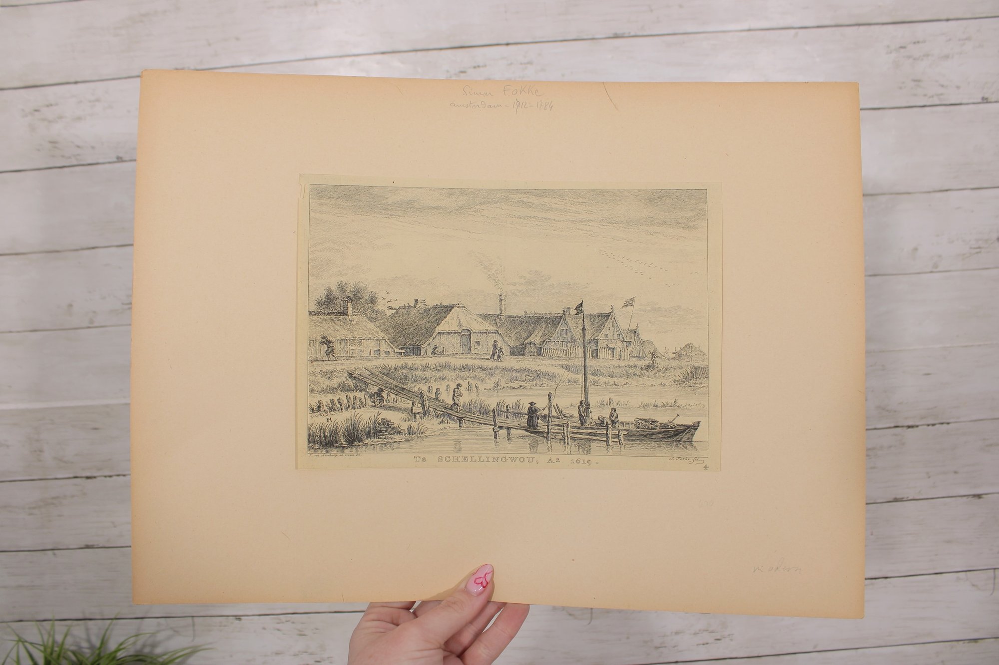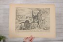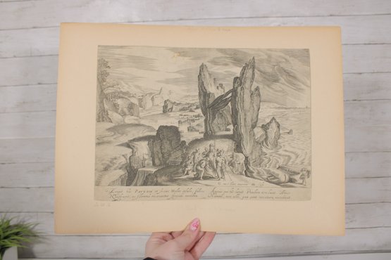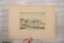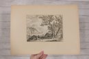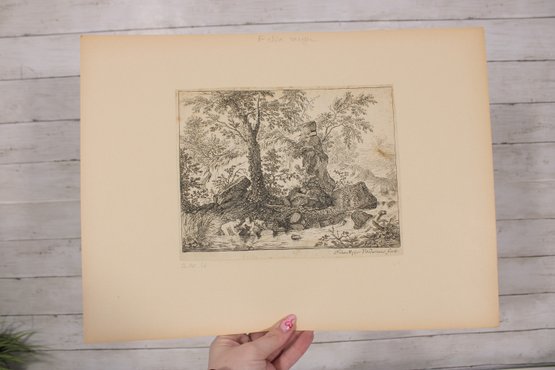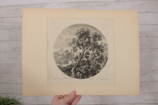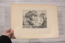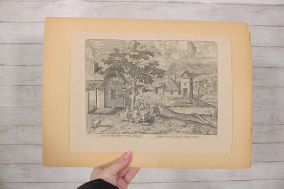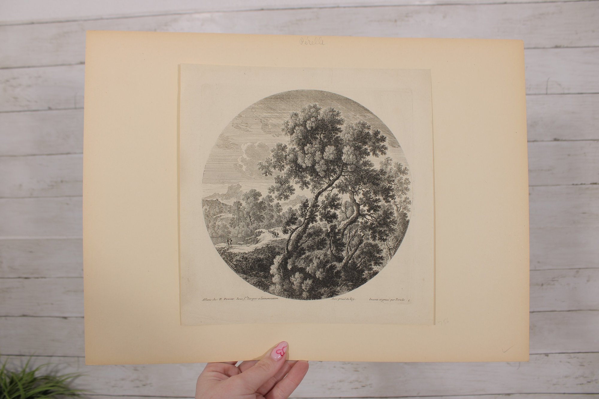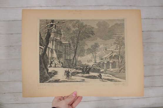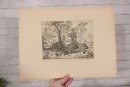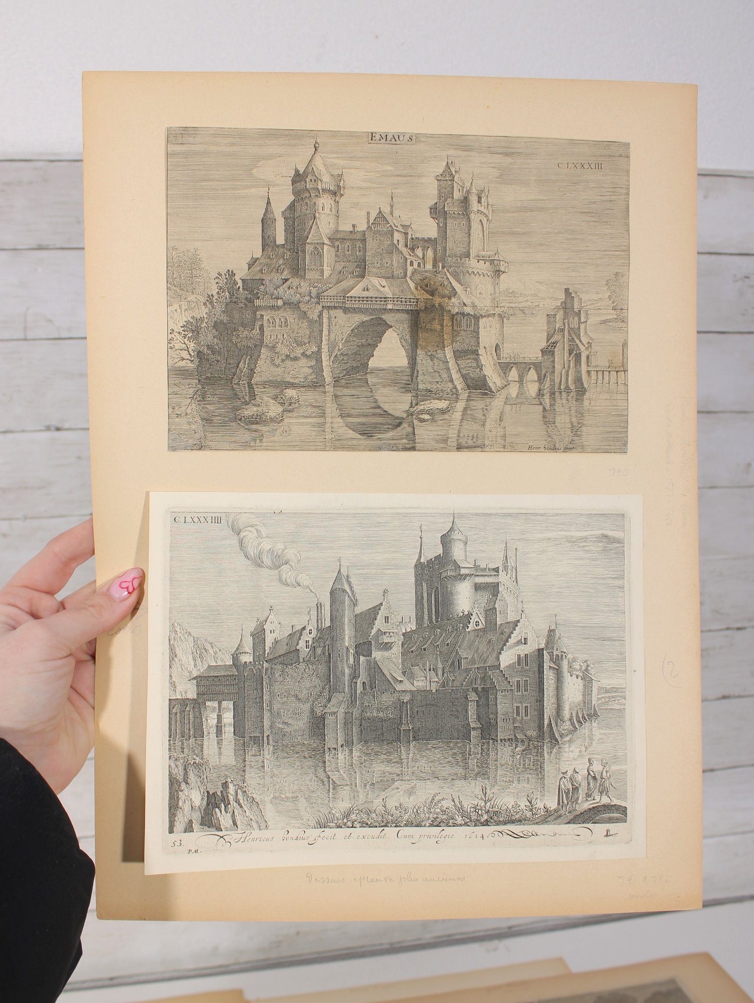 Several prints include engraved captions beneath the image, decorative crests, and publisher marks. The pieces appear to have been removed from antique folios or art volumes and are mounted on aged paper with natural toning.