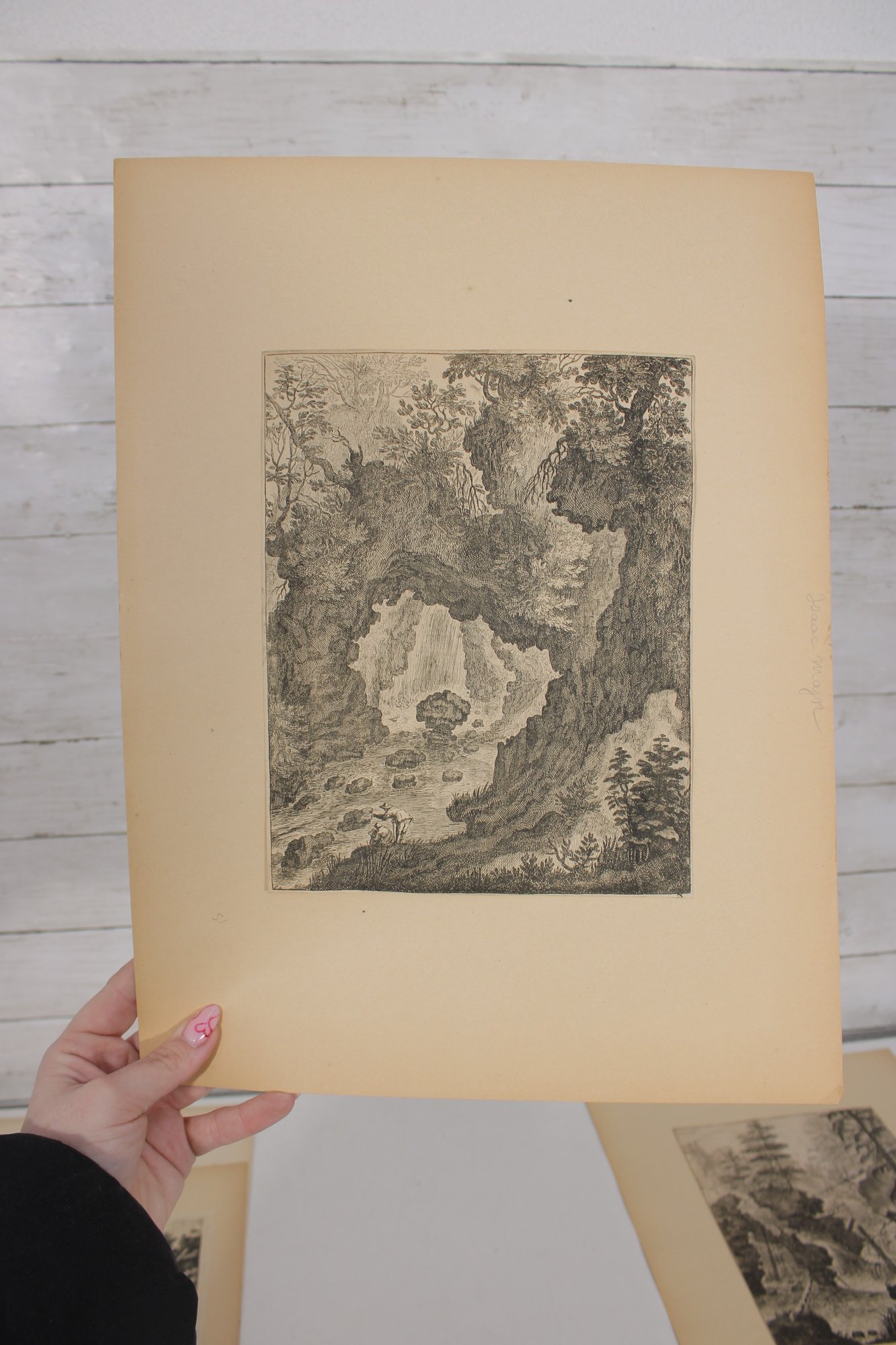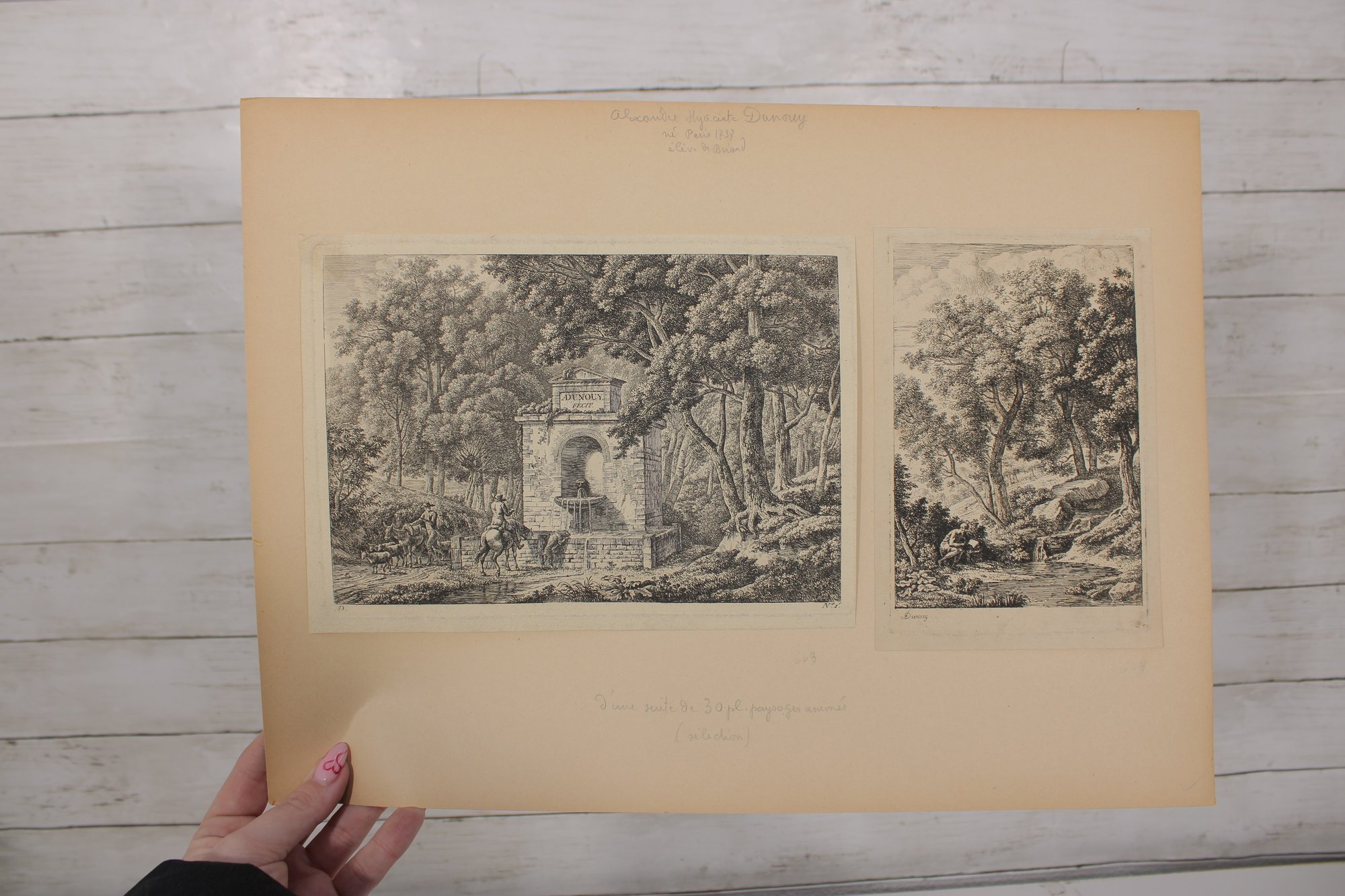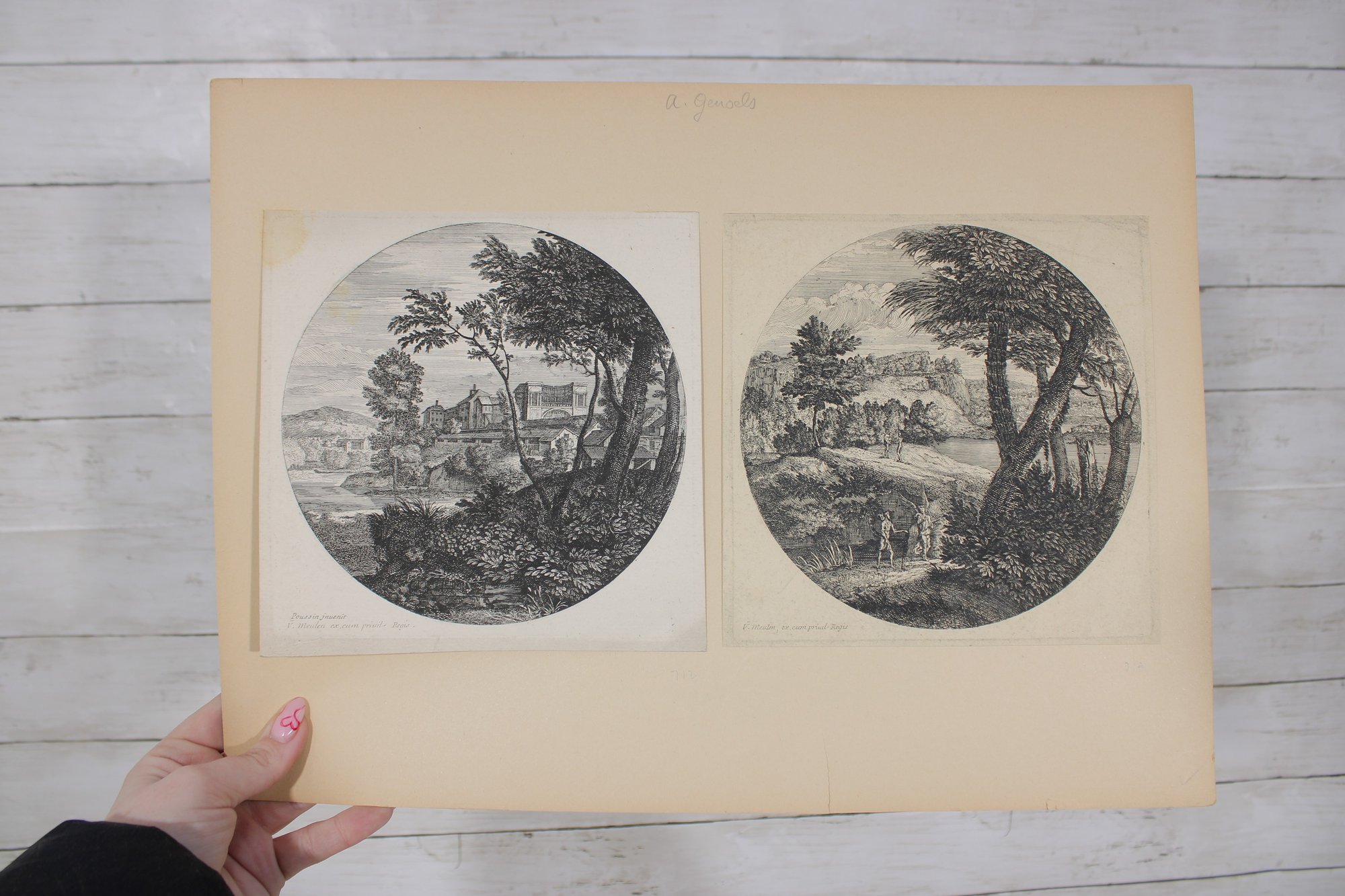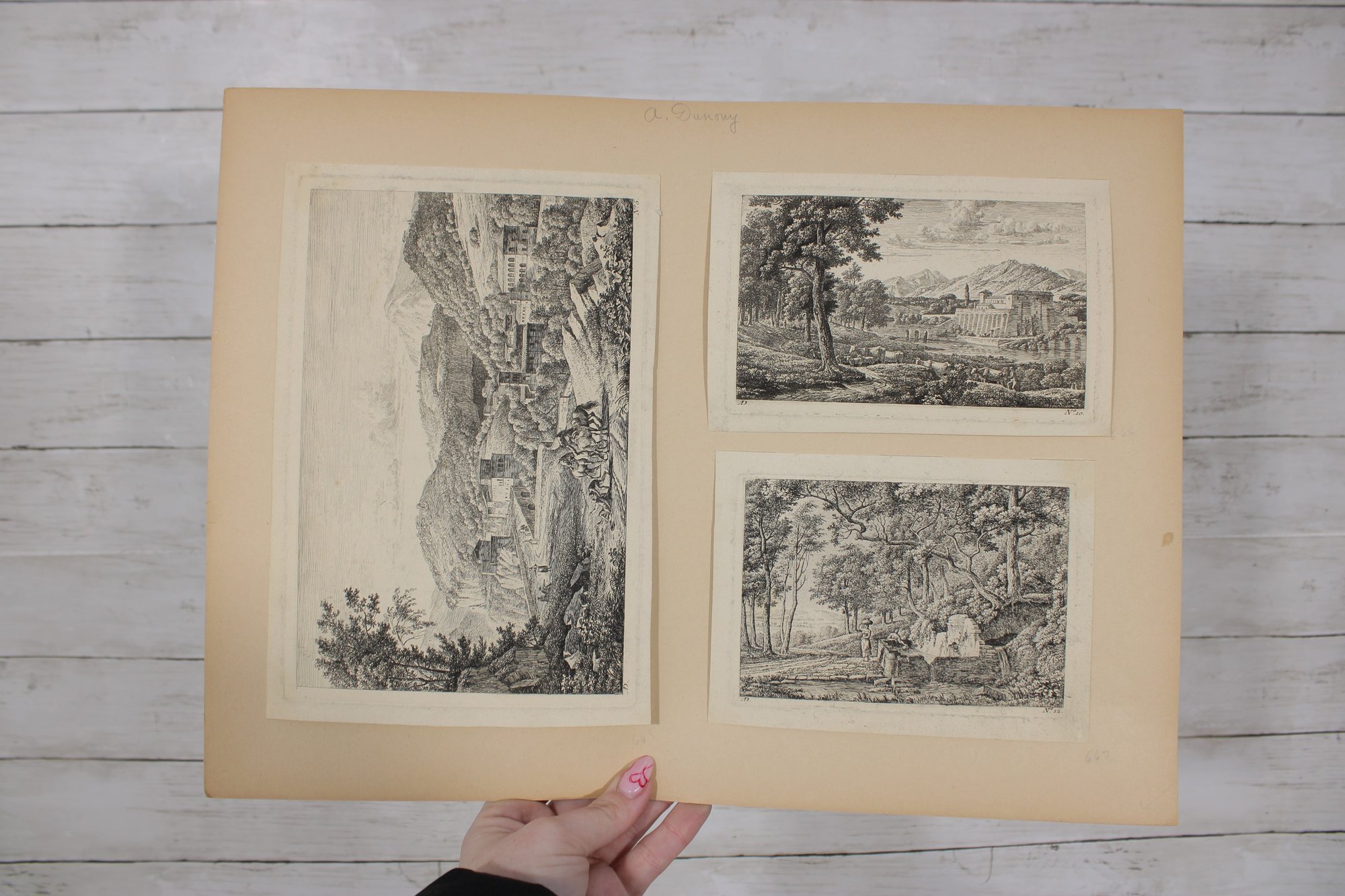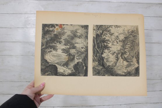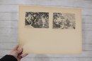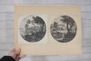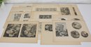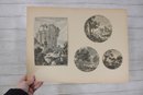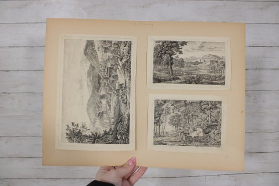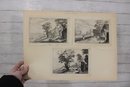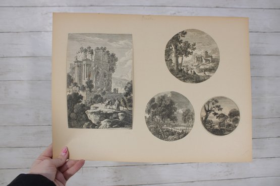 Several sheets present multiple smaller engravings arranged on one page, while others showcase larger single compositions. The prints appear to have been removed from antique folios or illustrated volumes and are mounted on aged paper with natural toning.