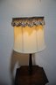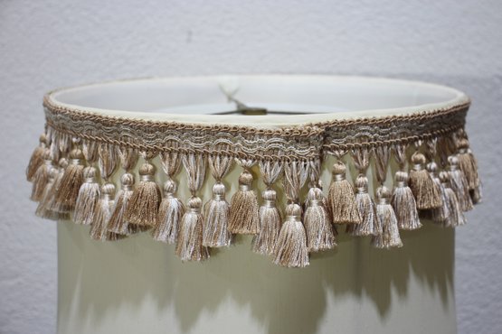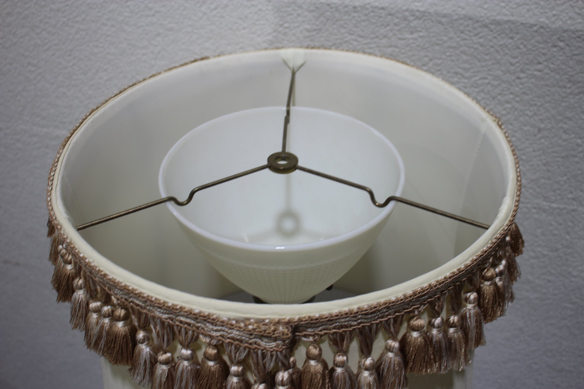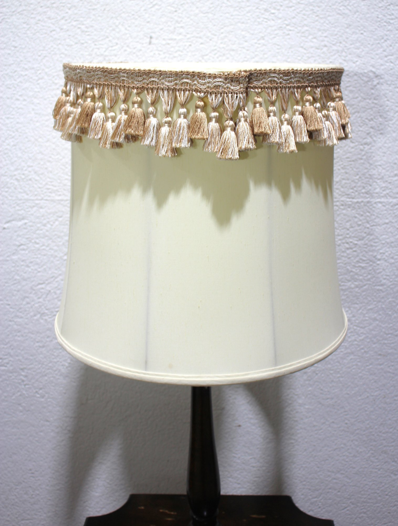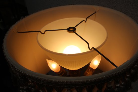 The lamp is topped with a classic cream-colored shade, enhanced by a decorative fringe tassel trim, adding a touch of vintage sophistication. The lighting includes a central frosted glass diffuser and multiple bulbs, providing a warm, ambient glow.