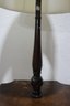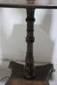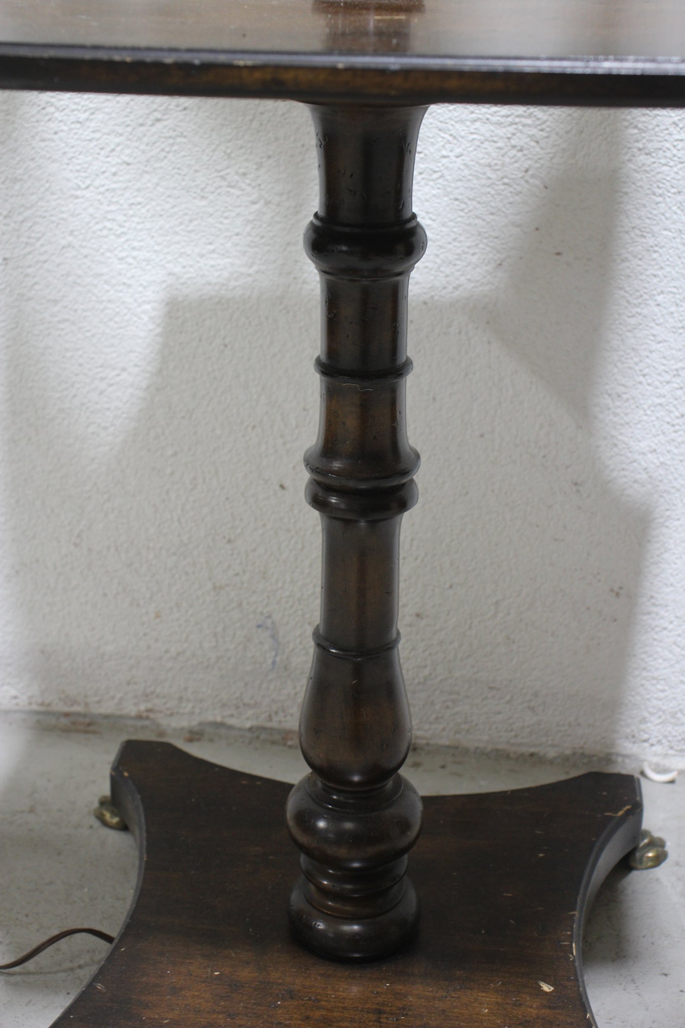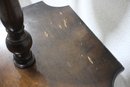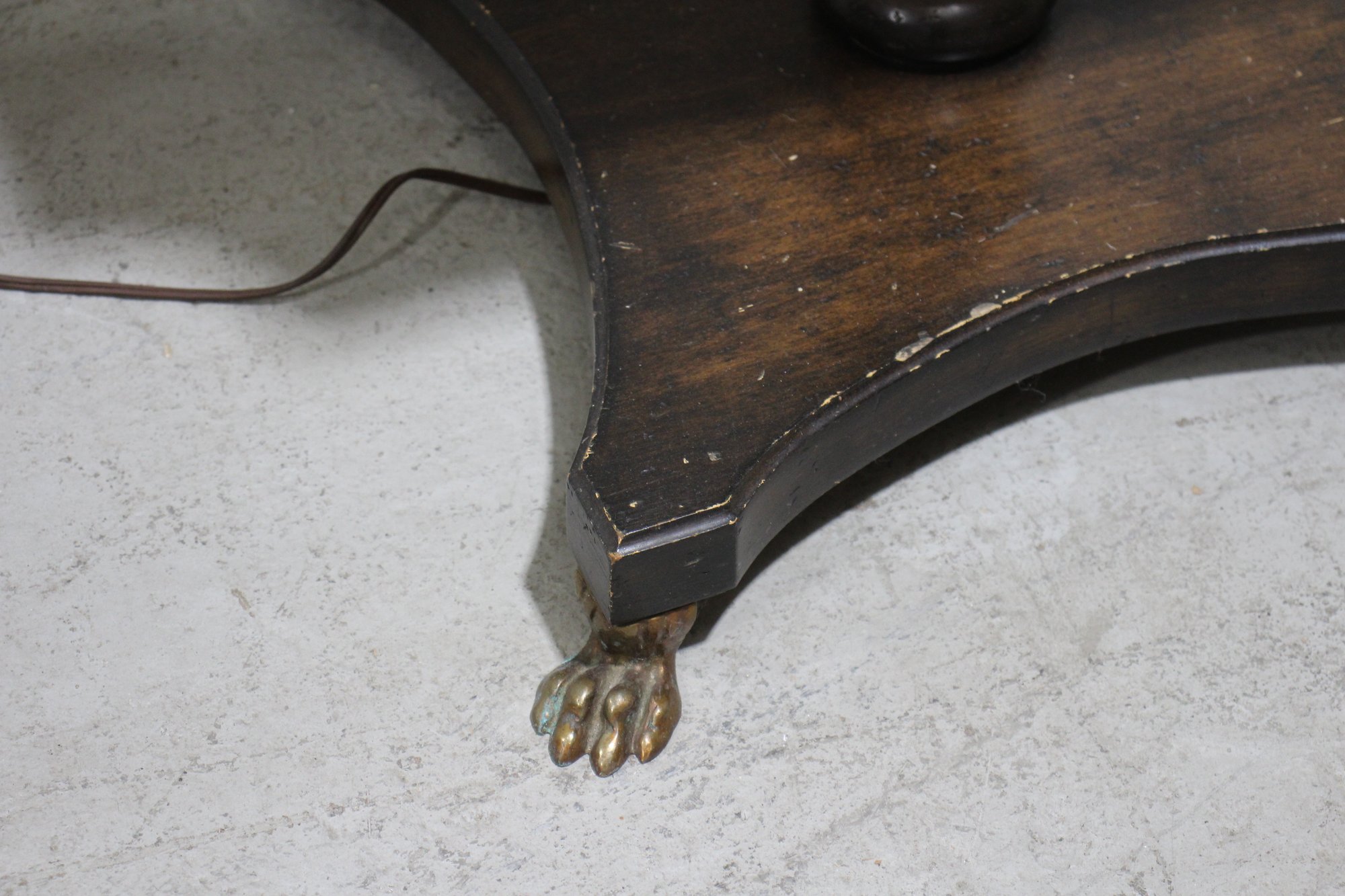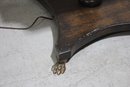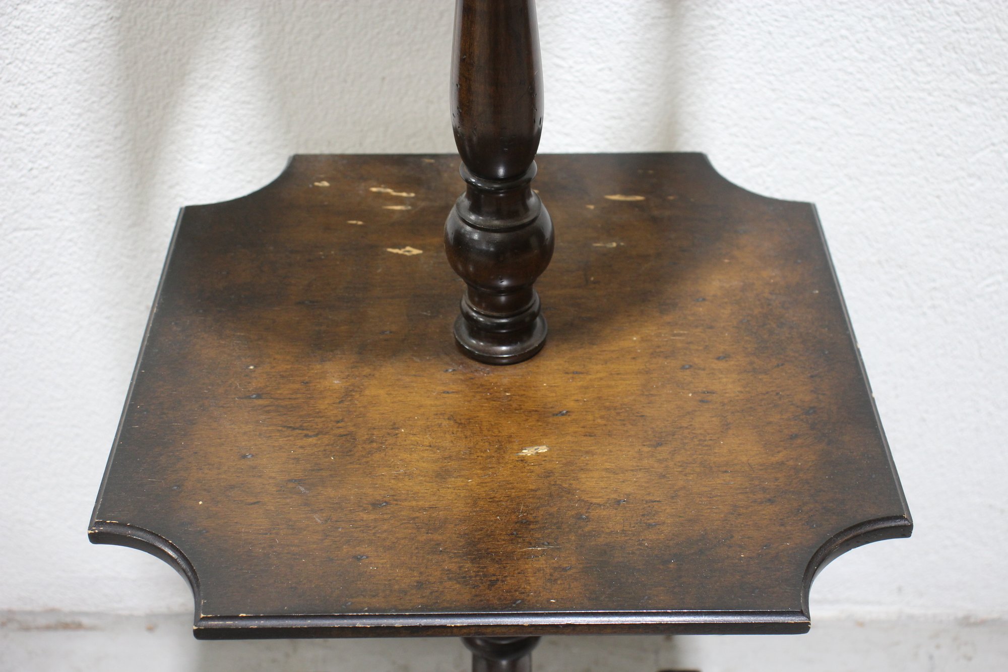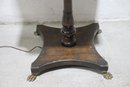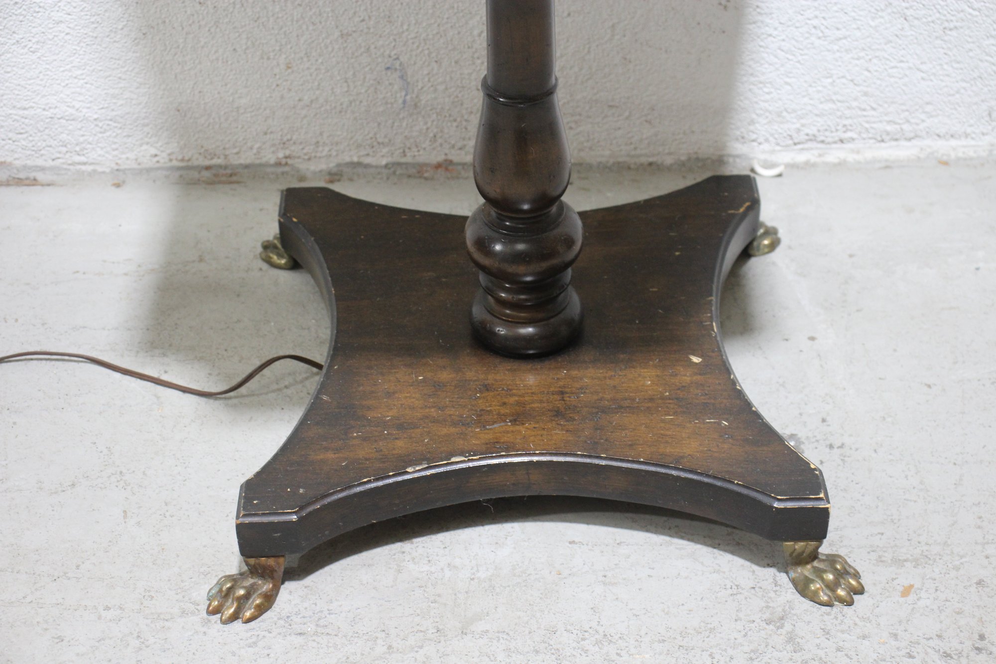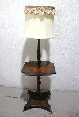 This elegant antique floor lamp with a built-in table combines function and timeless charm. Standing at 58 inches tall, it features a richly stained wooden frame, a scalloped-edge tabletop, and a sturdy four-legged claw foot base with ornate brass accents.