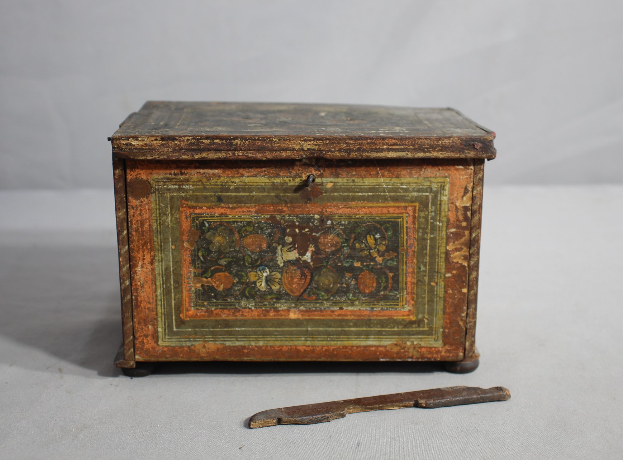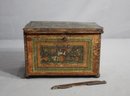 This evocative Antique Folk Art Painted Wooden Jewelry Box is a window into the past, offering more than just storage for treasured items, but a piece of history. Standing with a weathered dignity, its surface showcases a rich patina only achieved through the loving wear of time. The box is adorned with a charming hand-painted fruit motif, framed by rustic borders, imbuing it with a quaint and homey aesthetic.The box is raised slightly on feet, giving it a proud stance wherever it is placed.