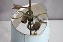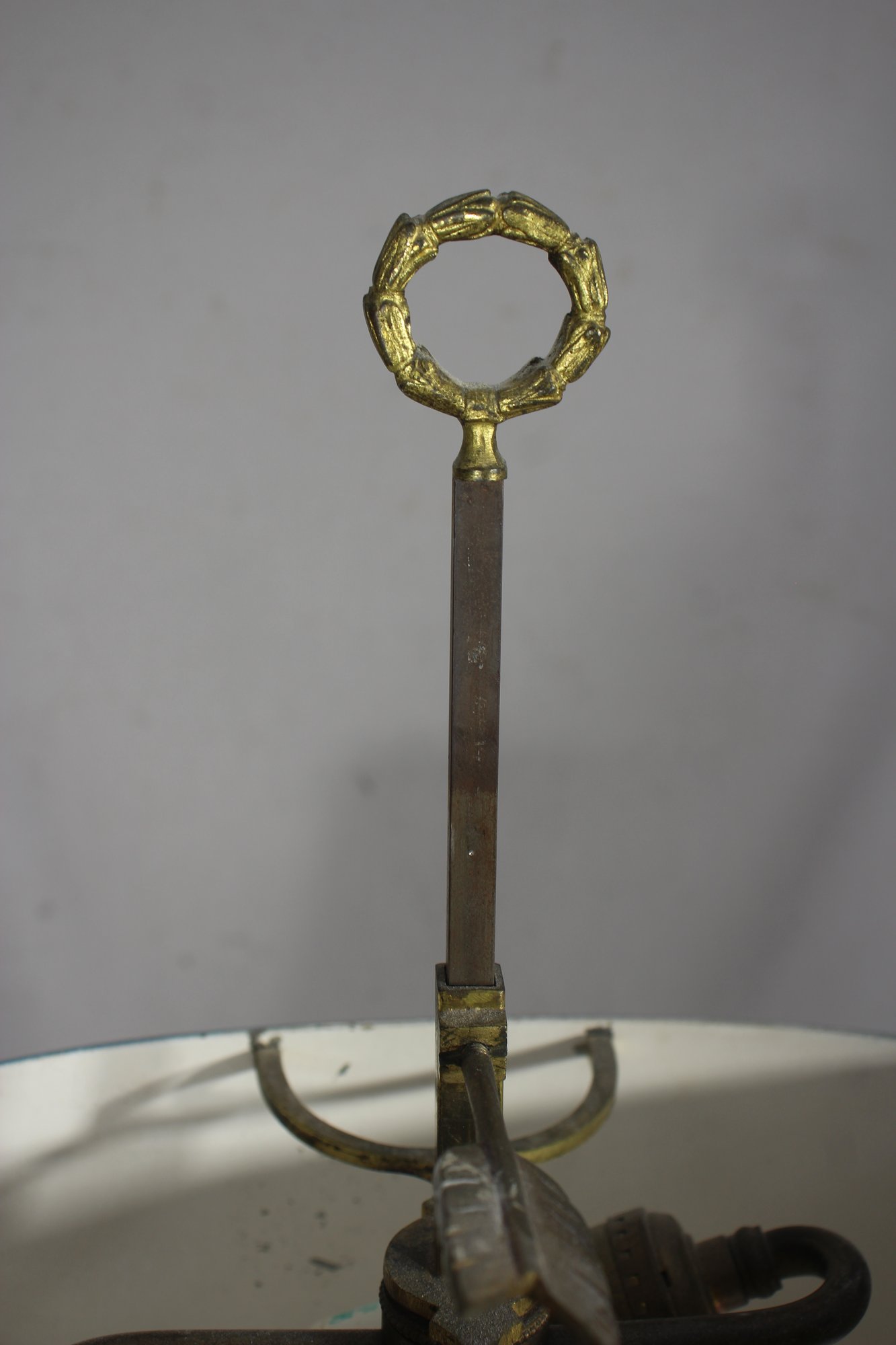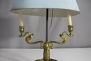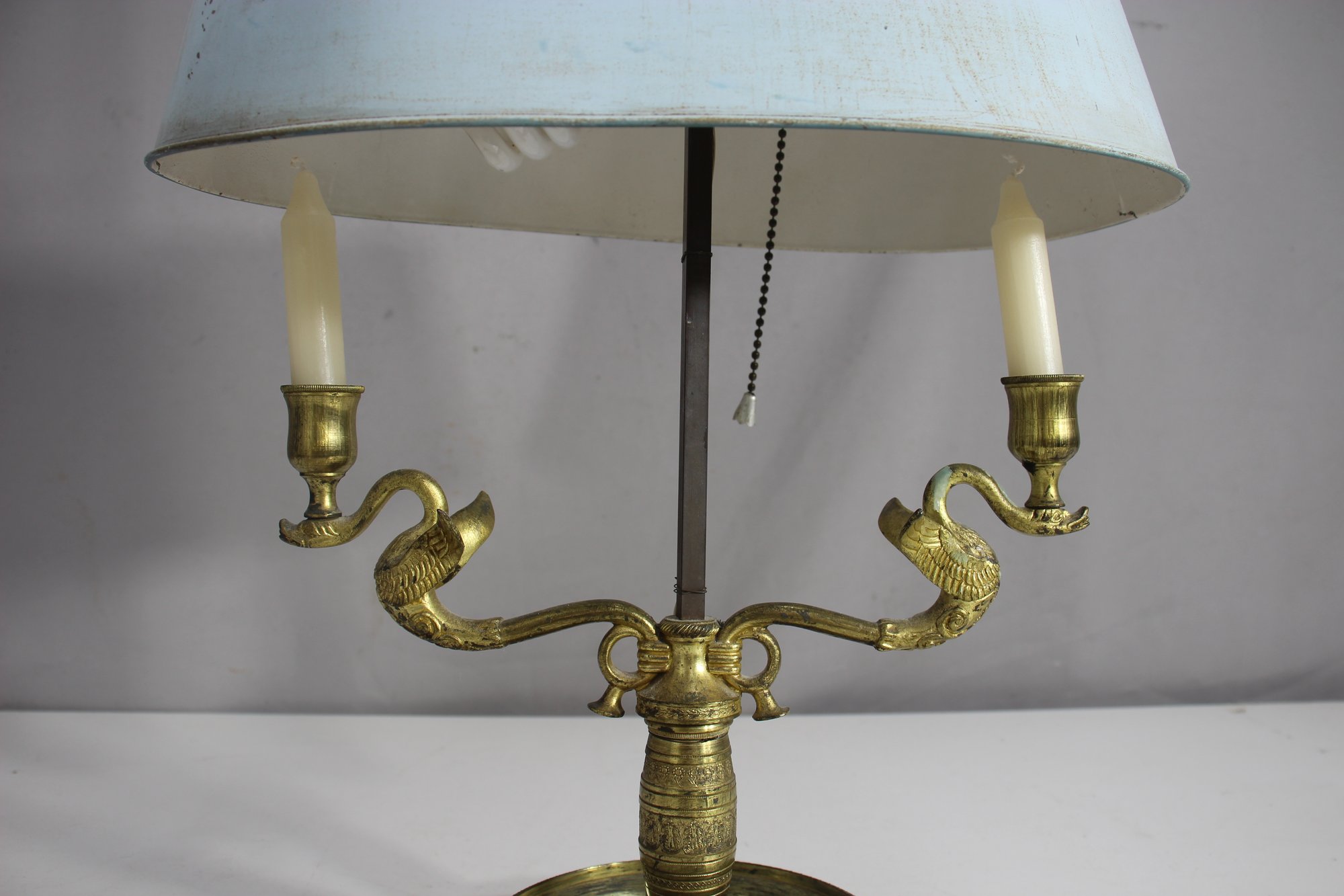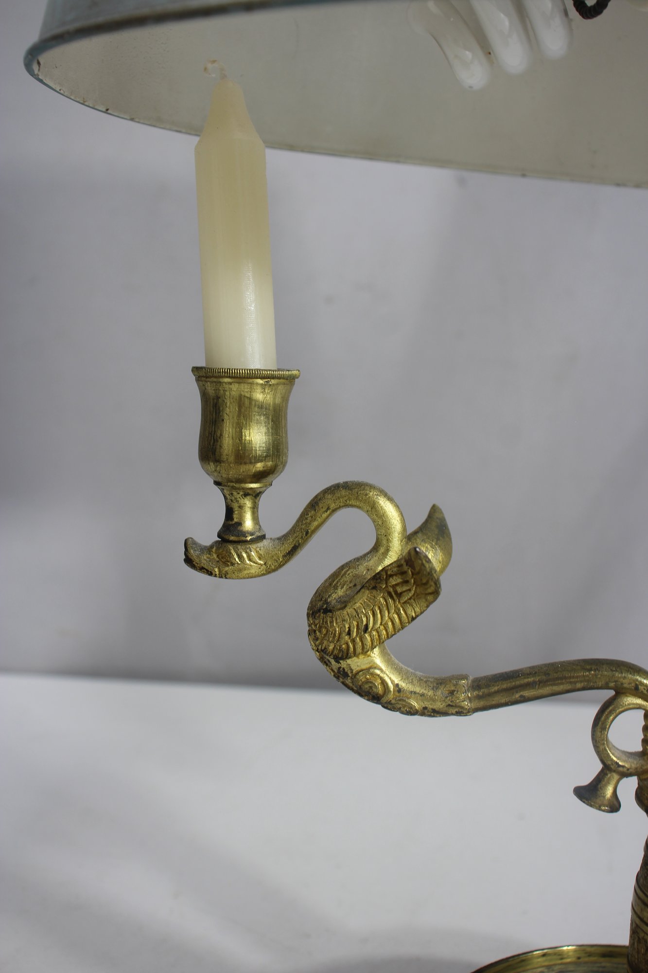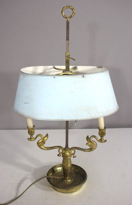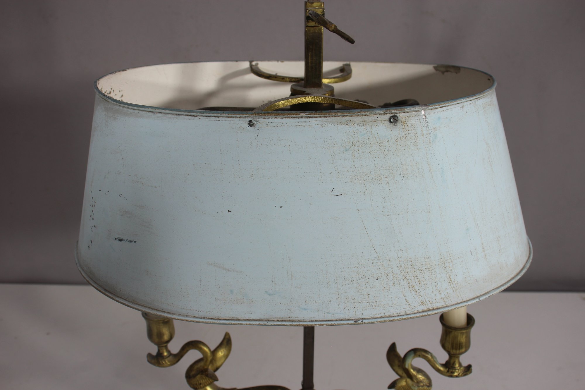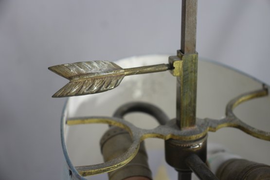 antique French Bouillotte table lamp is a rare and elegant find, featuring a solid brass base with intricate detailing, dual candle-style arms, and an adjustable metal shade. The lamp's arrow finial allows the shade to move up and down, a classic characteristic of Bouillotte-style lamps, originally designed for card-playing tables.