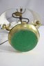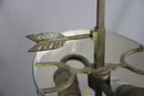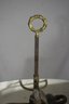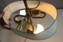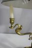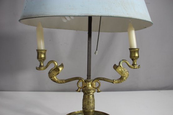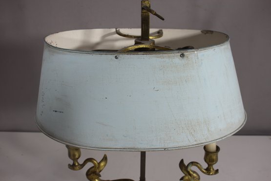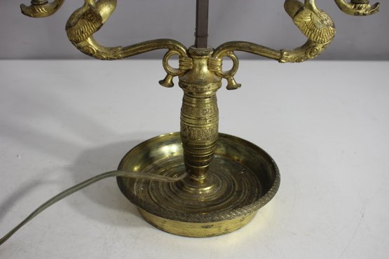 The brass arms are gracefully curved and adorned with swan or serpent-like motifs, adding a regal touch. The aged patina on the brass enhances its antique appeal. The lamp has been converted to electric functionality, making it both a decorative and practical lighting piece.