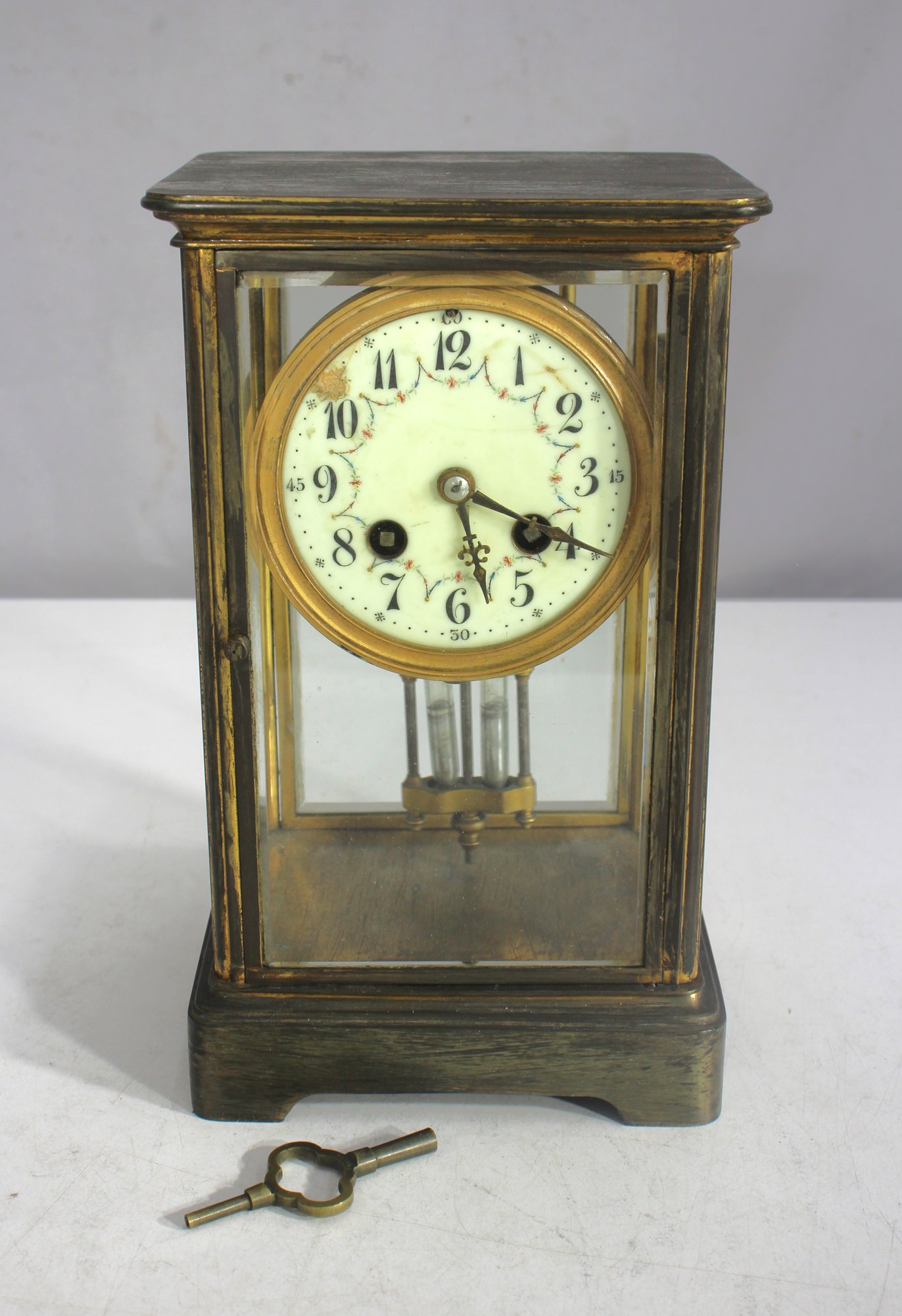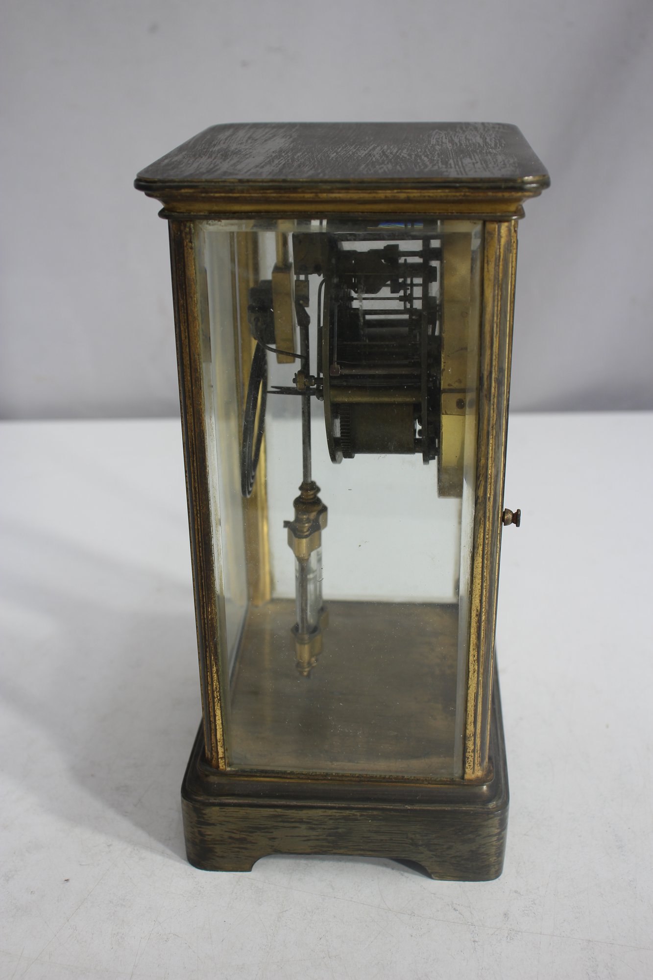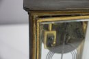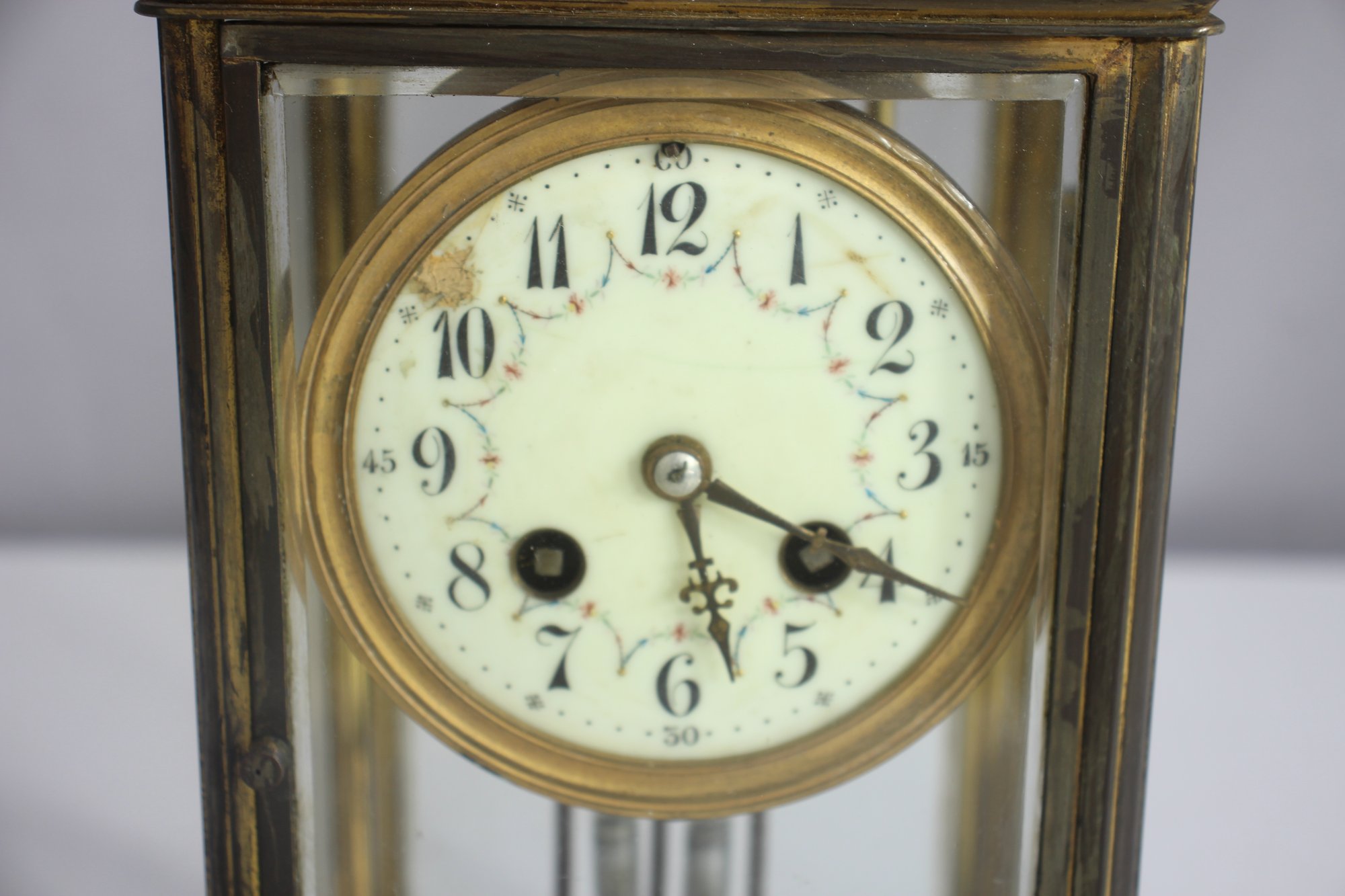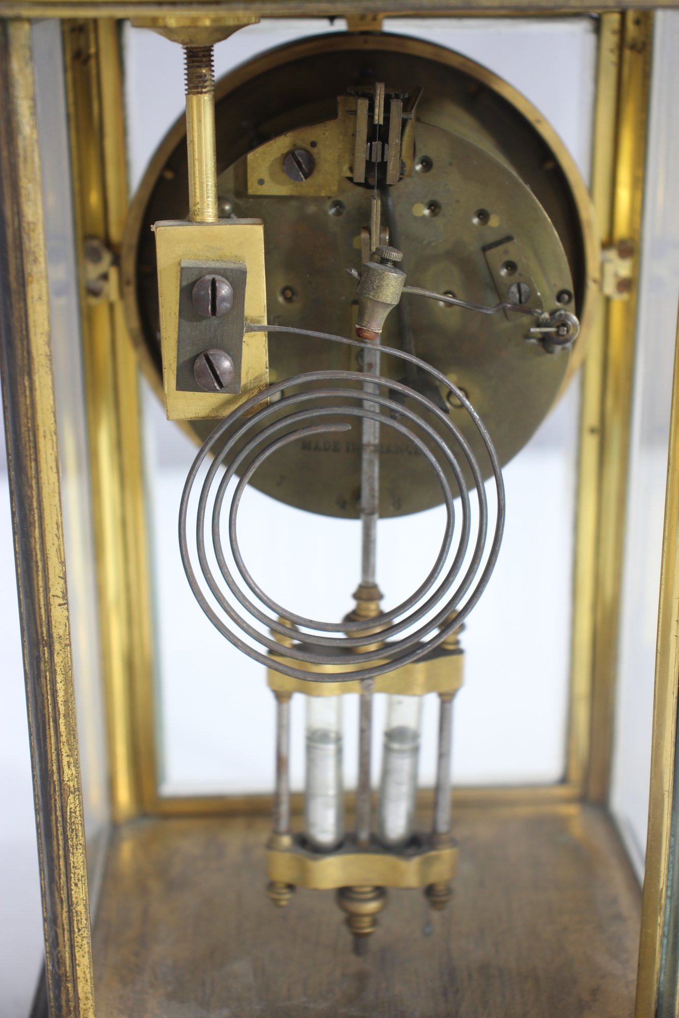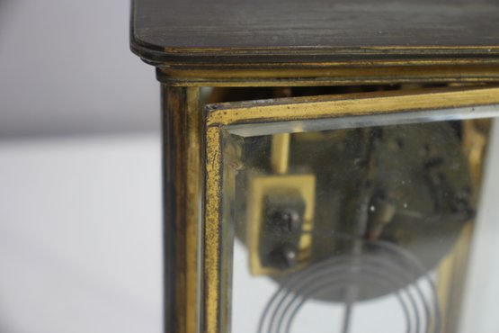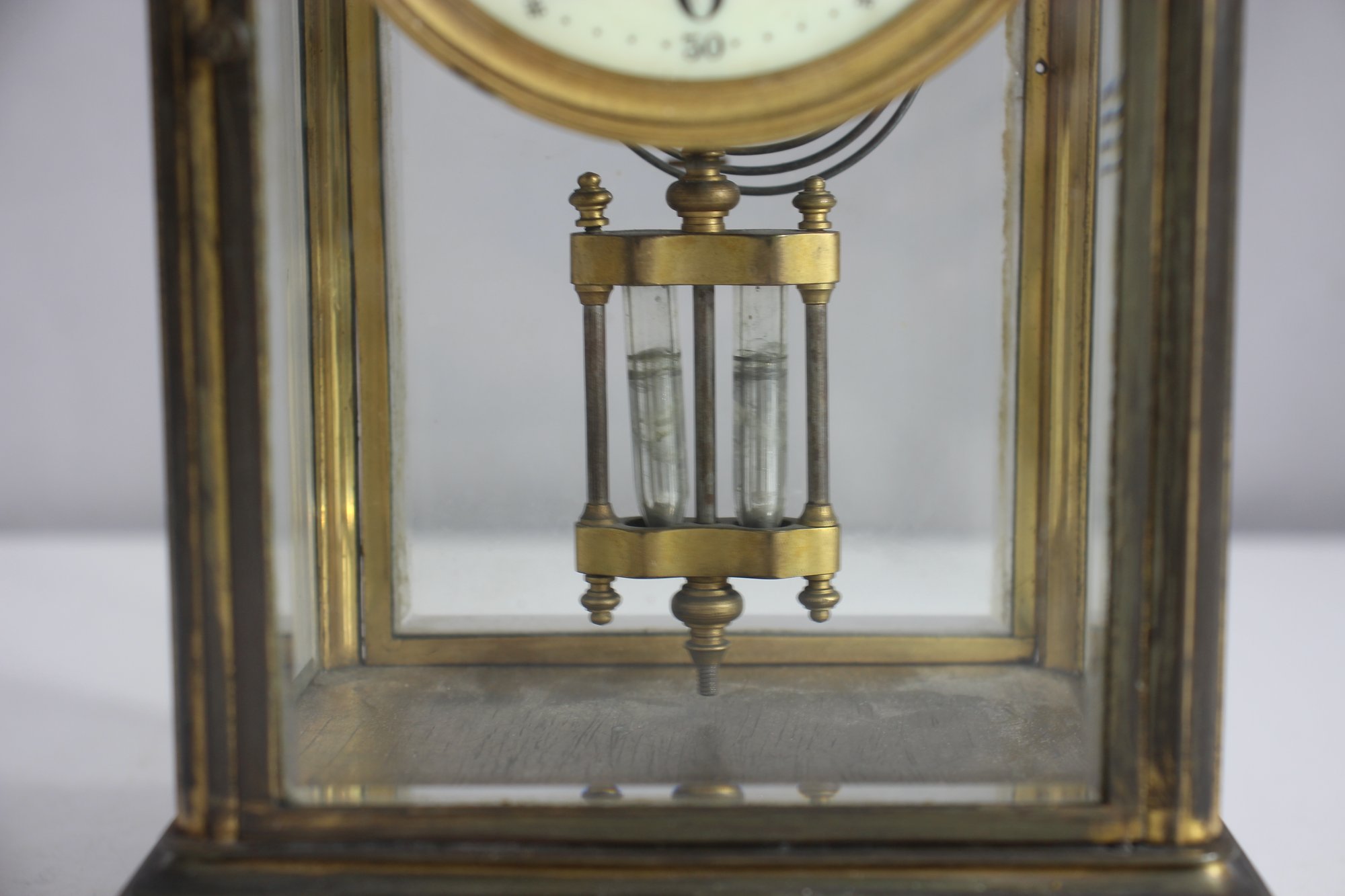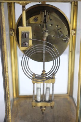 antique French crystal regulator clock features a brass and glass case, a delicate porcelain dial, and a mercury pendulum, making it a stunning collectible for clock enthusiasts and antique lovers alike.