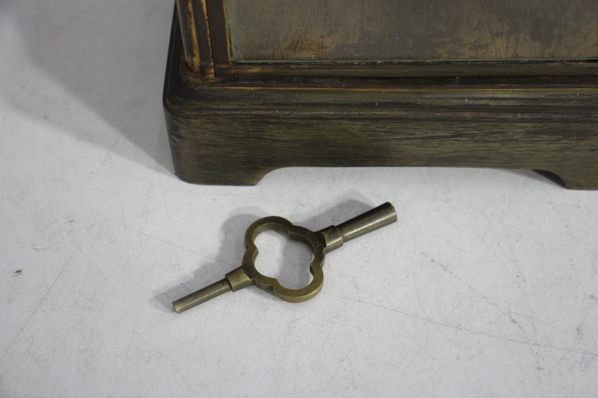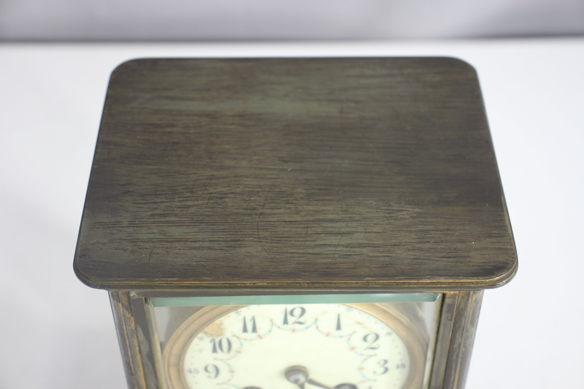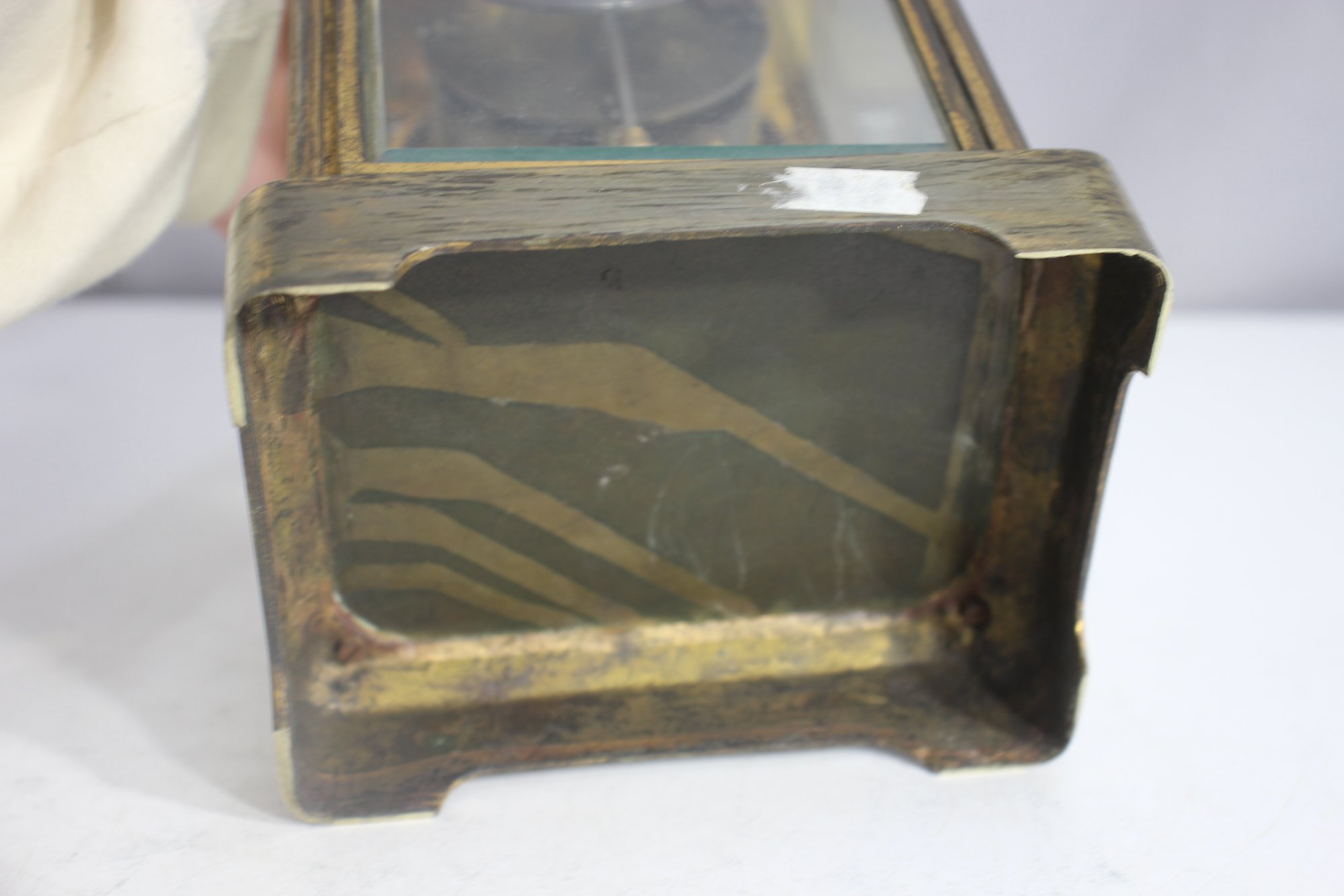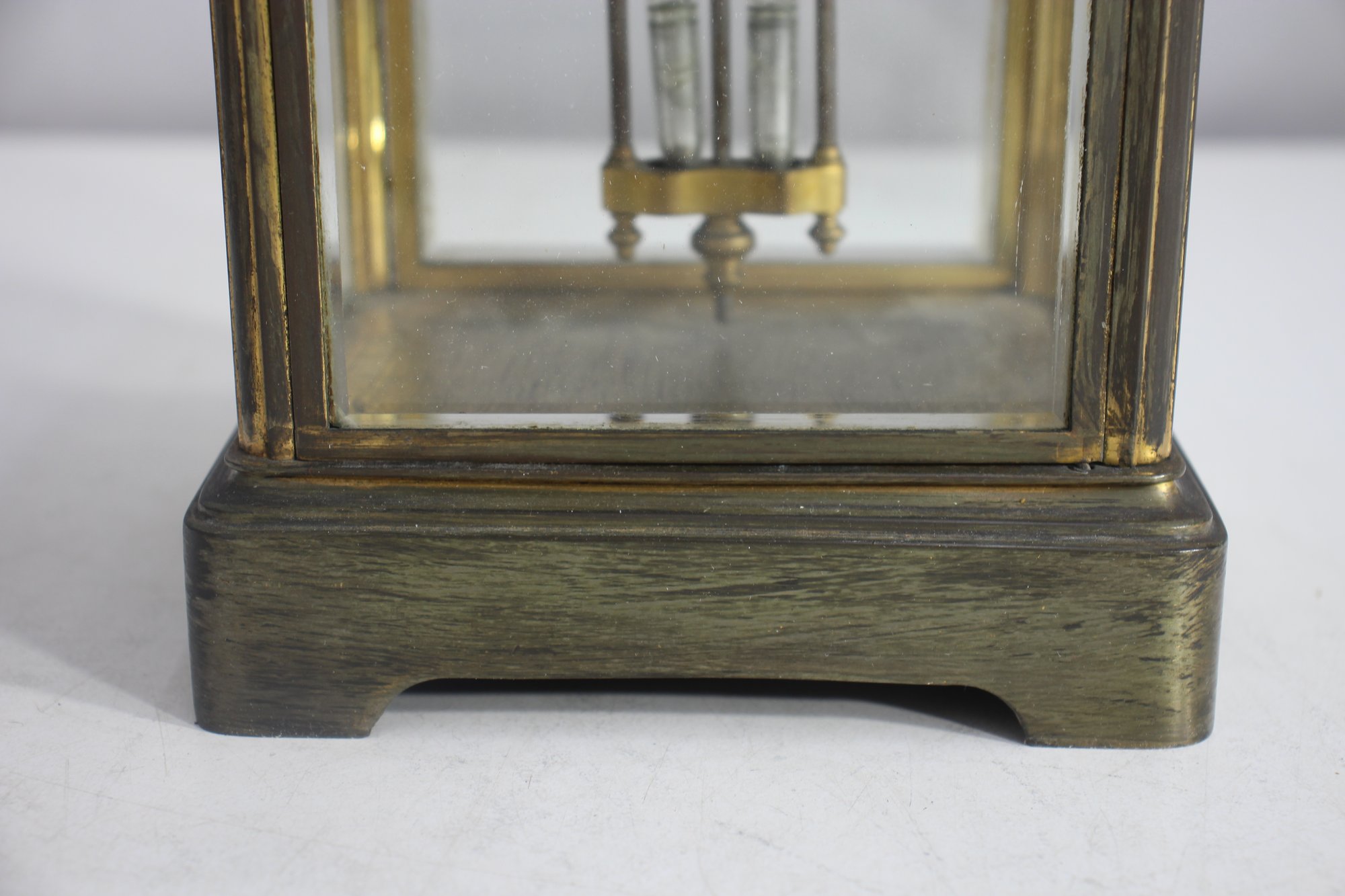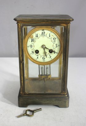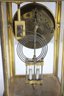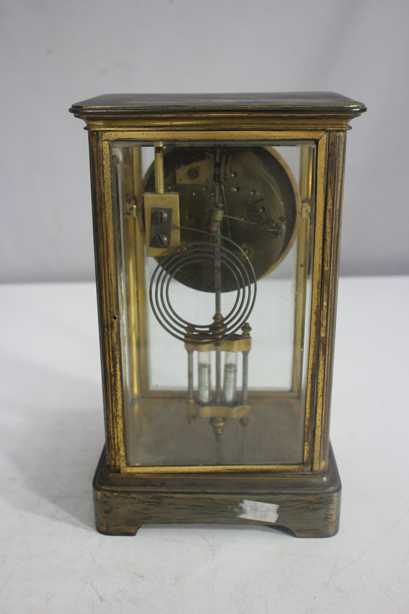 antique French crystal regulator clock features a brass and glass case, a delicate porcelain dial, and a mercury pendulum, making it a stunning collectible for clock enthusiasts and antique lovers alike.