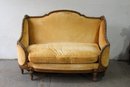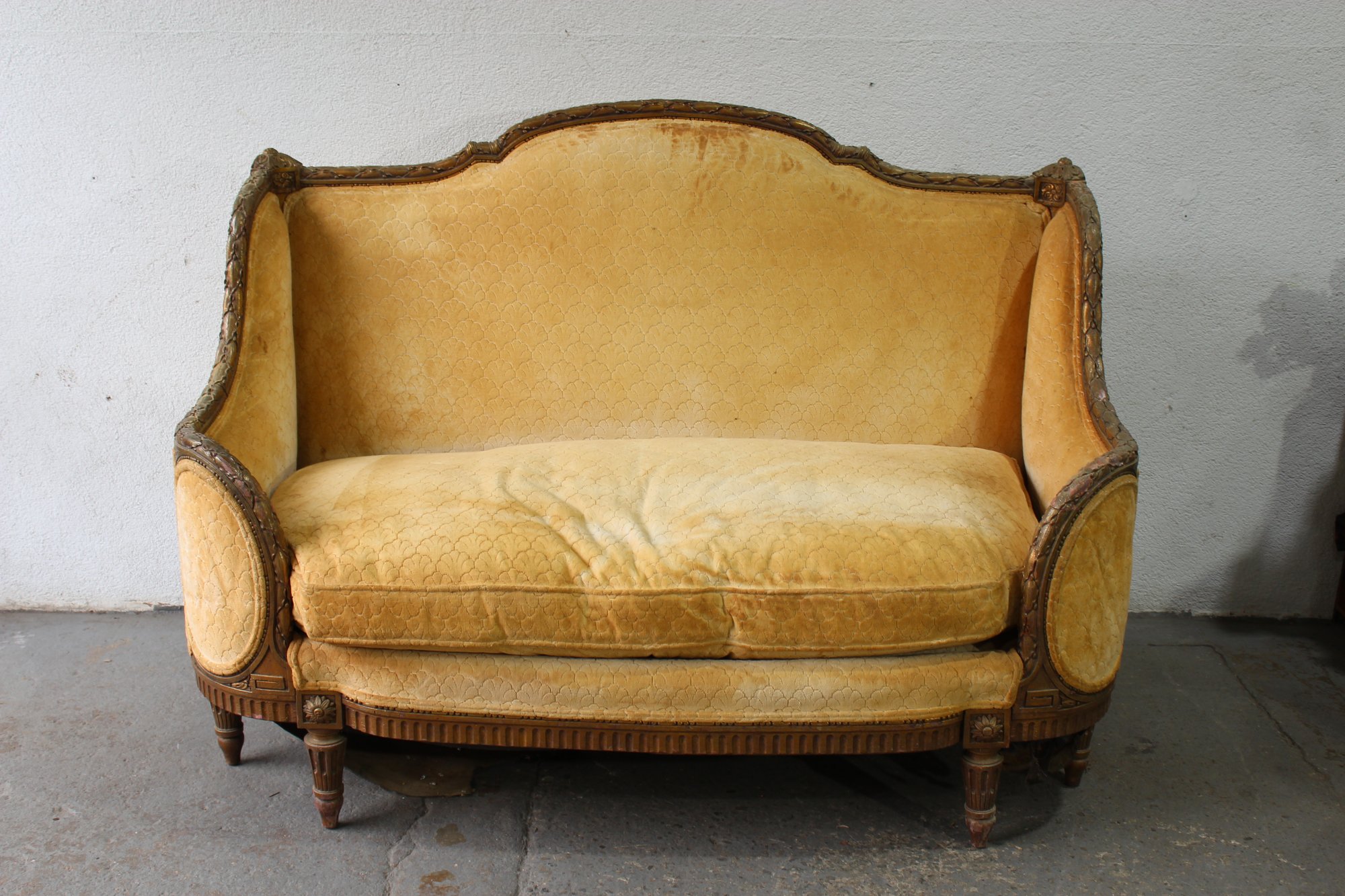 This exquisite antique French settee features a beautifully carved wooden frame with floral and geometric detailing, embodying the elegance of classic French design. The settee boasts a high back and graceful curved arms, adding a regal and refined presence to any space. The original yellow upholstery is richly textured, adding warmth and character to the piece, though it shows signs of wear and would benefit from reupholstering or restoration.