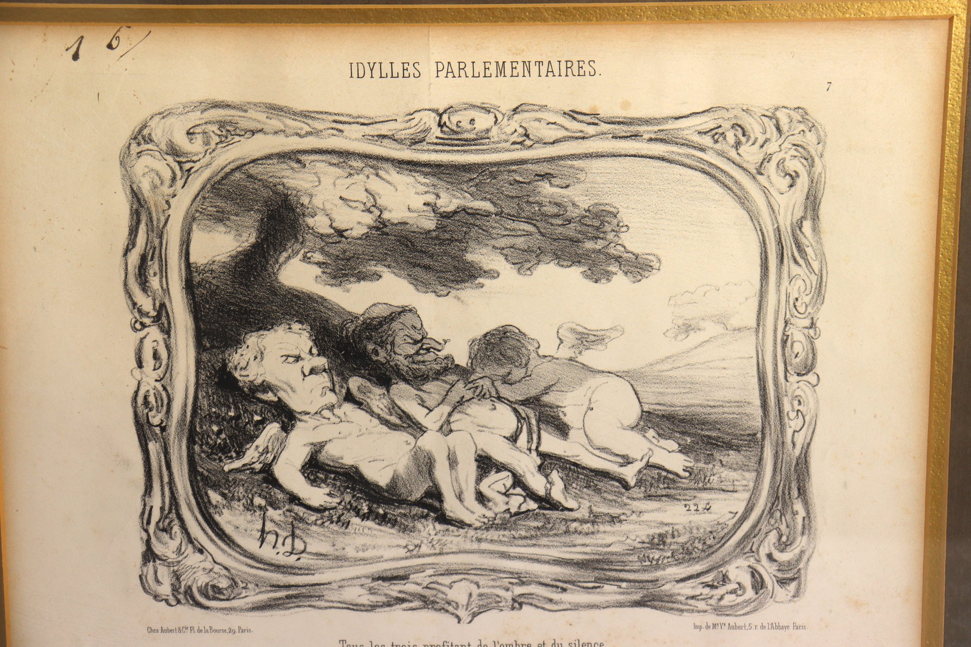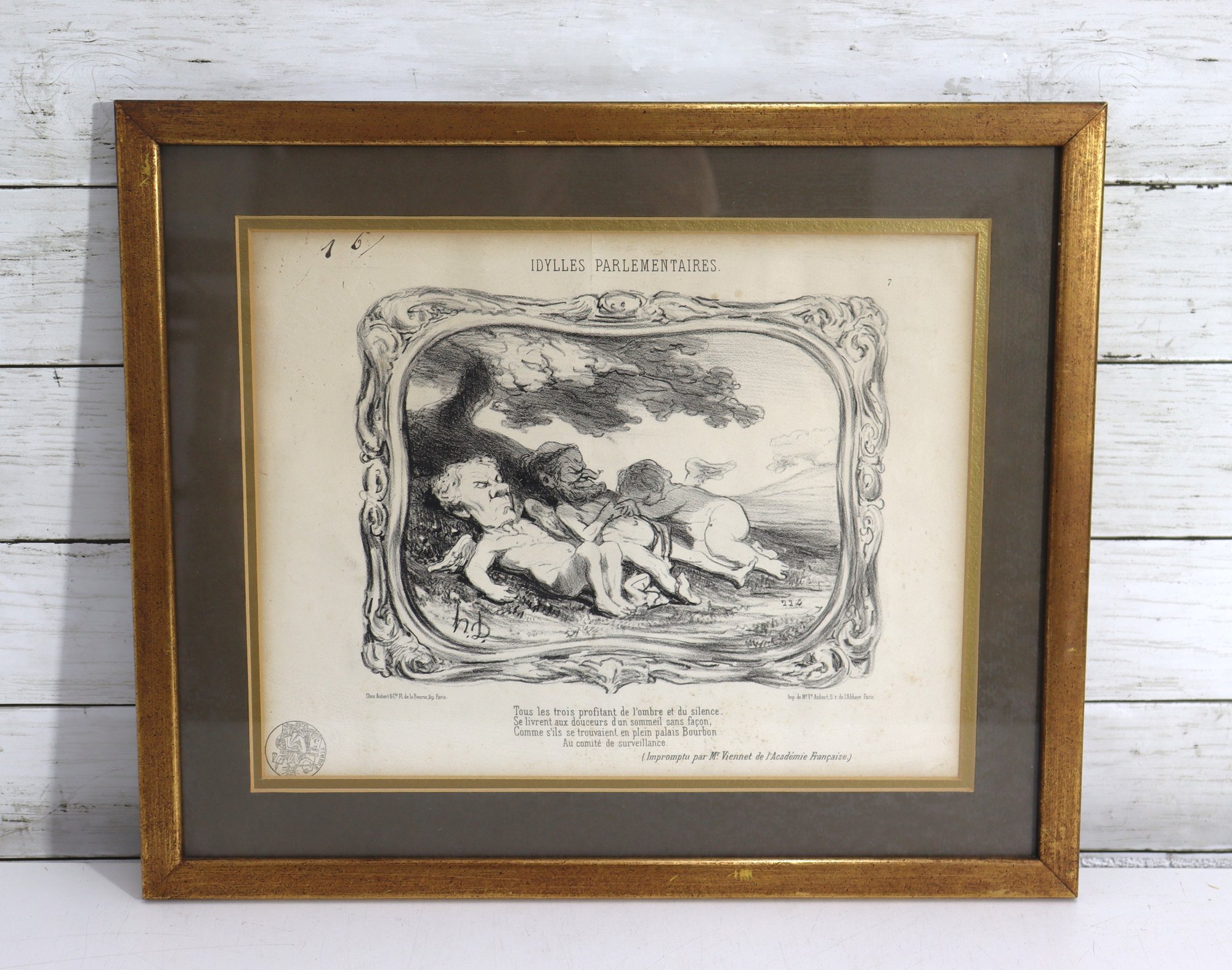 Wonderful antique French lithograph titled "Idylles Parlementaires", professionally framed and matted. This piece features classic 19th century satirical political artwork in black & white, showing three figures resting in an idyllic outdoor scene. Includes French text / verse below the image with an engraved border-style design.