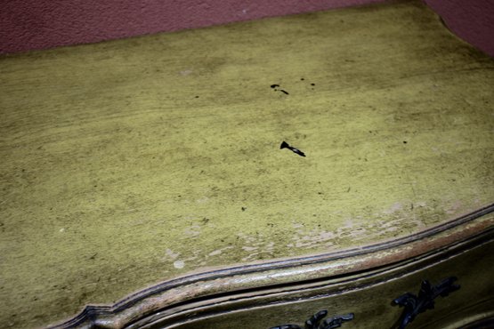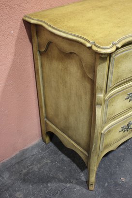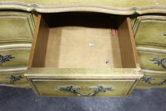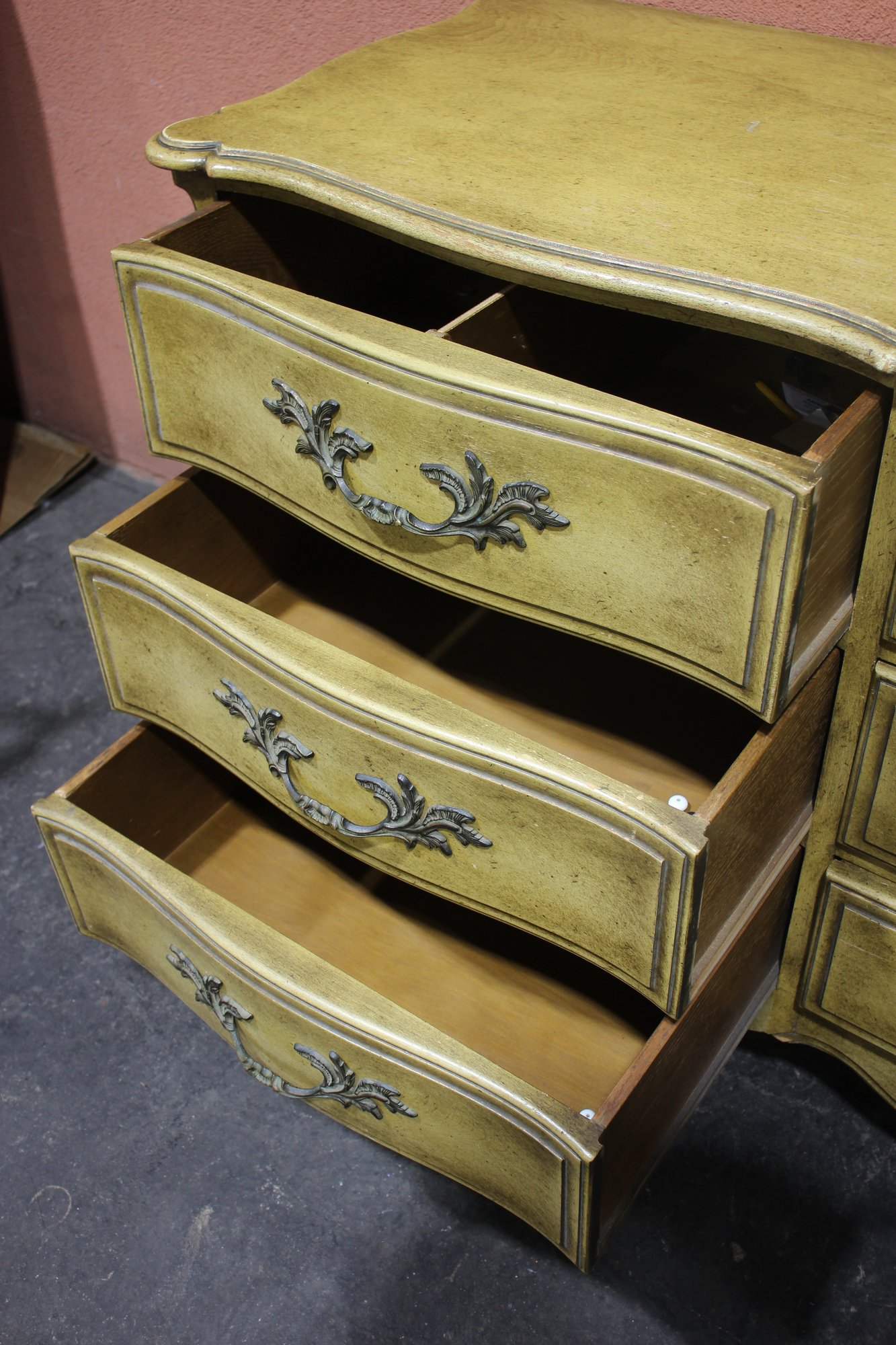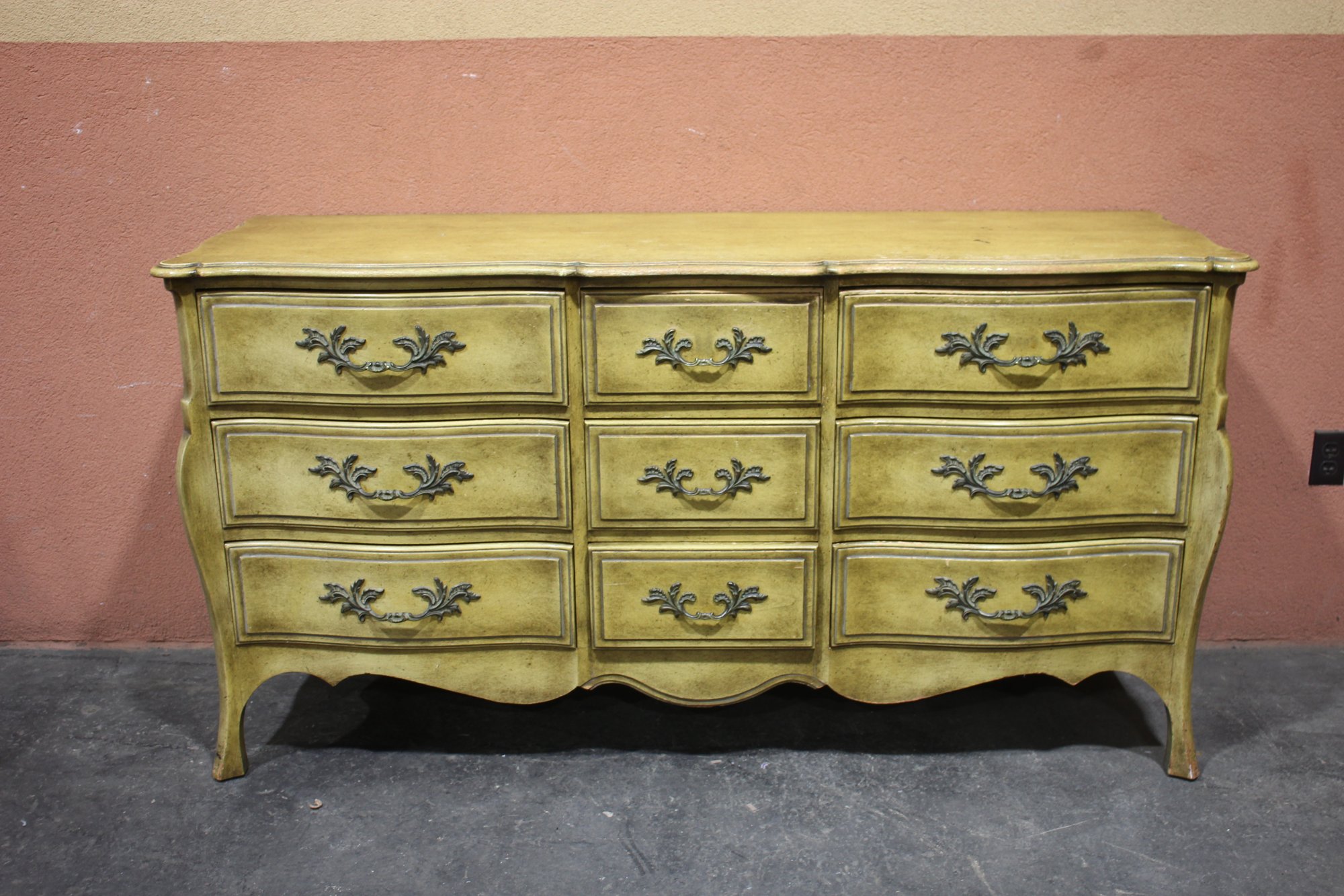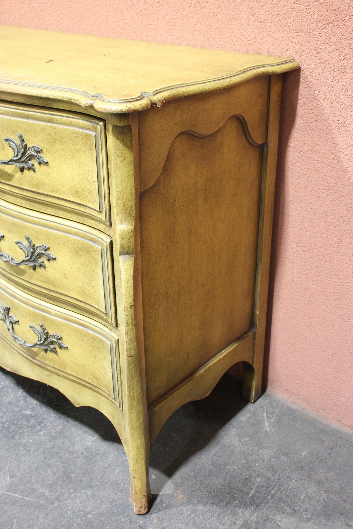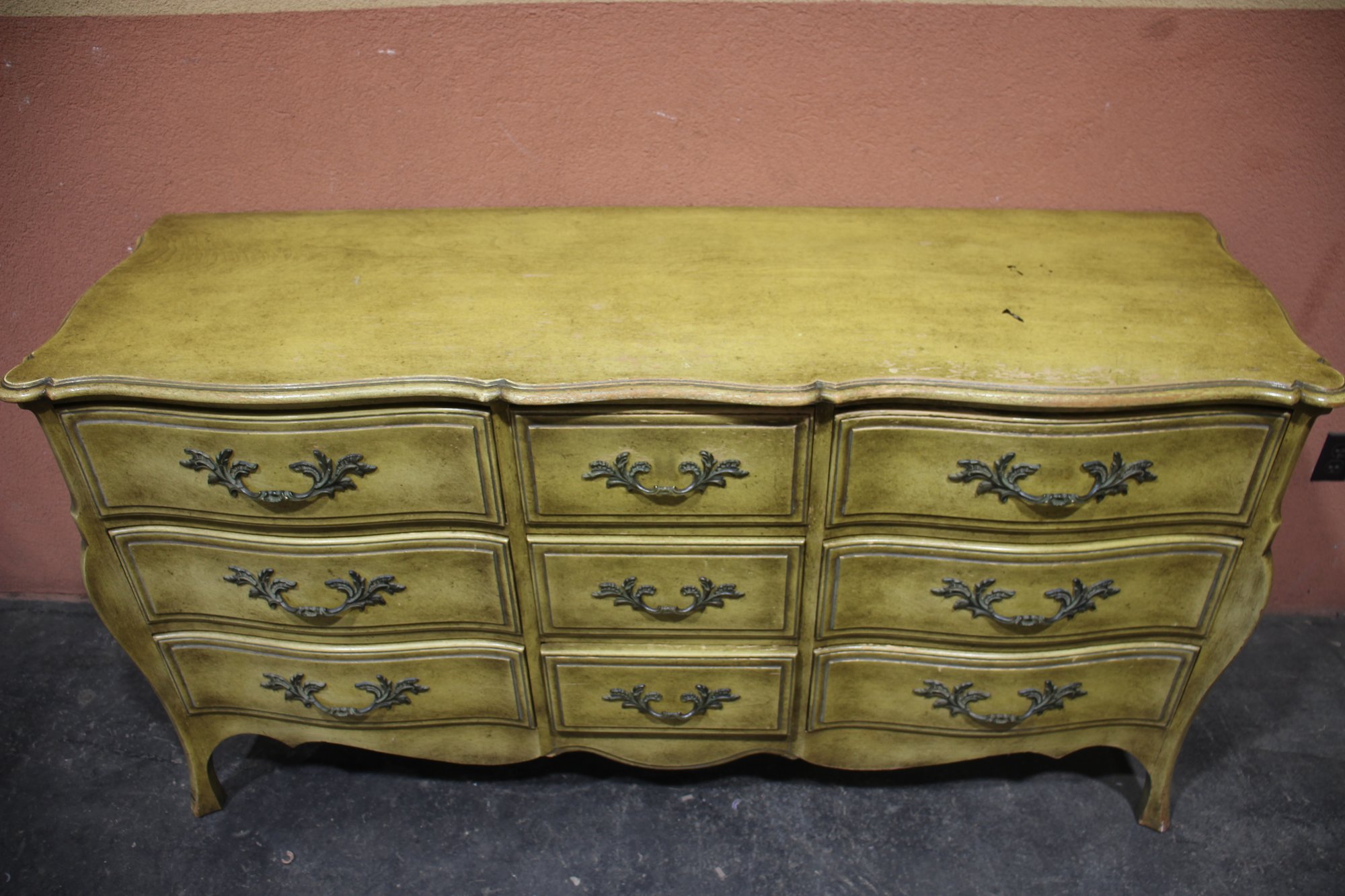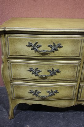 Gorgeous, Antique French Provincial Dresser/ Chest of Drawers by Rader New York. In the style of a Louis XV commode. Classic & timeless with attractive edging and intricate scallop edging. Beautiful and ornate dresser pulls complete the look.