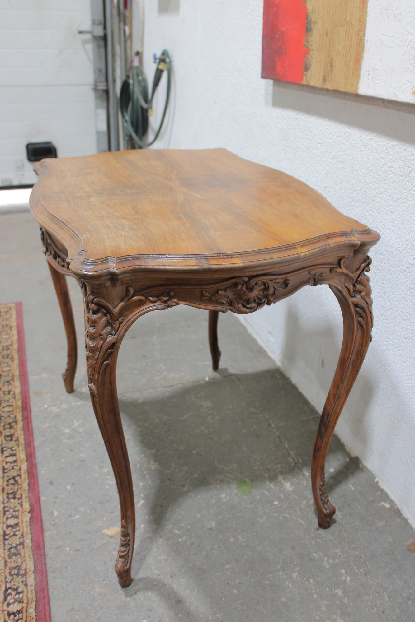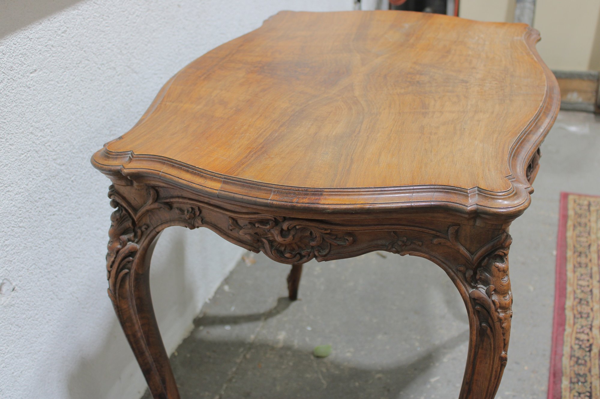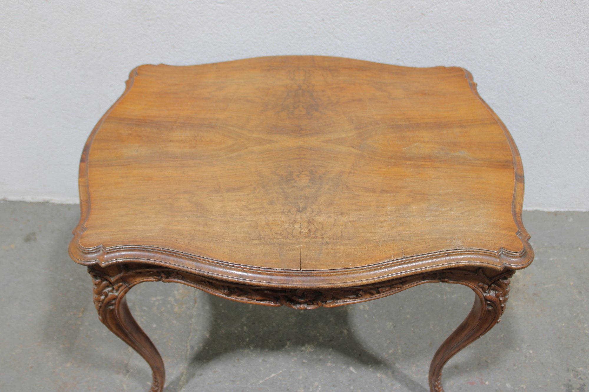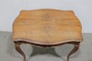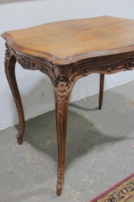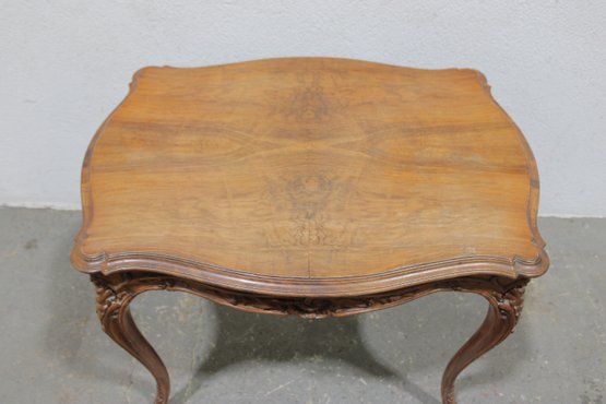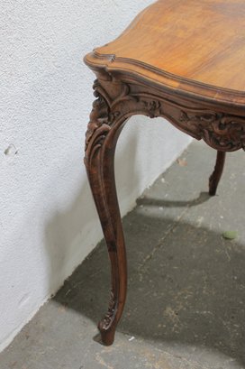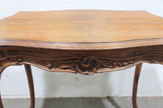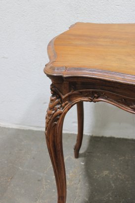 a beautiful antique French-style carved wood desk or side table, featuring elegant craftsmanship and classic European styling. The table showcases a shaped top with decorative wood grain, complemented by a finely carved apron with scroll and floral motifs across the front.