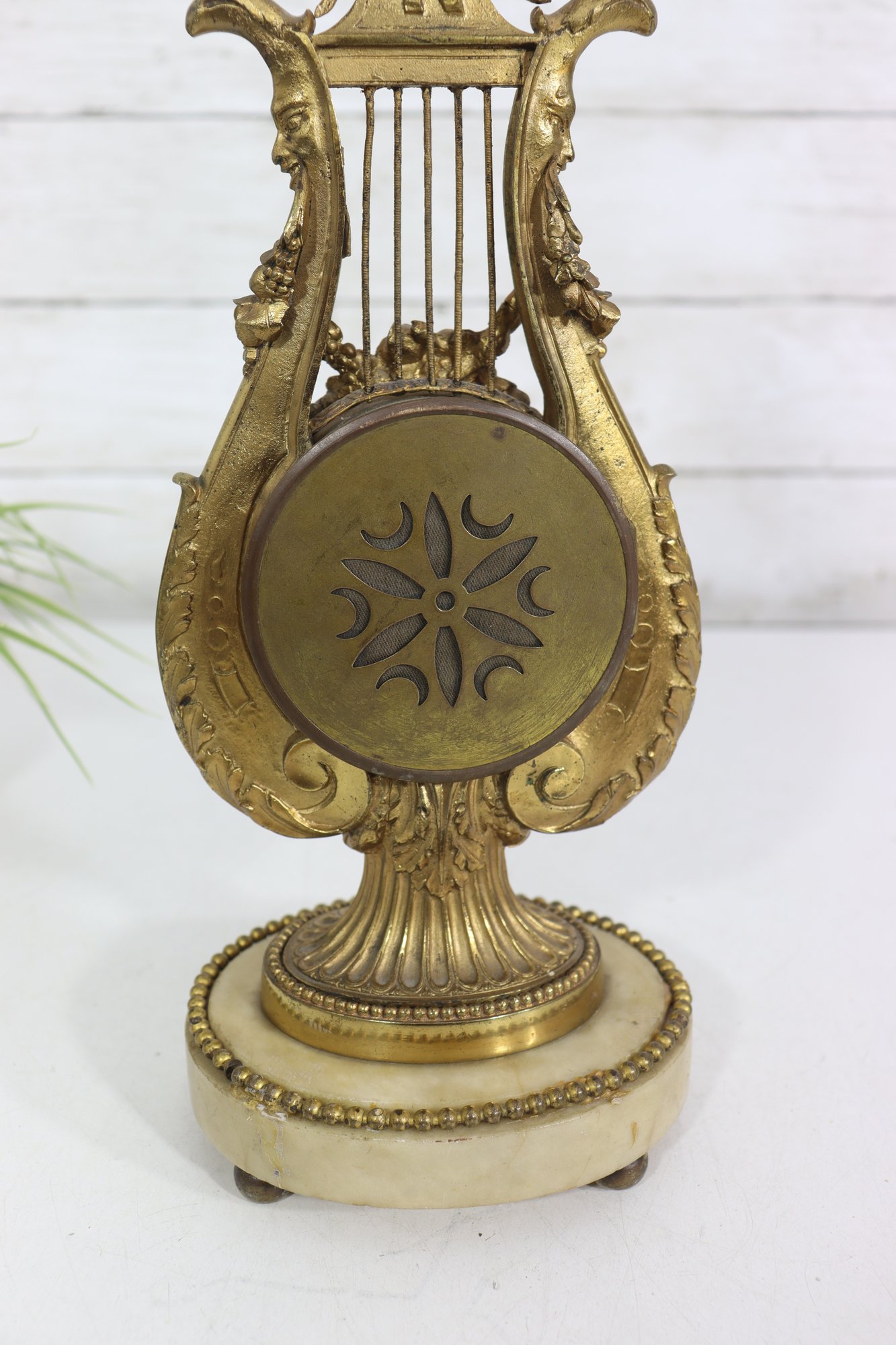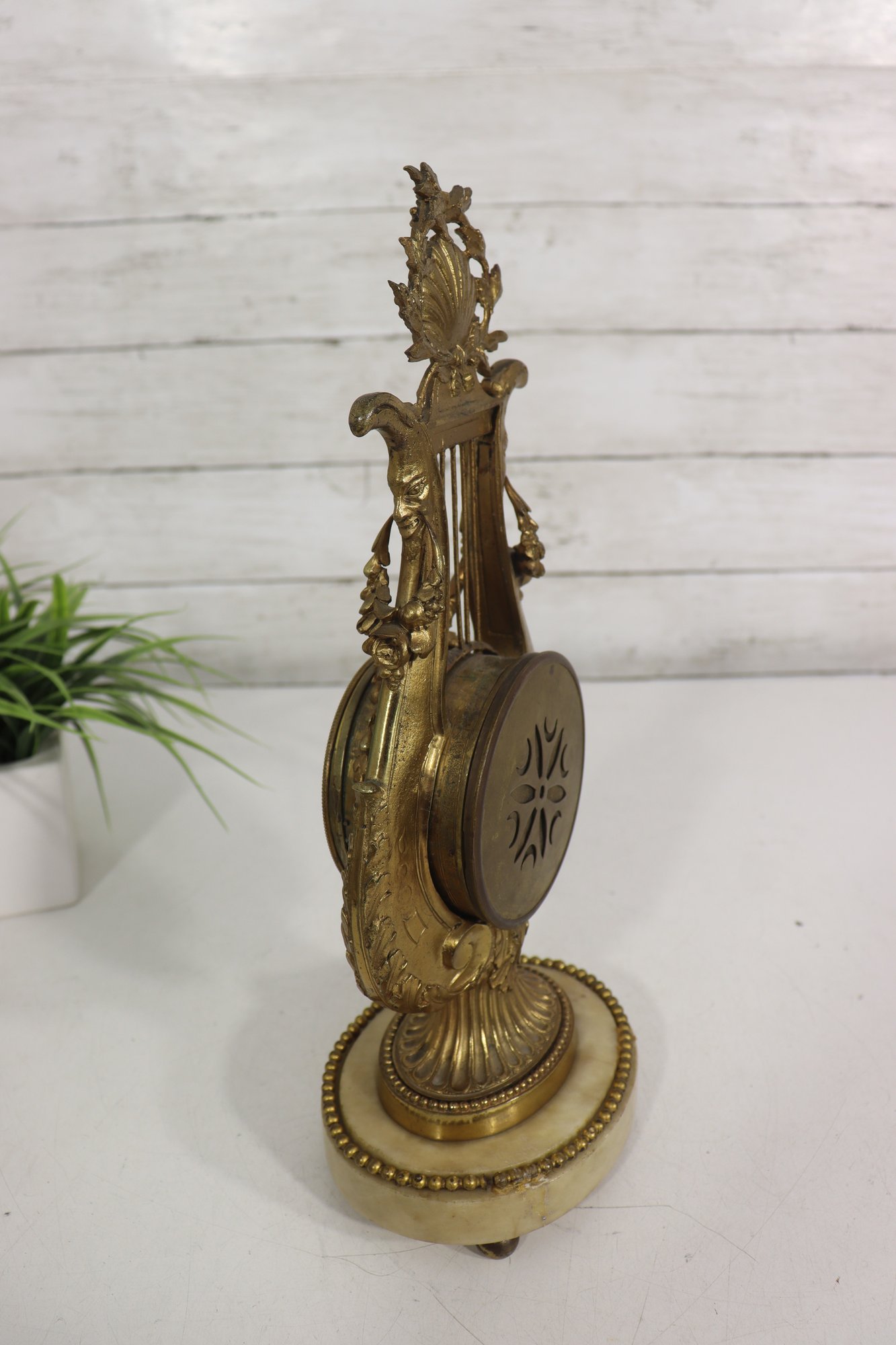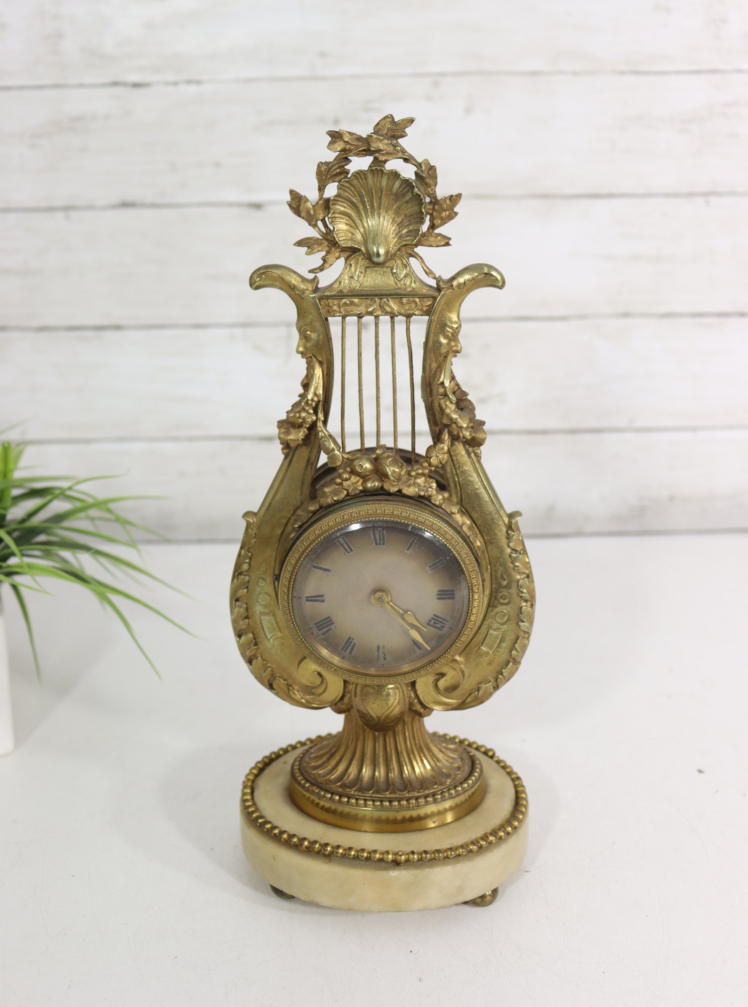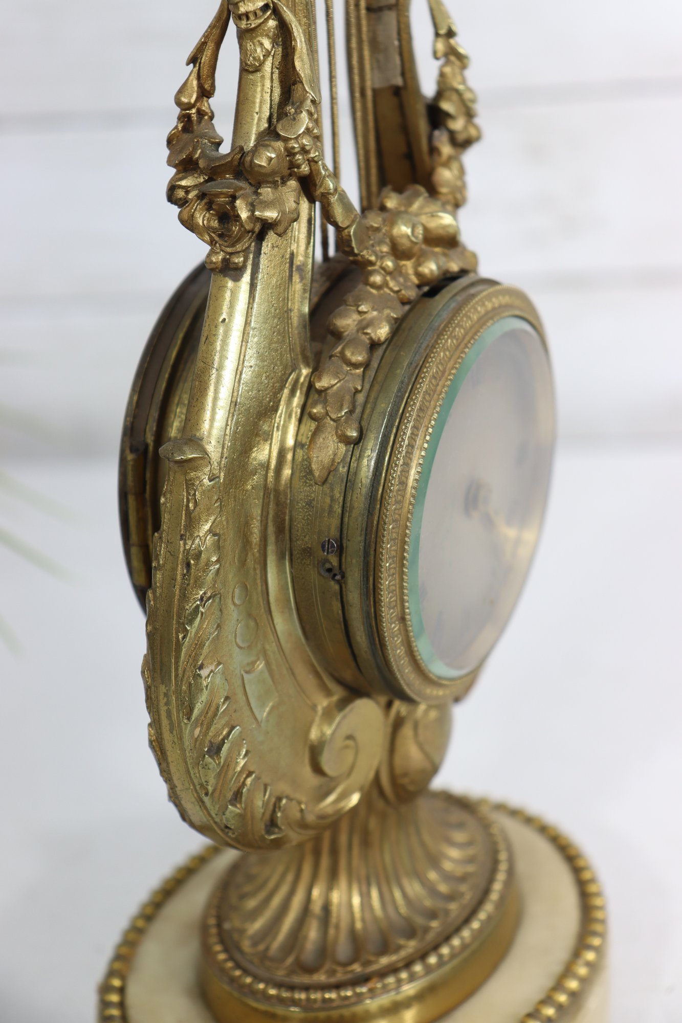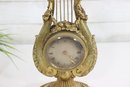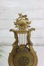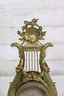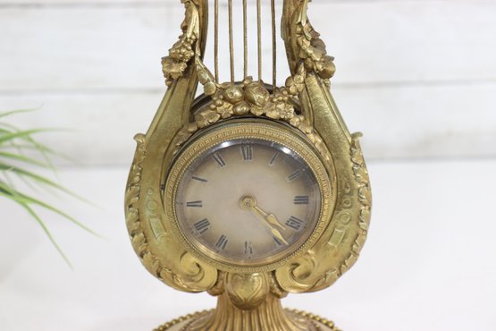 ornate antique mantel clock crafted in a classical lyre form, featuring richly detailed gilt metal decoration with scrolling motifs, floral accents, and a sculptural crest. The clock is mounted on a light-colored marble base with beaded trim and raised feet, giving the piece both visual presence and stability.
