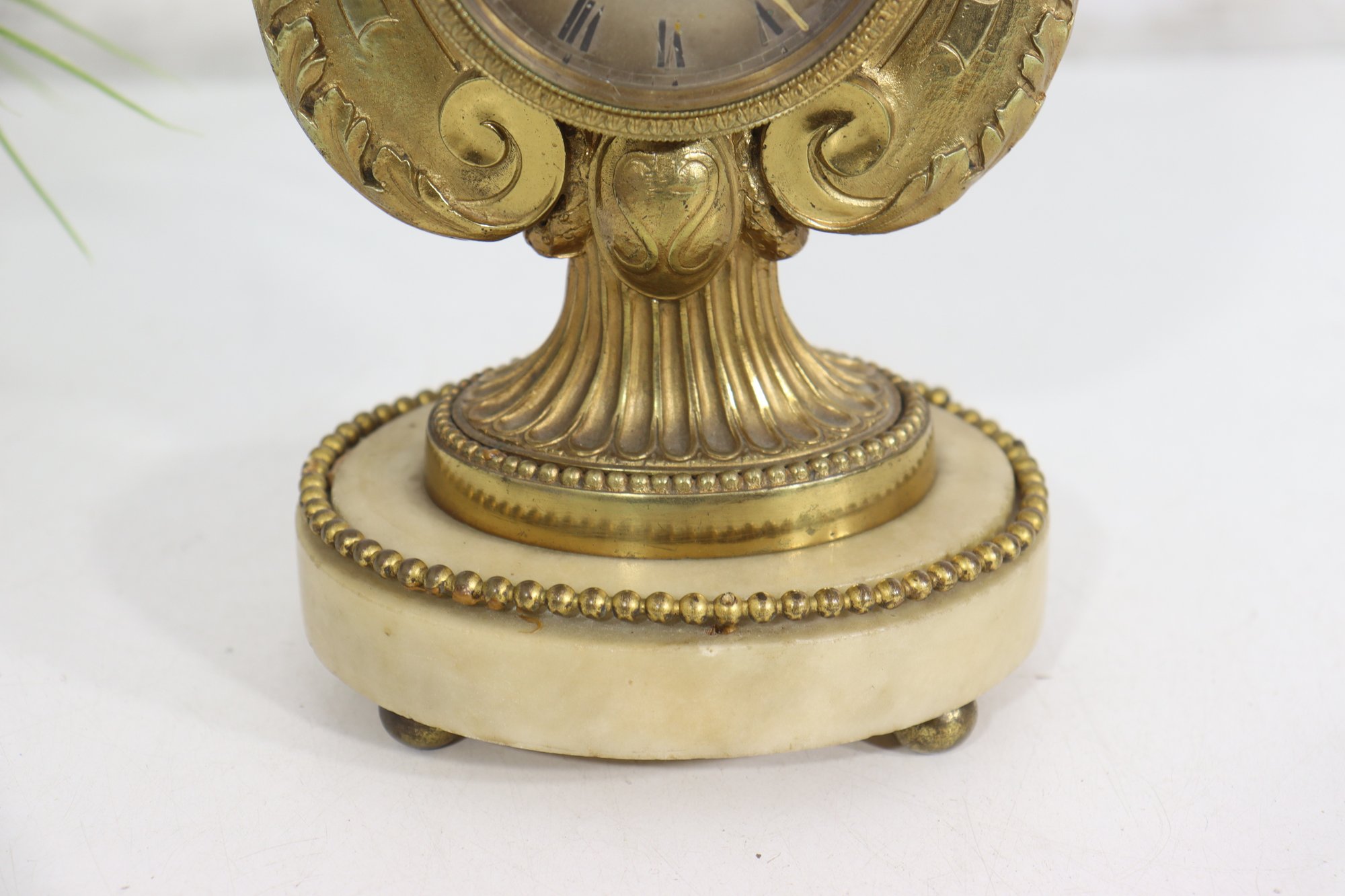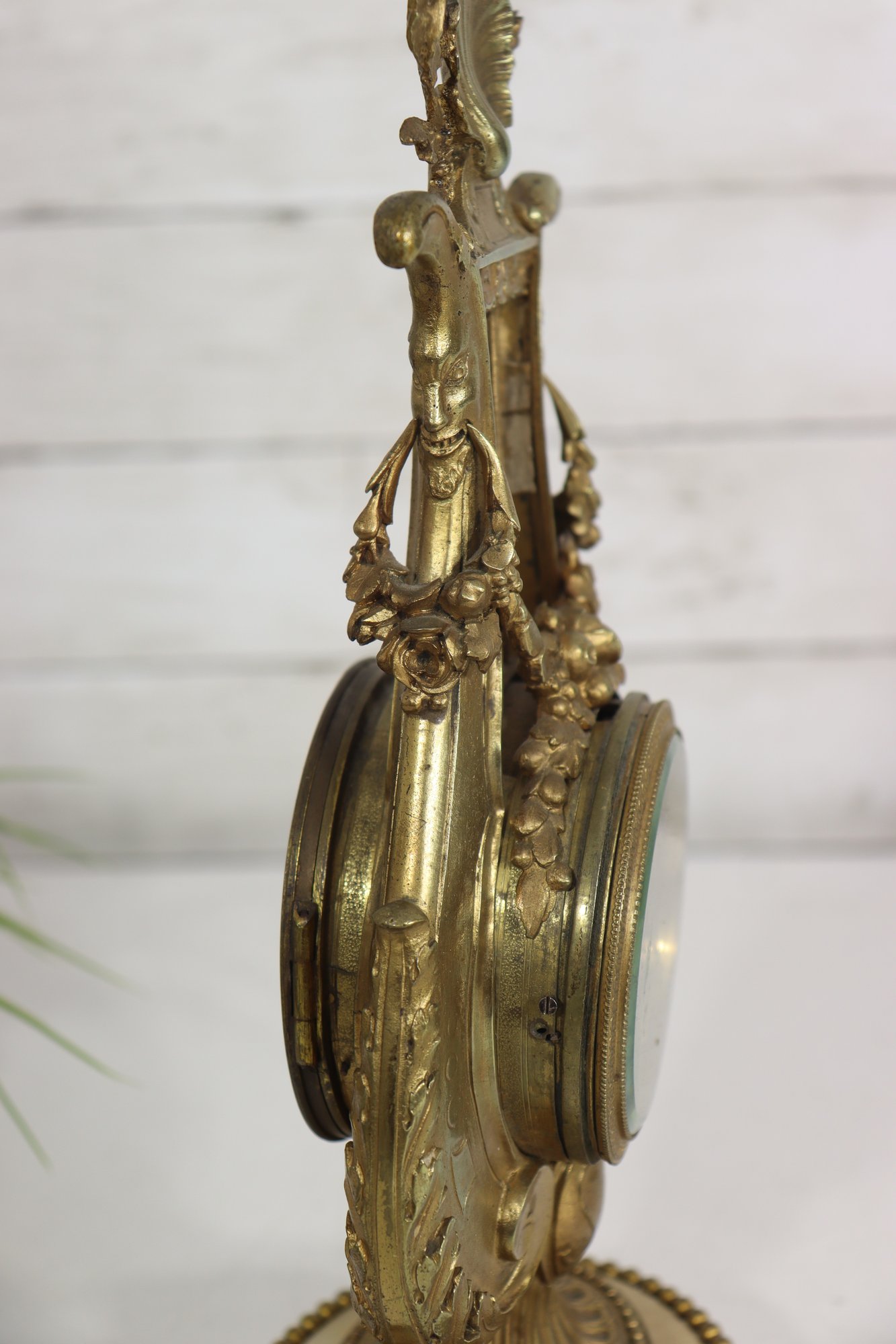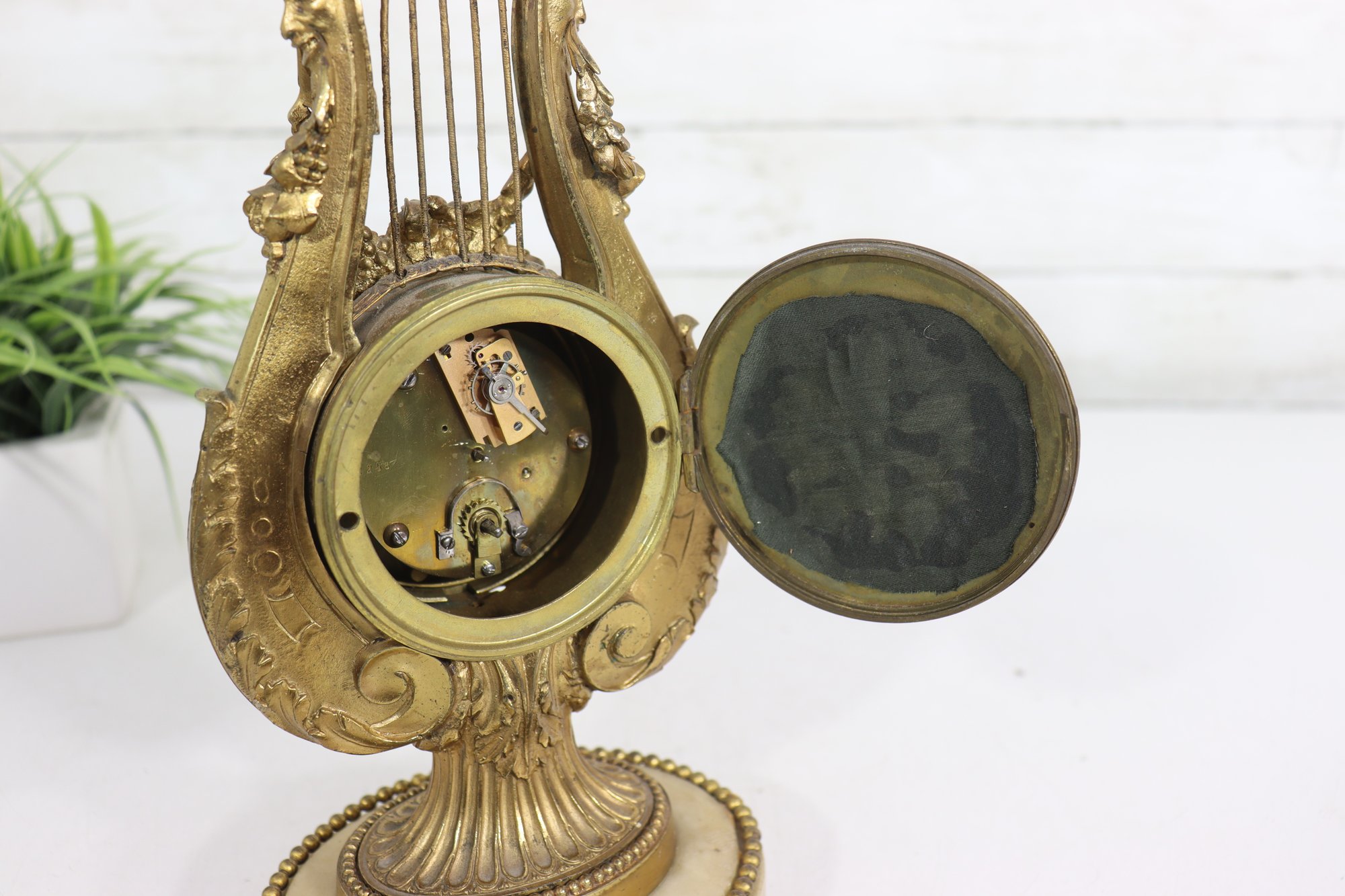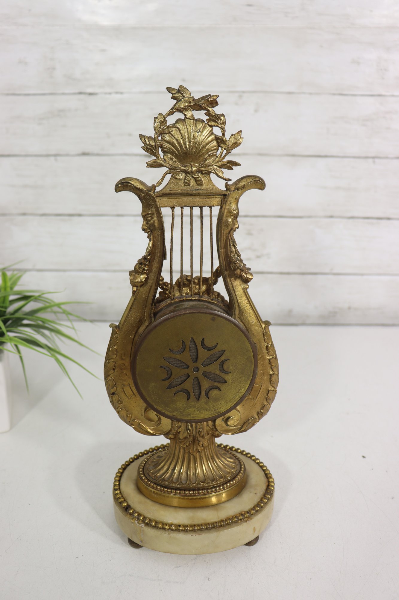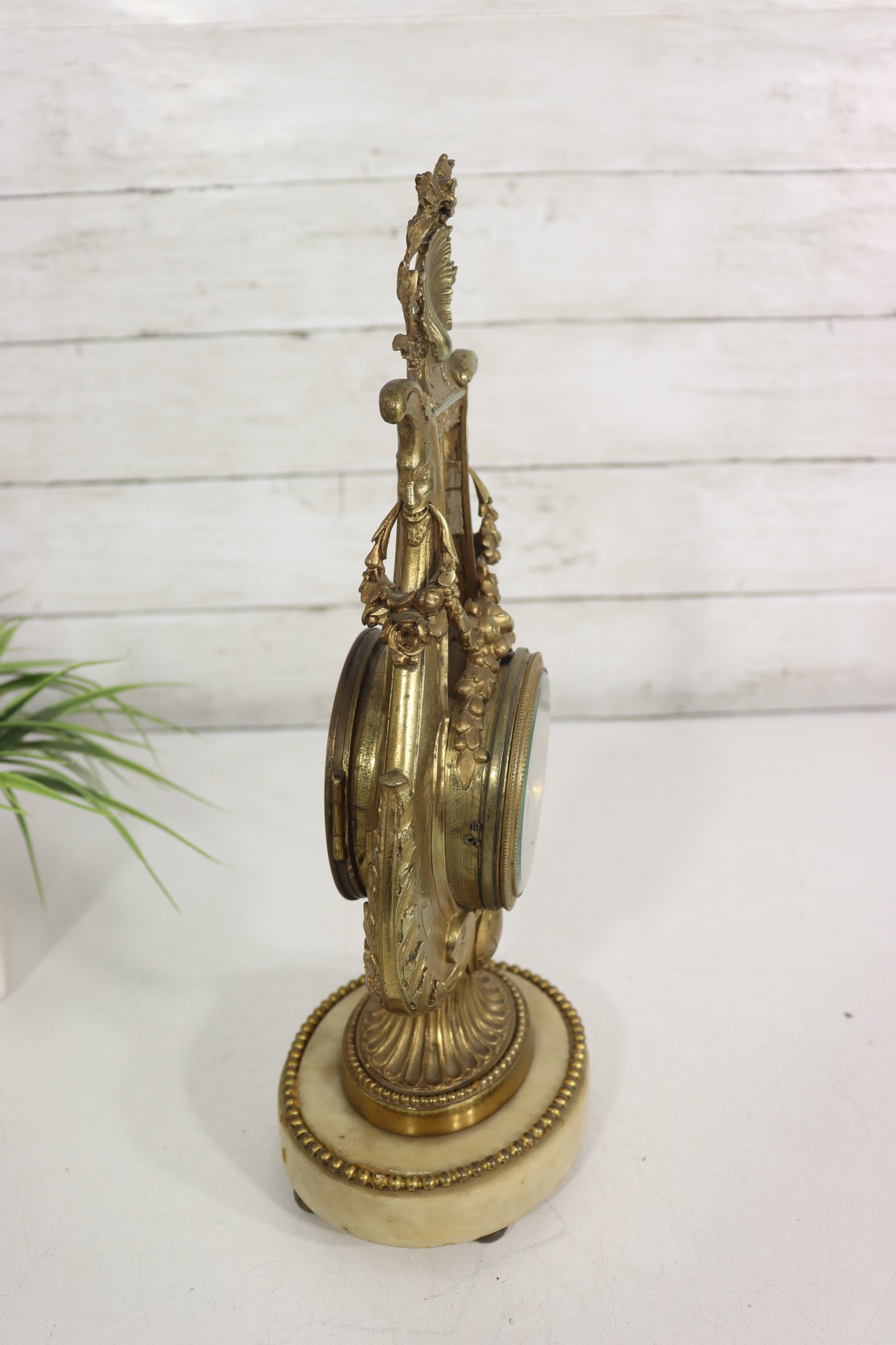 ornate antique mantel clock crafted in a classical lyre form, featuring richly detailed gilt metal decoration with scrolling motifs, floral accents, and a sculptural crest. The clock is mounted on a light-colored marble base with beaded trim and raised feet, giving the piece both visual presence and stability.