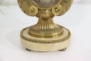The circular clock face displays Roman numeral hour markers behind a glass cover. The hinged front bezel opens to reveal the mechanical movement inside, making this a wonderful example of traditional decorative horology inspired by French Neoclassical design.