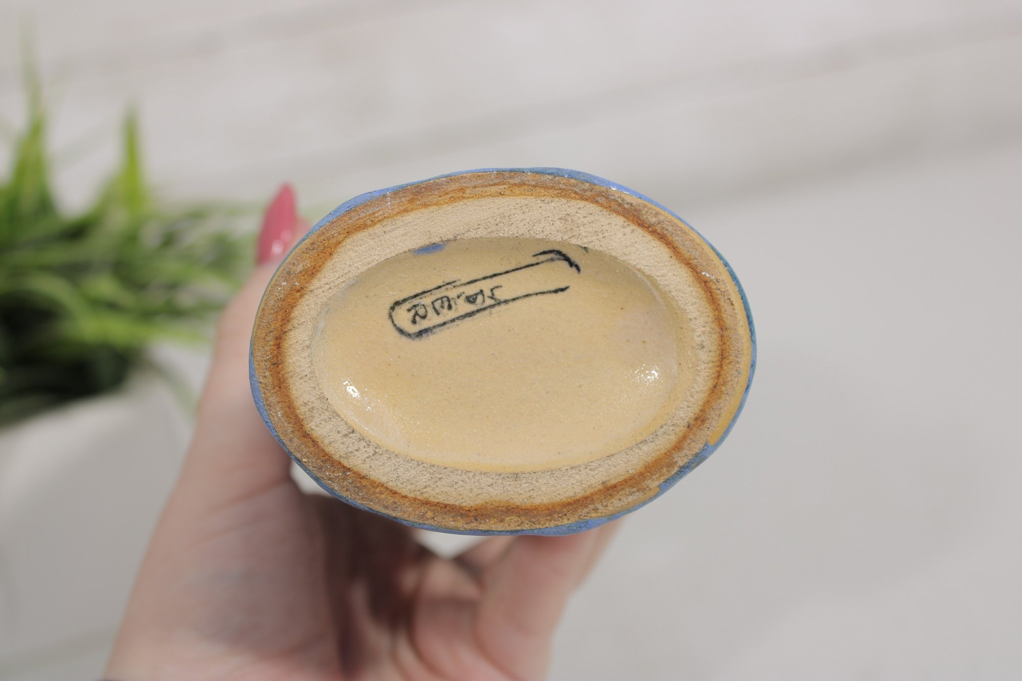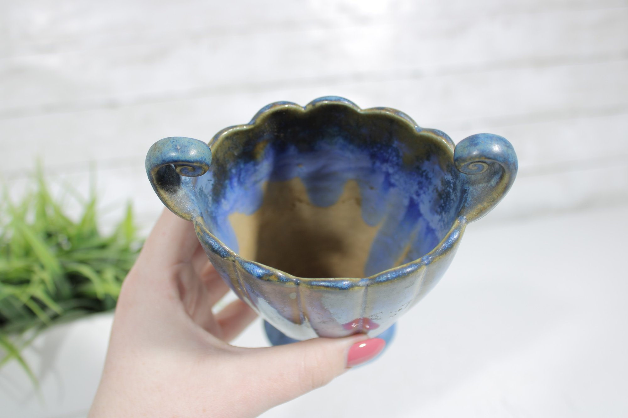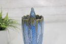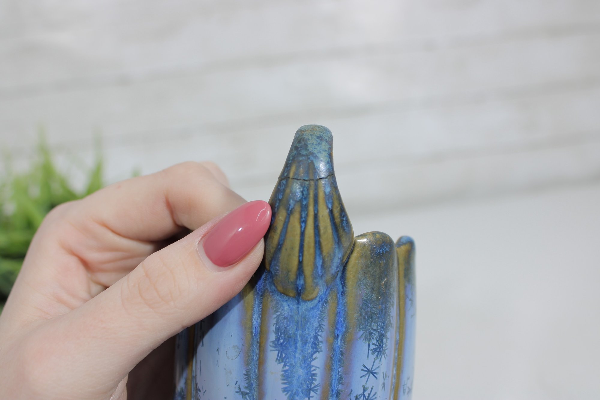 The glaze displays a stunning blend of deep blue tones with golden highlights, creating a luminous, organic surface typical of Fulper’s sought-after art pottery. The interior carries warm, earthy tones, complementing the exterior finish. The base is marked, consistent with Fulper production.
