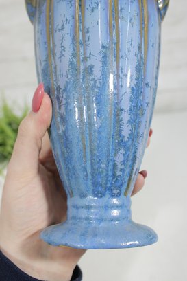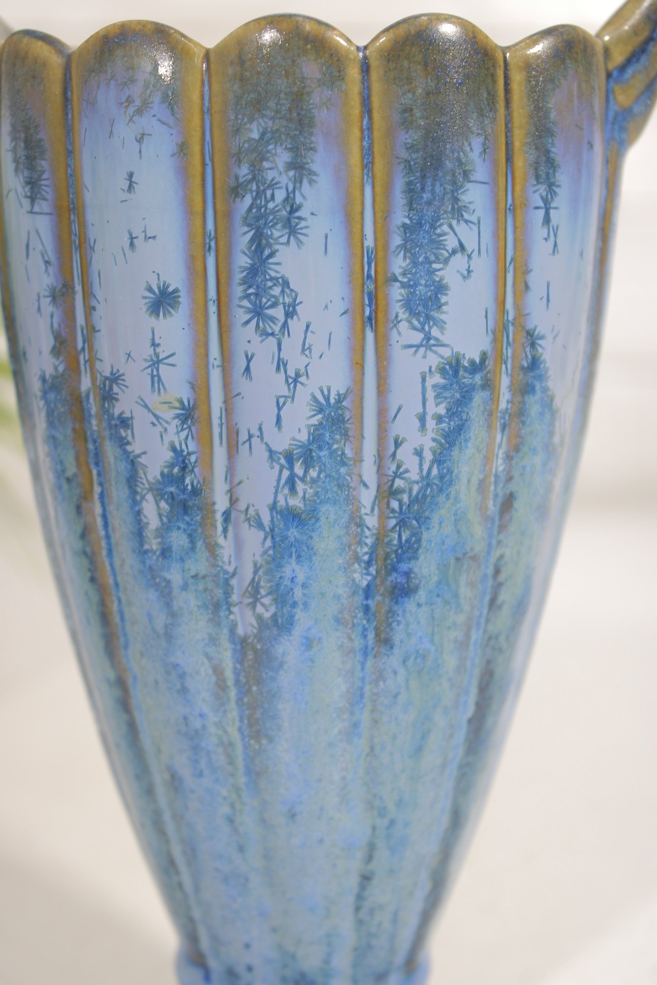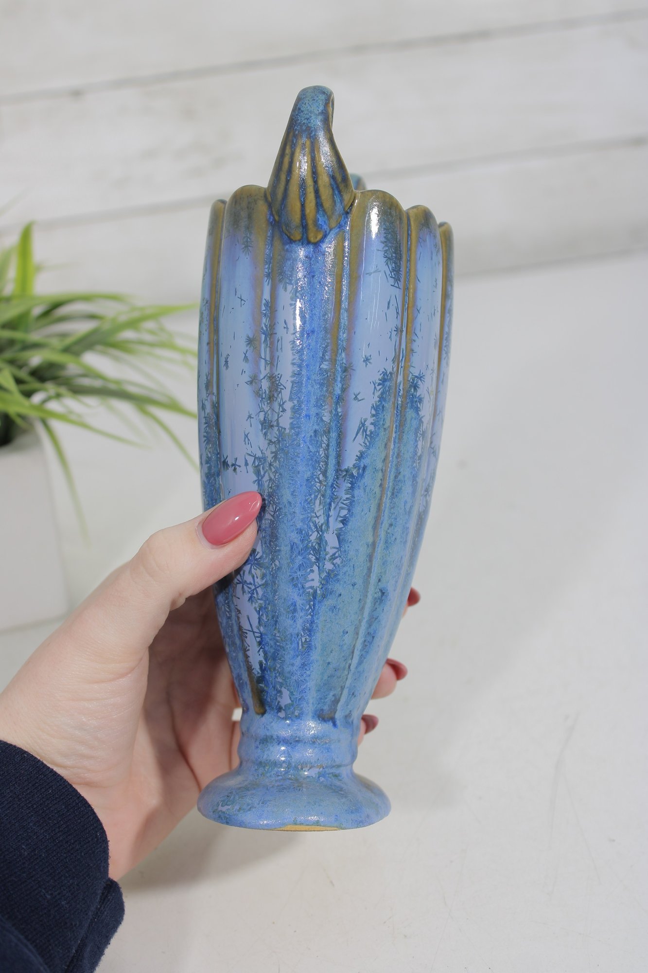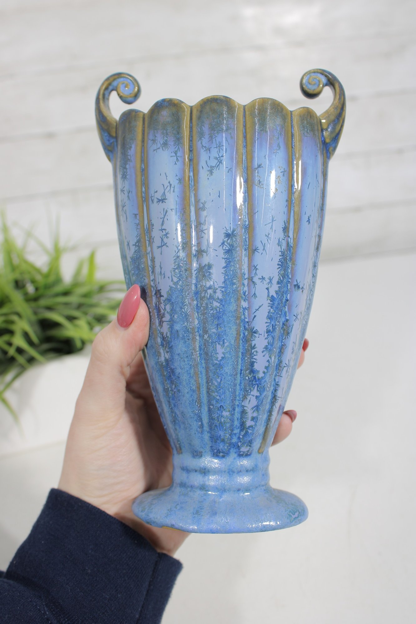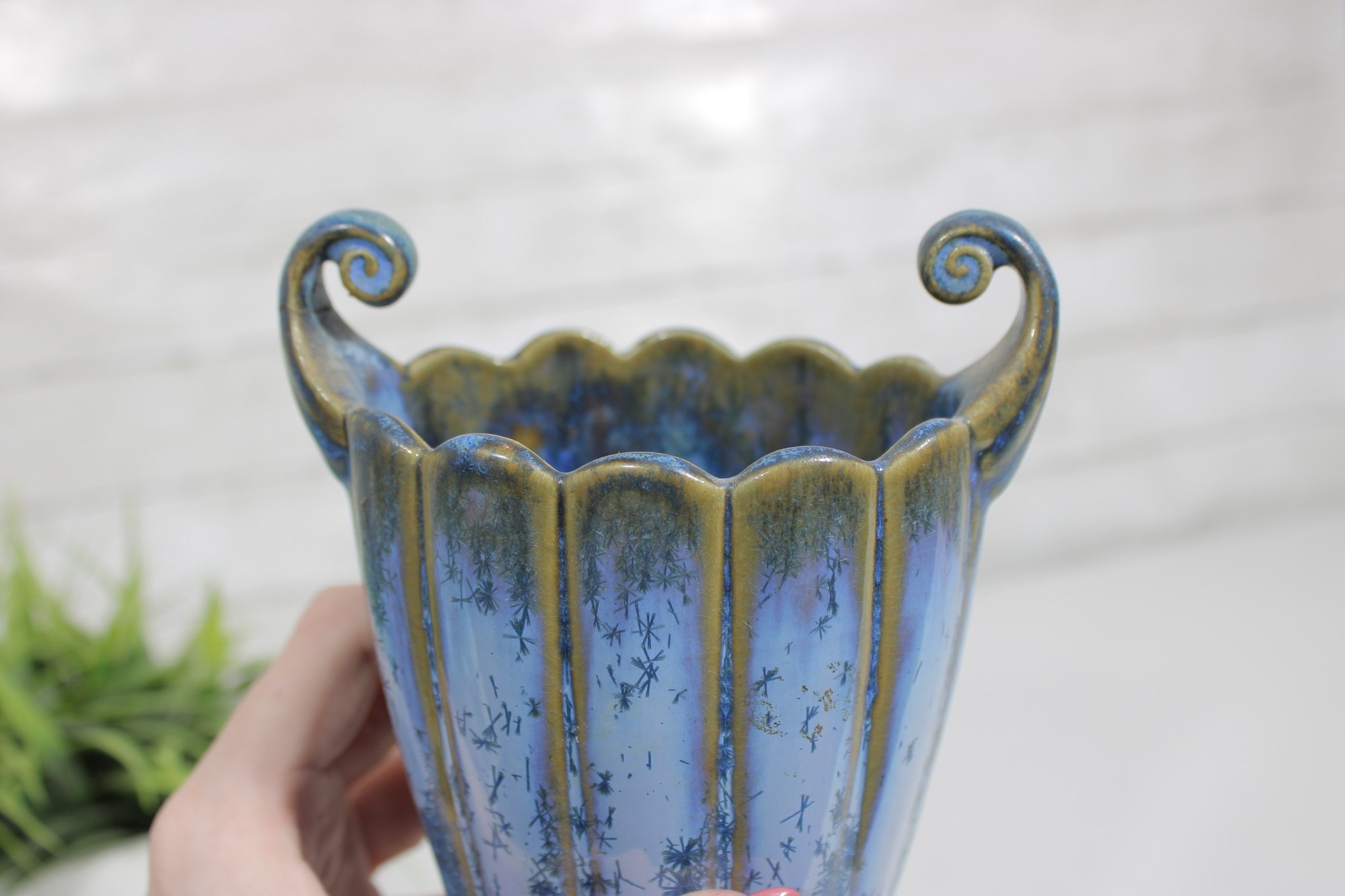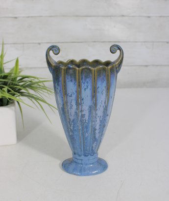 Beautiful antique Fulper pottery vase showcasing classic Art Nouveau design with elegant form and rich flambe glaze. This striking piece stands approximately 8.5 inches tall and features a softly flared, ribbed body with a scalloped rim and distinctive curled handles on each side.