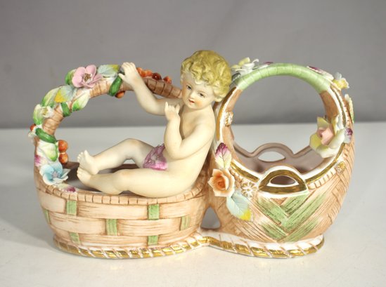 antique German porcelain figurine, featuring a beautifully crafted cherub reclining in a woven-style basket adorned with delicate floral appliqués. This exquisite piece showcases hand-painted details, with soft pastel hues, gilded accents, and intricate craftsmanship reminiscent of 19th-century Meissen or Dresden porcelain.