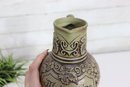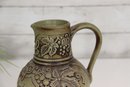 Charming antique German relief decorated wine pitcher / jug measuring approx. 7.5” tall. Beautiful raised grapevine and leaf motif around the body with German script panel on the front. Traditional salt glaze style finish in earthy tan / brown tones.