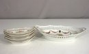antique German porcelain serving set includes one large reticulated dish (9.5" x 6") and four matching smaller dishes (5" x 3"), each featuring delicate floral garlands, gold trim, and an intricate pierced lattice design. The larger dish showcases a beautifully detailed romantic 18th-century couple scene at the center, surrounded by colorful flowers.