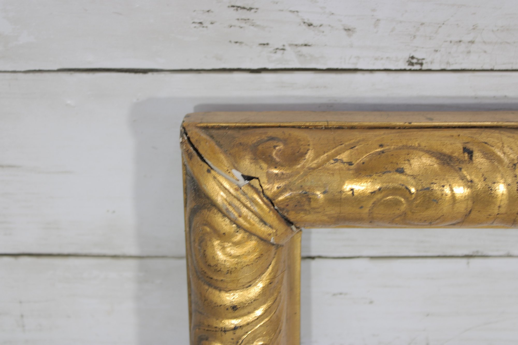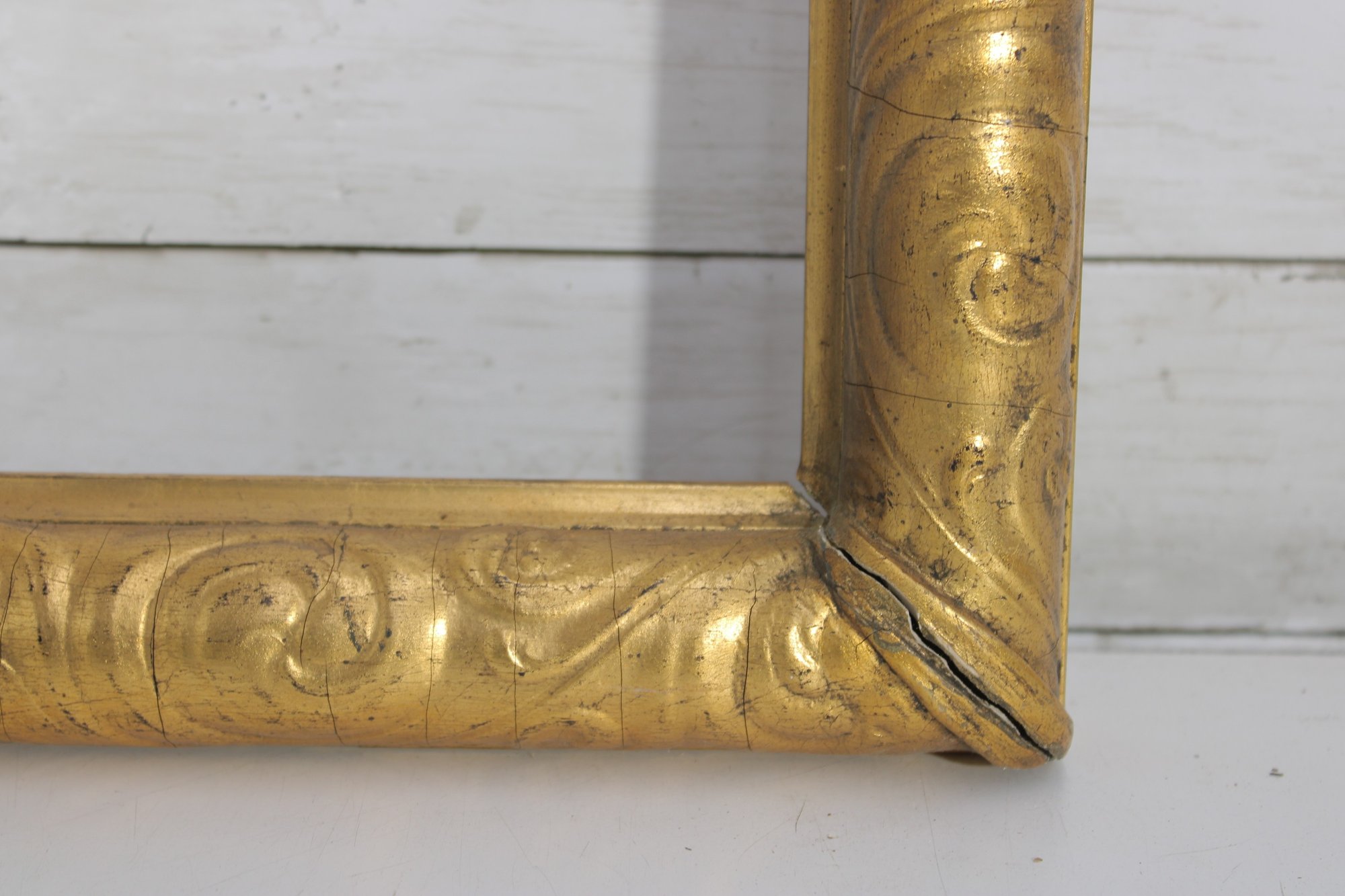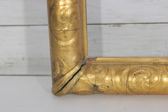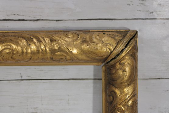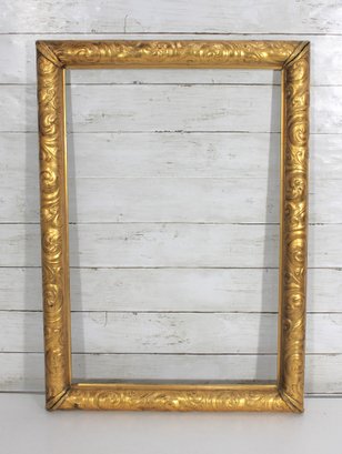 A classic antique gilt wood picture frame featuring an elegant scroll and foliate molded profile with a warm, aged gold finish. The hand-carved detailing and original gesso surface reflect traditional craftsmanship, making this frame an excellent candidate for restoration, reuse, or decorative display.