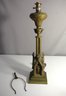An exquisite antique brass table lamp with intricate Gothic Revival detailing. The lamp features ornate architectural elements, including columns and arches, with a figure housed within each arch. The base has a rich patina, enhancing the lamp's historical charm.