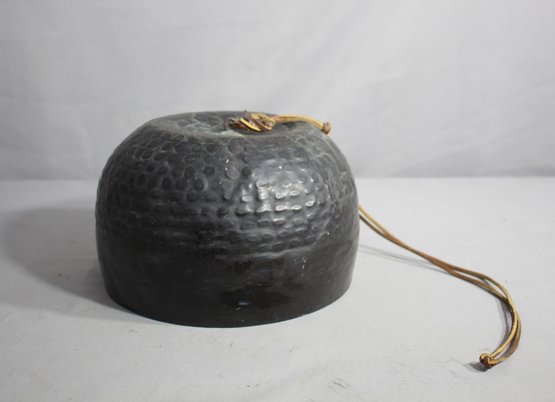 The bell boasts a distinctive hammered surface, showcasing the traditional techniques employed in ancient Chinese metalwork. This piece is characterized by a deep, rich patina, suggesting considerable age and authentic heritage. Such bells were historically significant in Chinese culture, serving both spiritual and practical purposes in temples and civic life.