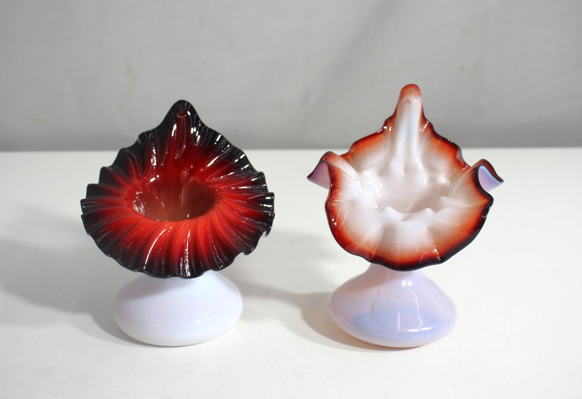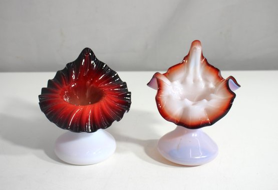 pair of antique hand-blown art glass vases, measuring approximately 5" and 5.5" in height. These exquisite pieces showcase a beautiful cranberry opalescent color gradient, transitioning into a milky white base. The ruffled edges are skillfully crafted, adding an elegant and unique touch to each vase.