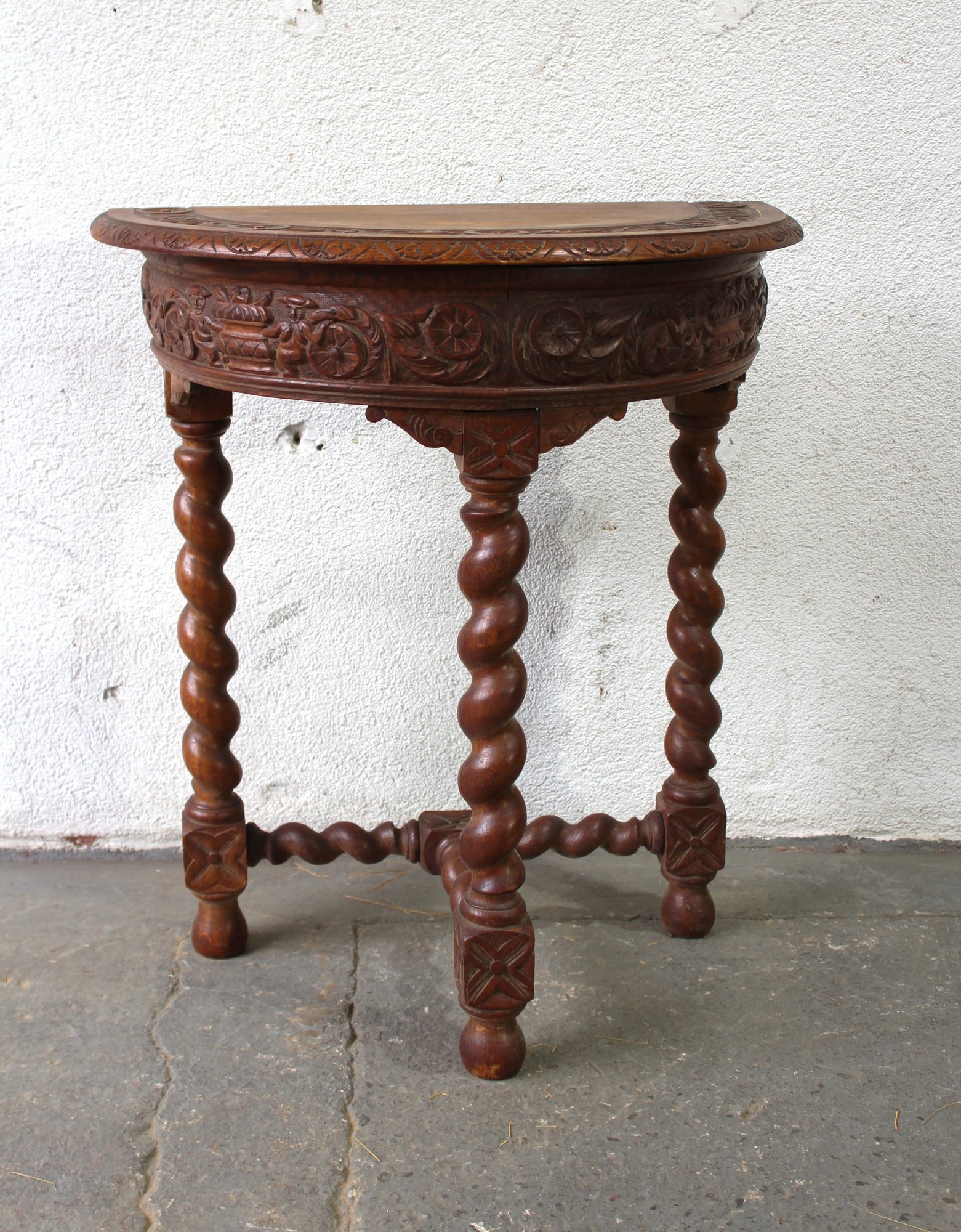 This antique half-moon side table boasts beautiful hand-carved detailing around the apron and features striking barley twist legs. The intricate carvings on the tabletop’s border and skirt showcase floral motifs and scrollwork, highlighting the craftsmanship and elegant design of the piece. The rounded demi-lune shape allows for versatile placement against a wall or as a standalone accent.