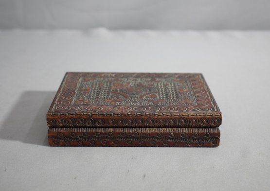 The box is meticulously adorned with deep, intricate carvings, featuring traditional motifs that suggest its rich cultural origin. The detail in the carvings demonstrates a masterful artisanship, with each curve and contour thoughtfully executed to create a harmonious visual effect. The swirling patterns and motifs envelop the box