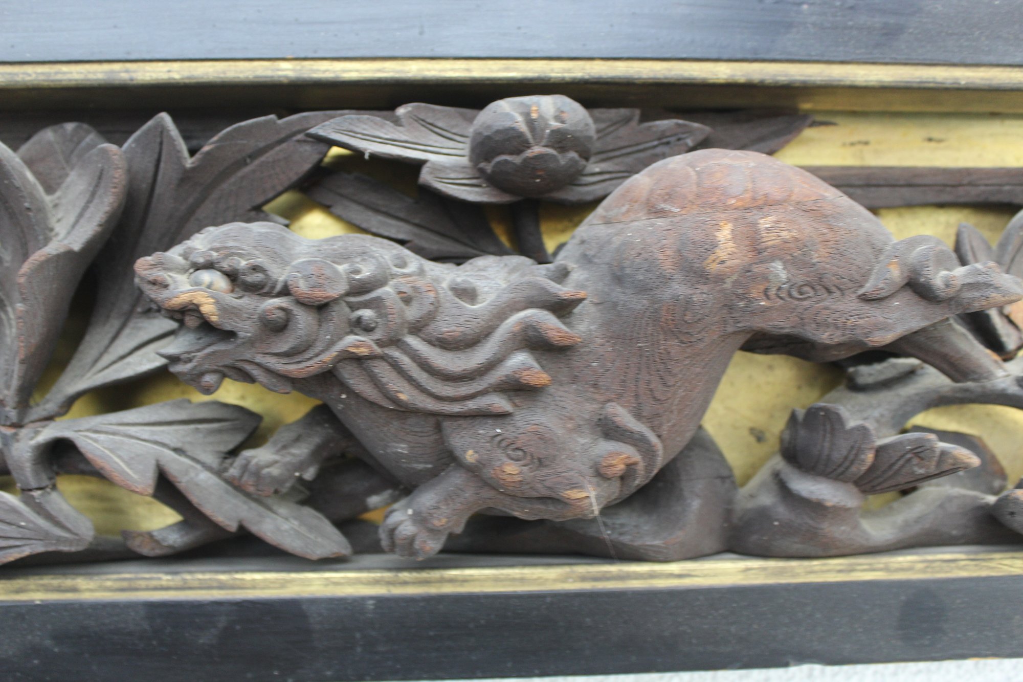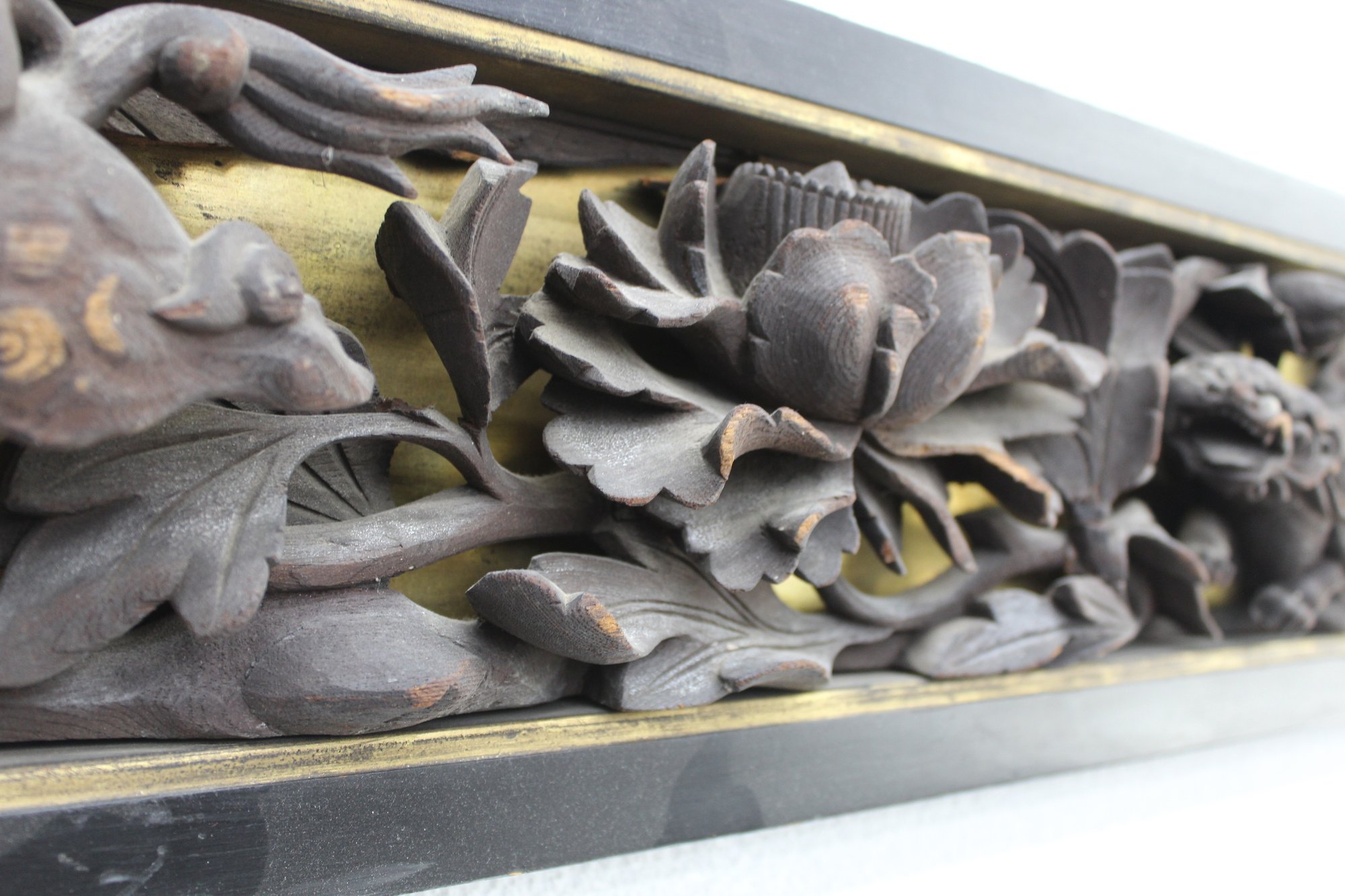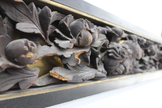This impressive antique hand-carved wooden panel is a stunning piece of craftsmanship. Measuring 8.5 inches high by 55 inches wide, it features intricate floral carvings alongside a detailed depiction of a mythical creature, adding depth and character to its design. The panel is accented with a subtle gold background, enhancing the artistry of the dark wood carvings.