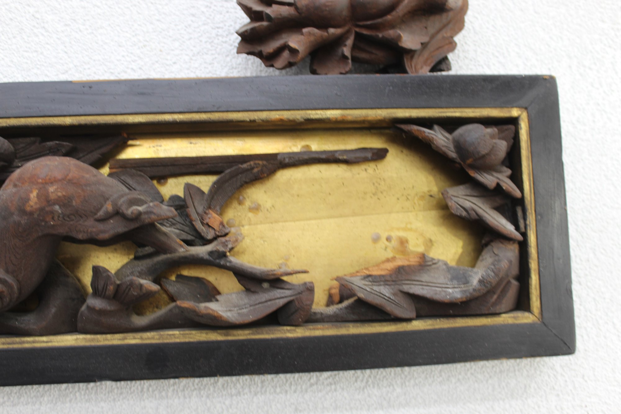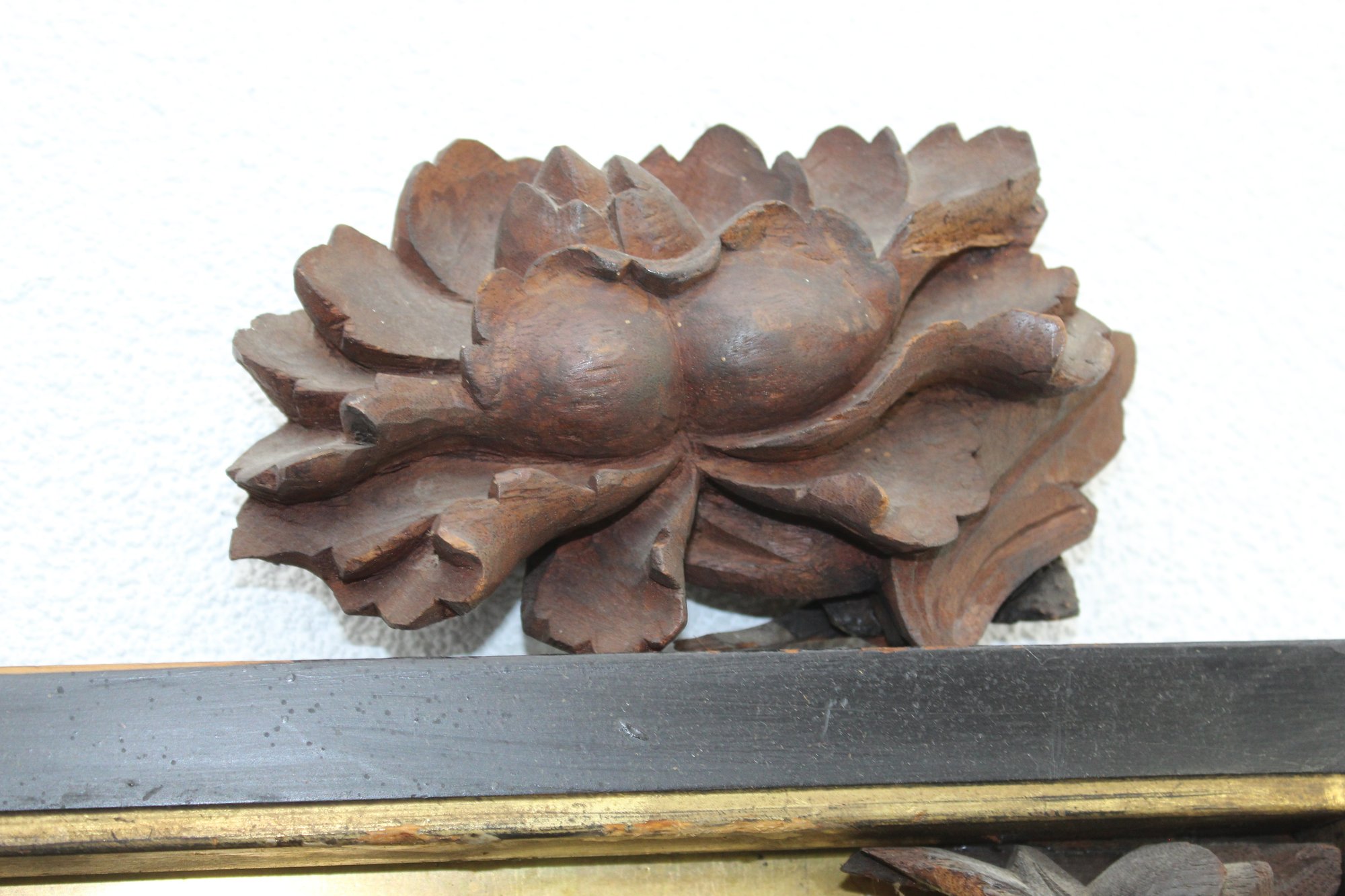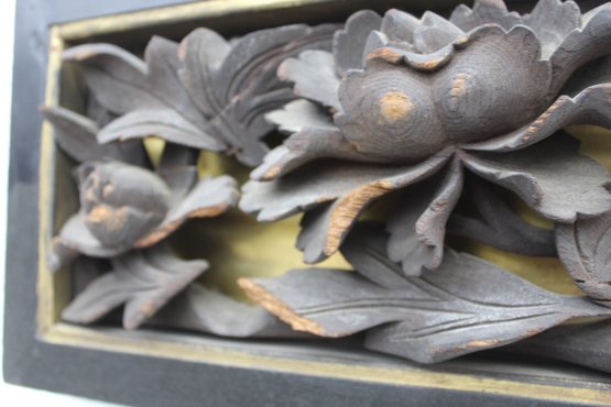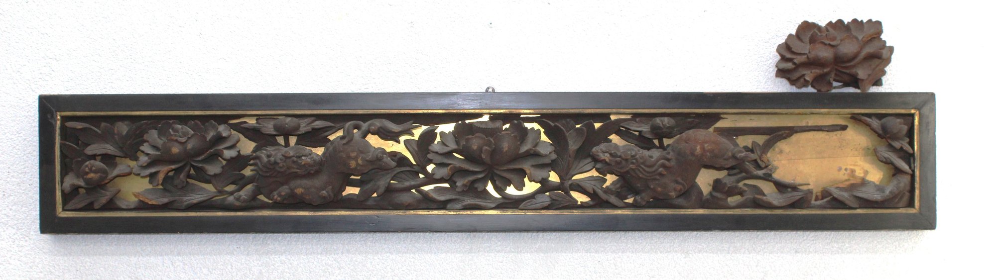 This impressive antique hand-carved wooden panel is a stunning piece of craftsmanship. Measuring 8.5 inches high by 55 inches wide, it features intricate floral carvings alongside a detailed depiction of a mythical creature, adding depth and character to its design. The panel is accented with a subtle gold background, enhancing the artistry of the dark wood carvings.